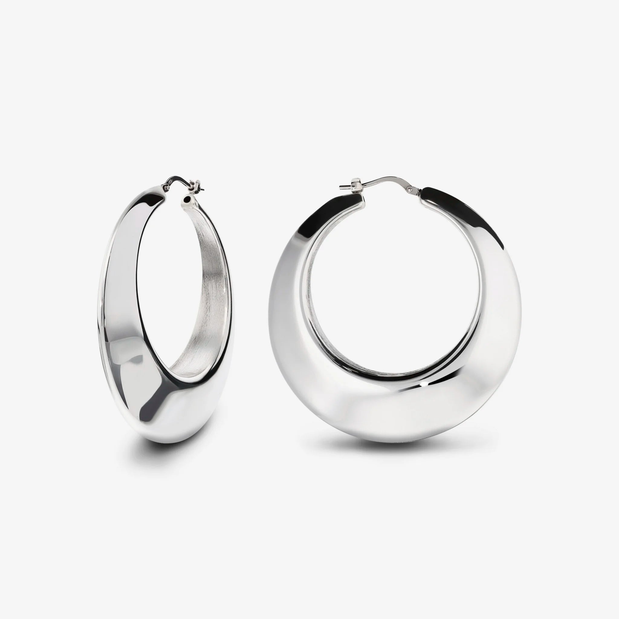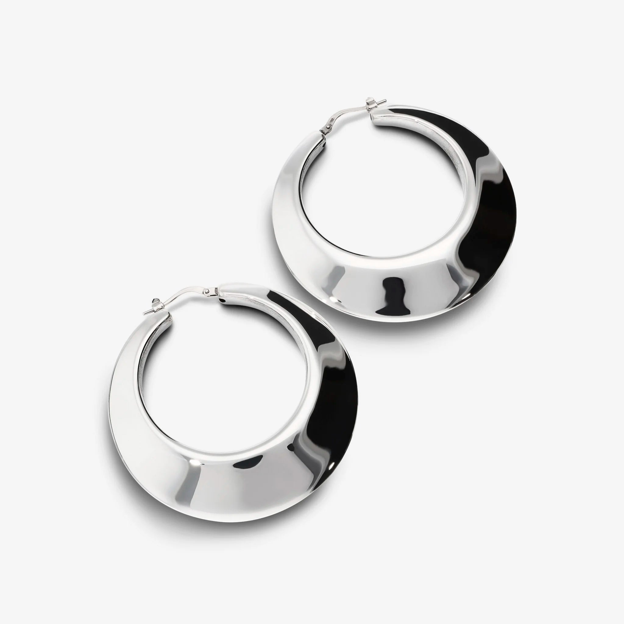 Graduated electroformed hoop earrings in platinum-plated 925 silver. Mirror polished surface. Bayonet closure. External diameter 5 cm.
