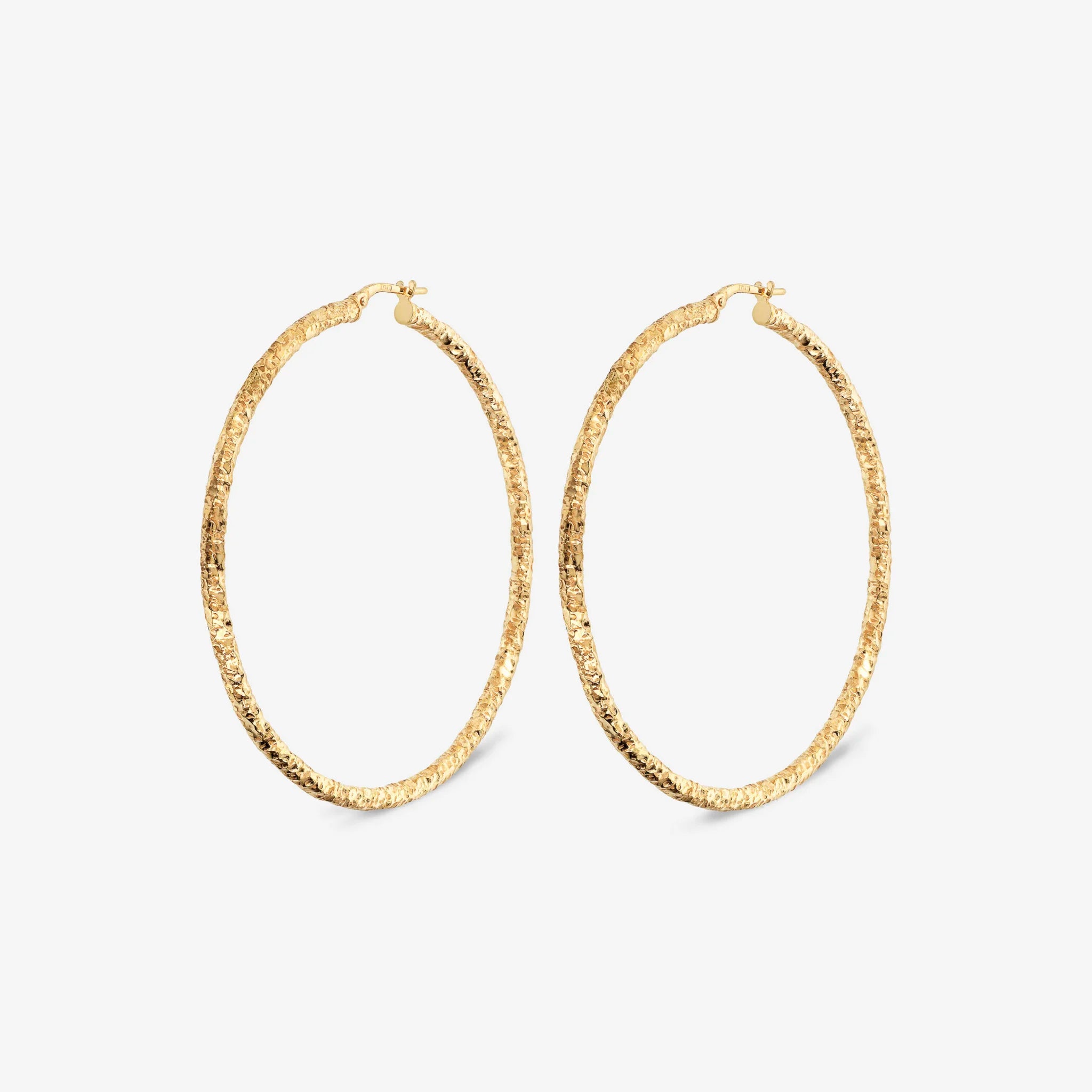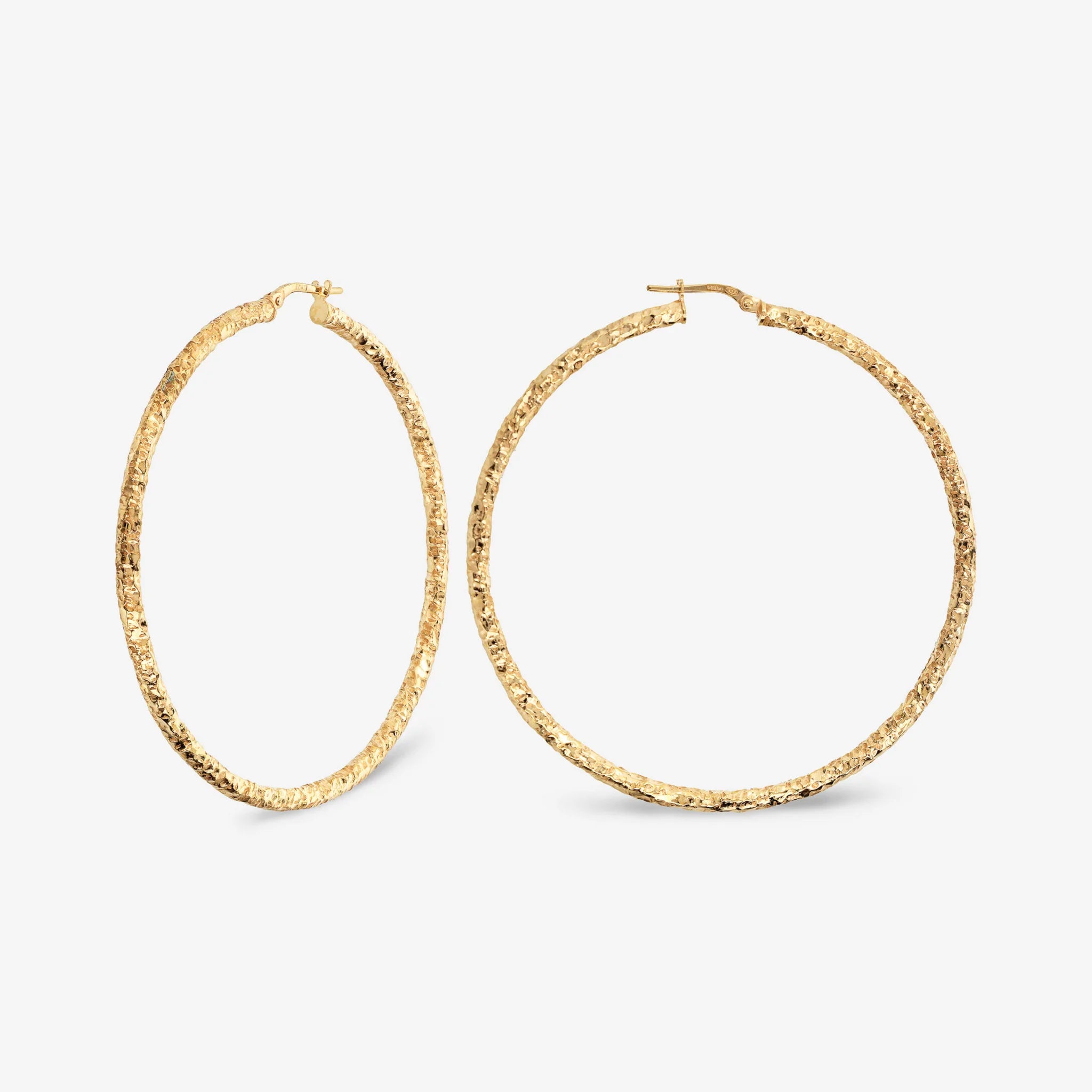 Hoop earrings in 18kt yellow gold plated 925 silver with worked surface. External diameter 5.5 cm. Bayonet closure.