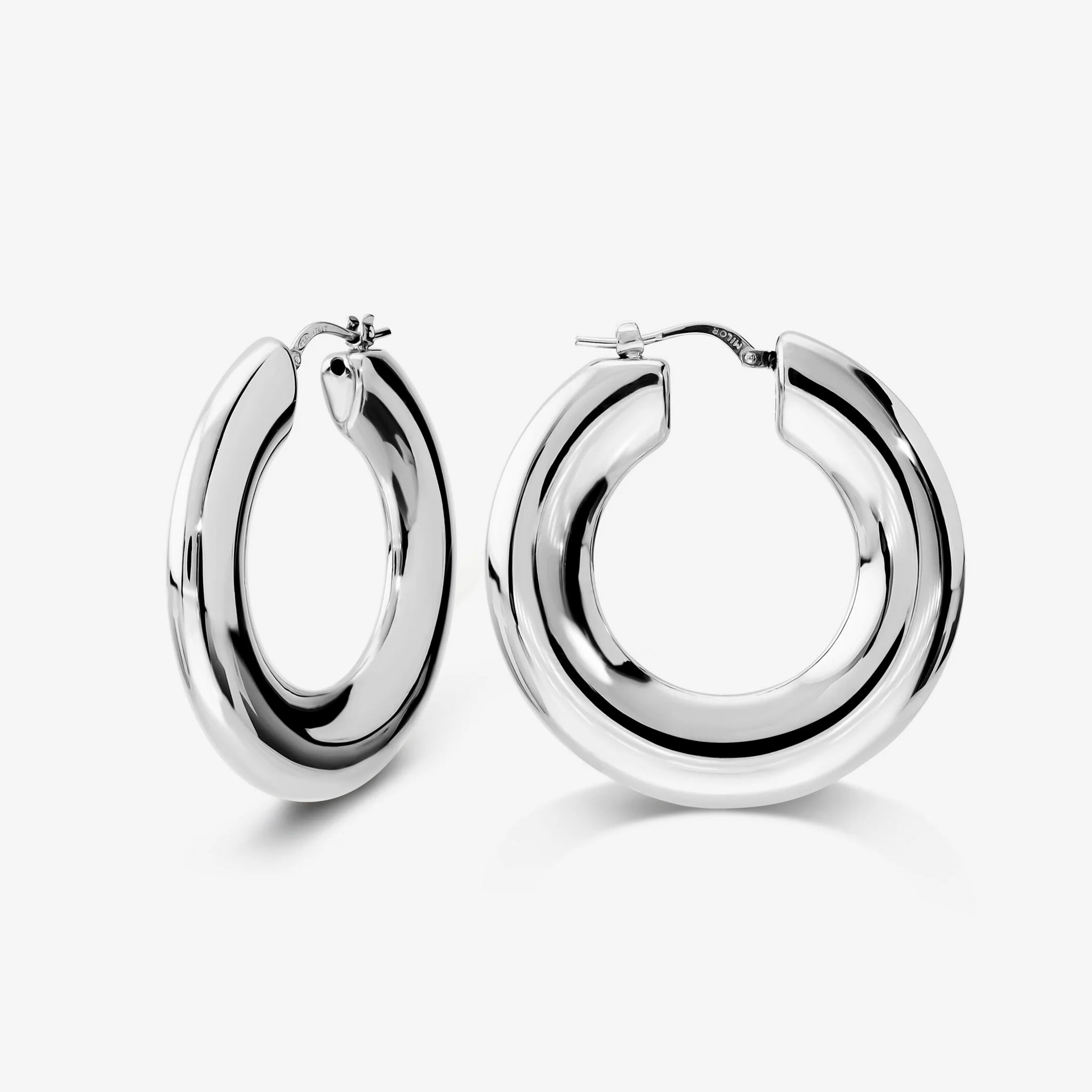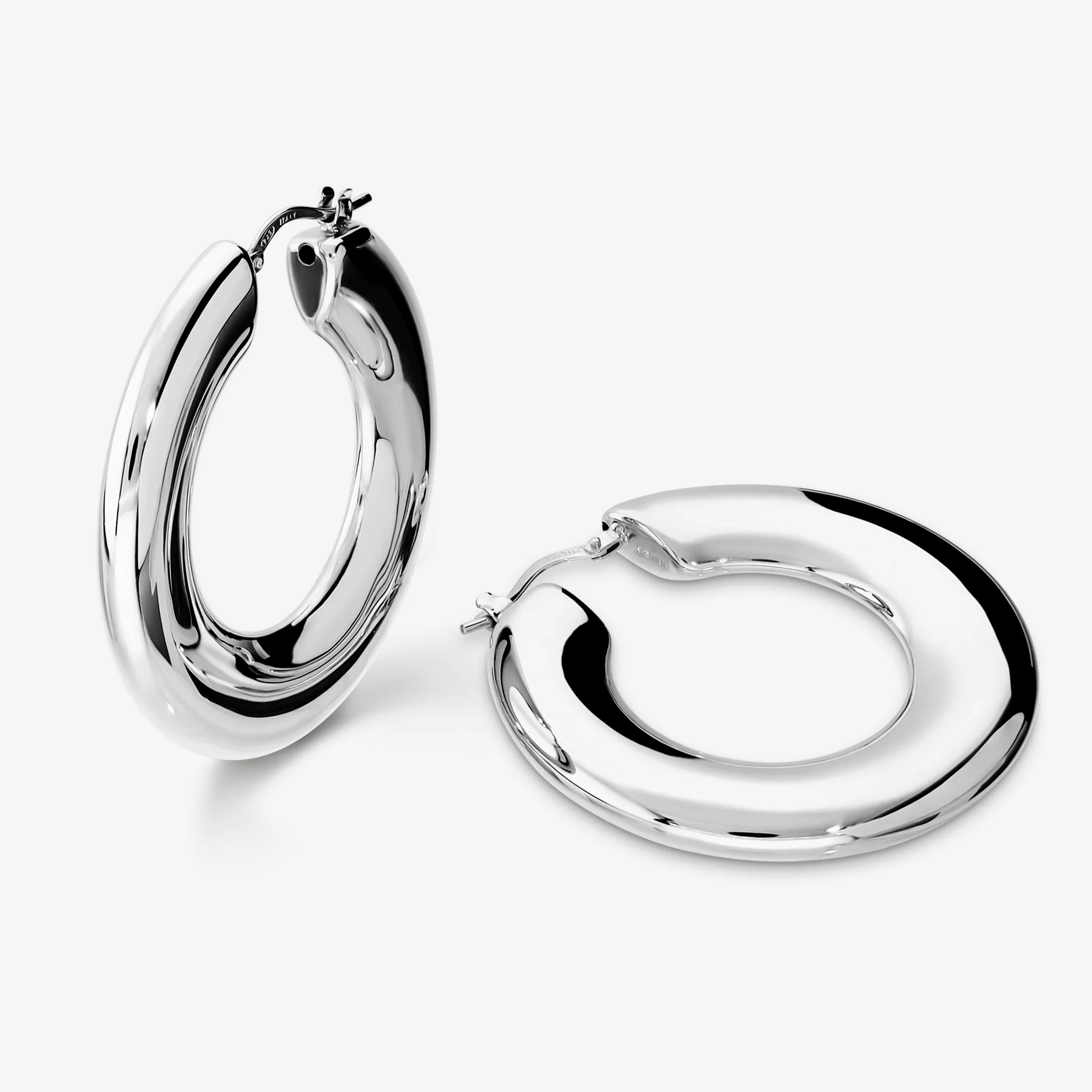 Orecchini a cerchio in Argento 925 placcato Platino. Finitura lucida. Chiusura a baionetta. Diametro esterno 4cm. Larghezza superficie 5mm.