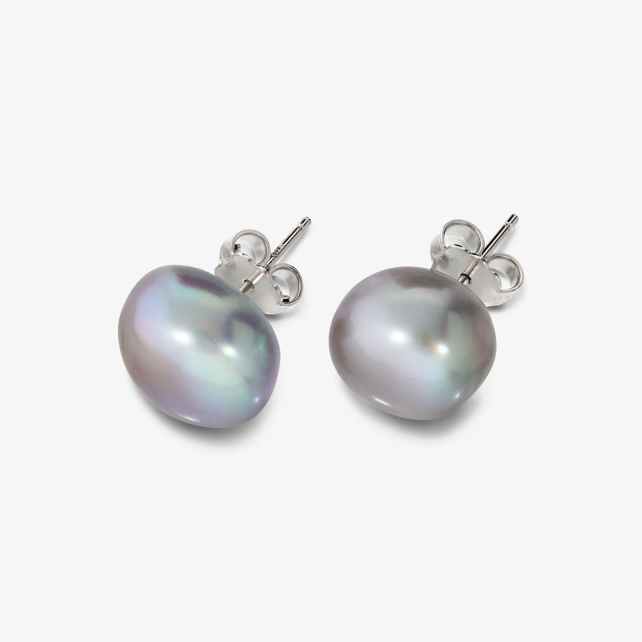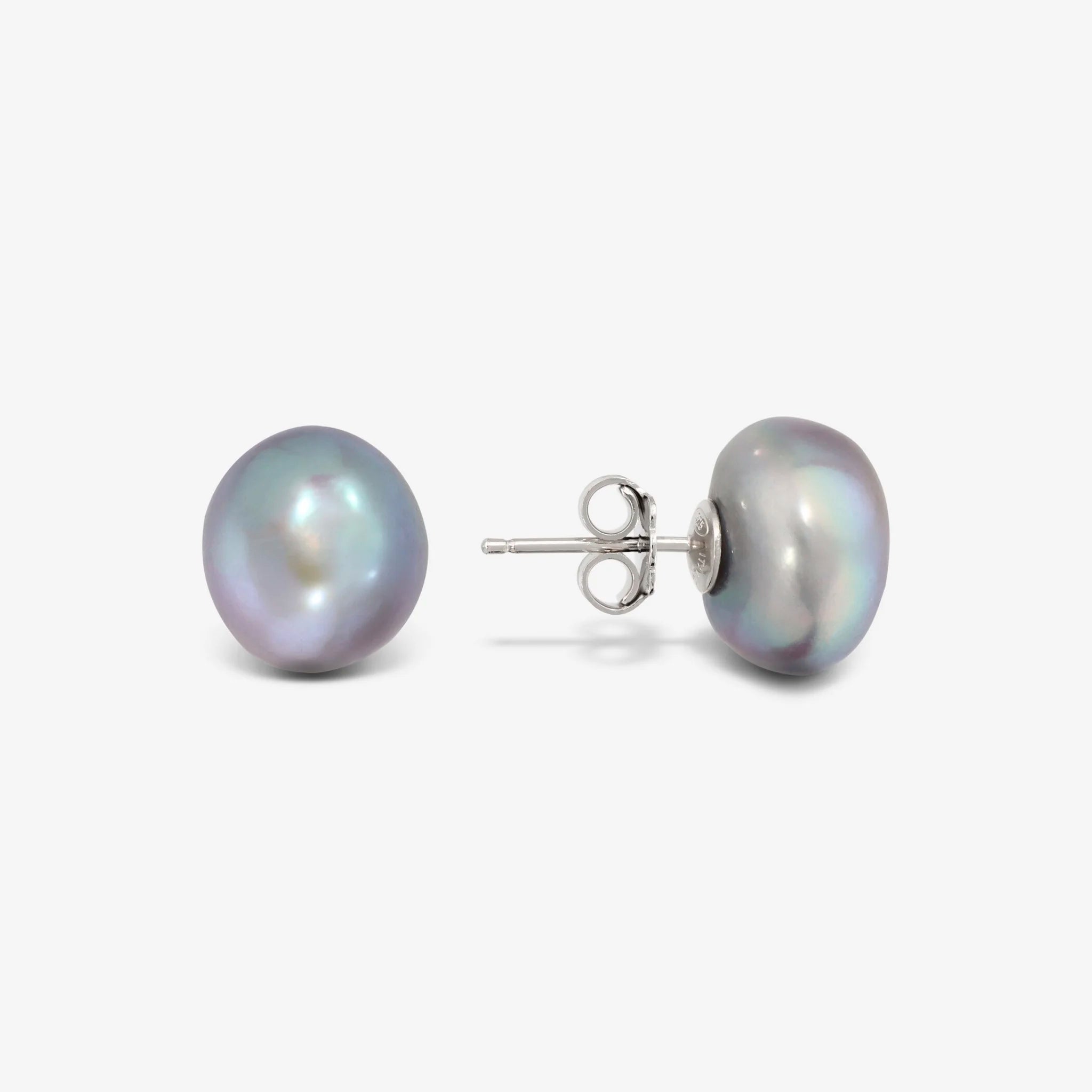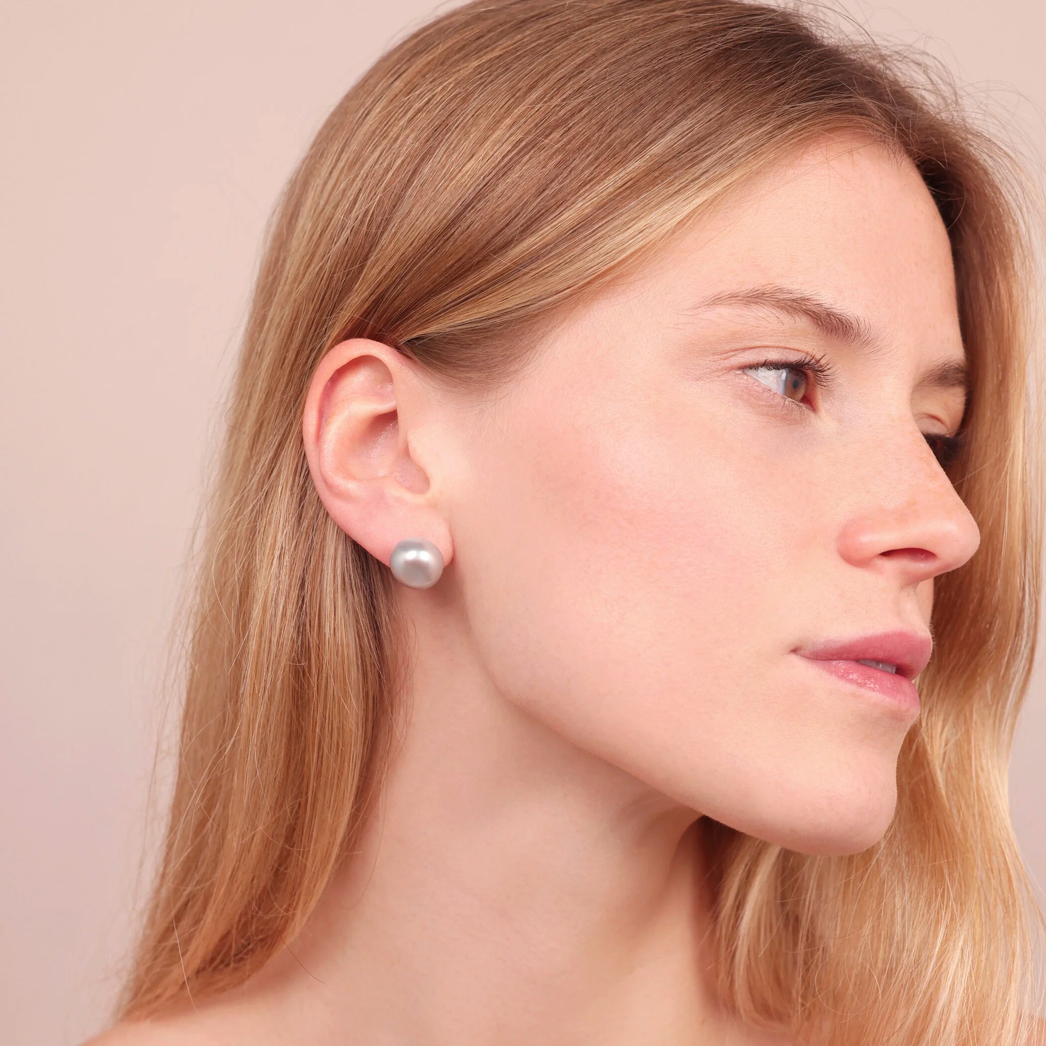 Button earrings in 925 Silver plated with 18kt white Gold with white freshwater cultured button pearls about 12 mm in diameter. Post and butterfly clasp.