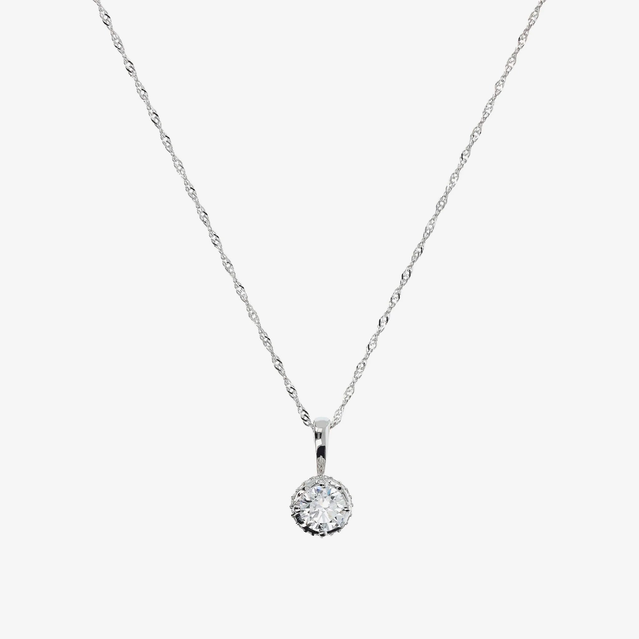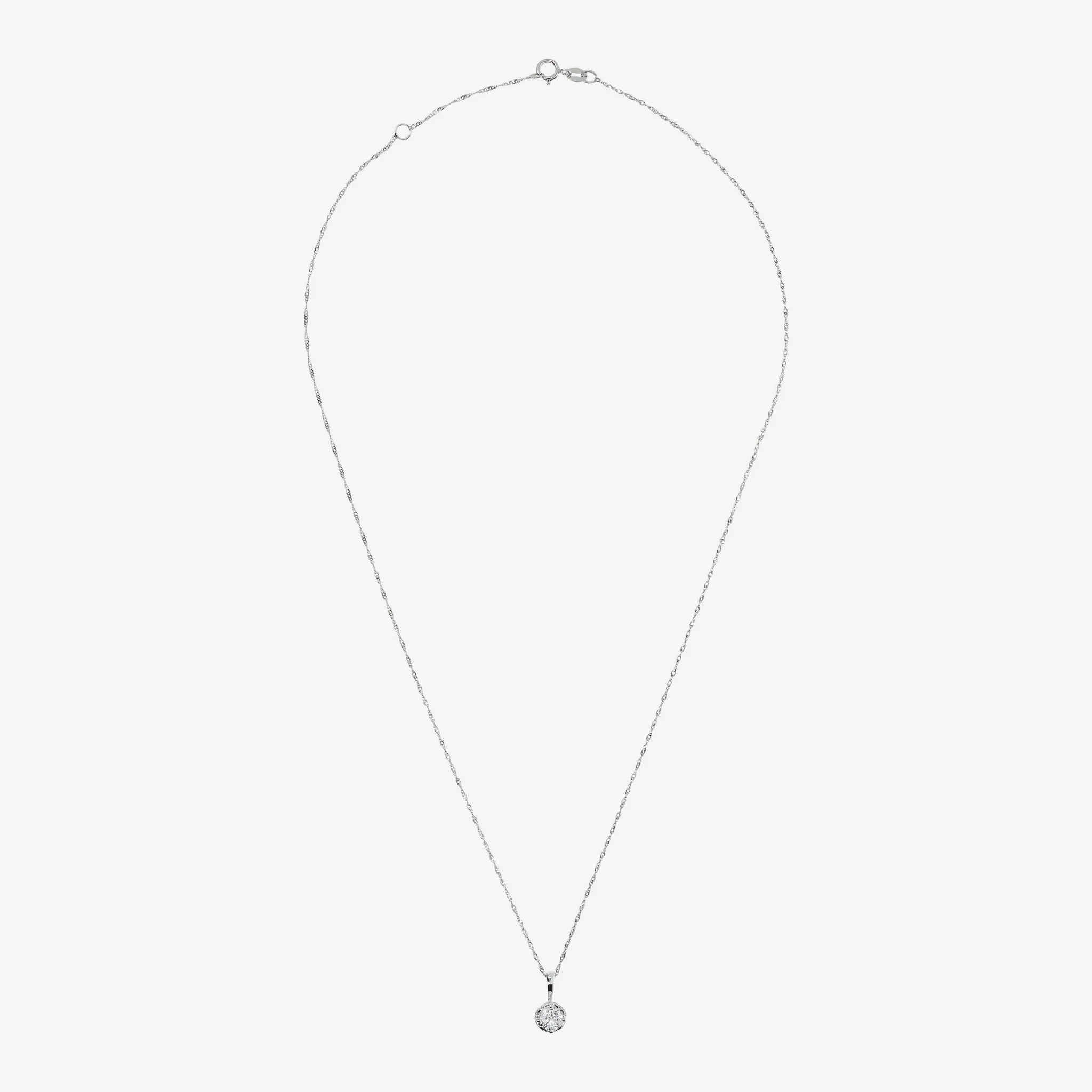 Singapore link necklace in 375/1000 white gold with lab grown diamond light point pendant positioned on a round base embellished with pavé of lab grown diamonds (total weight 051ct). Round four prong frame. Length 45 cm with ring placed at 42 cm. Lobster clasp closure.