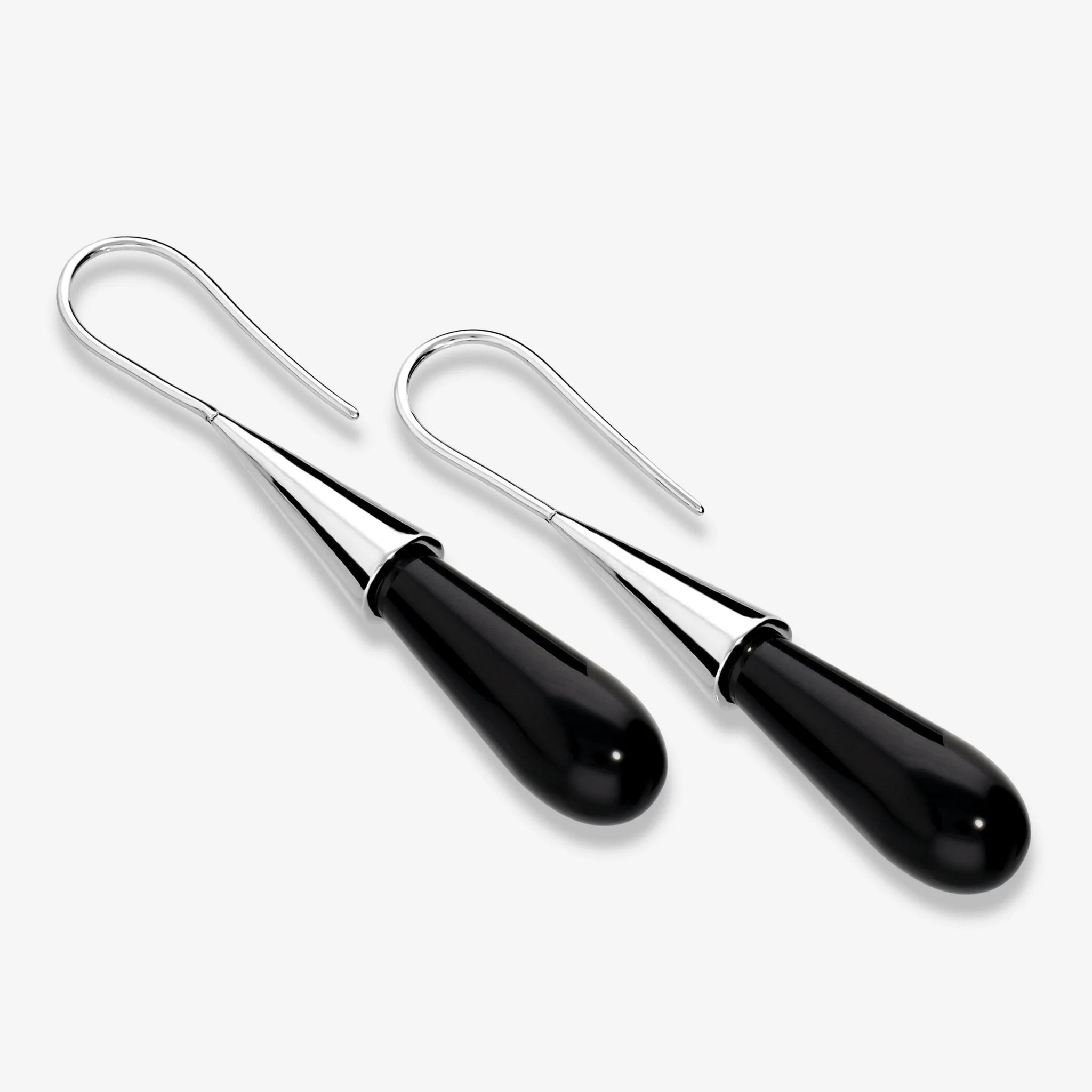 Orecchini pendenti in Argento 925 placcato Platino con elemento a goccia in pietra naturale di onice nero (22x8 mm). Finitura lucida. Chiusura ad amo.