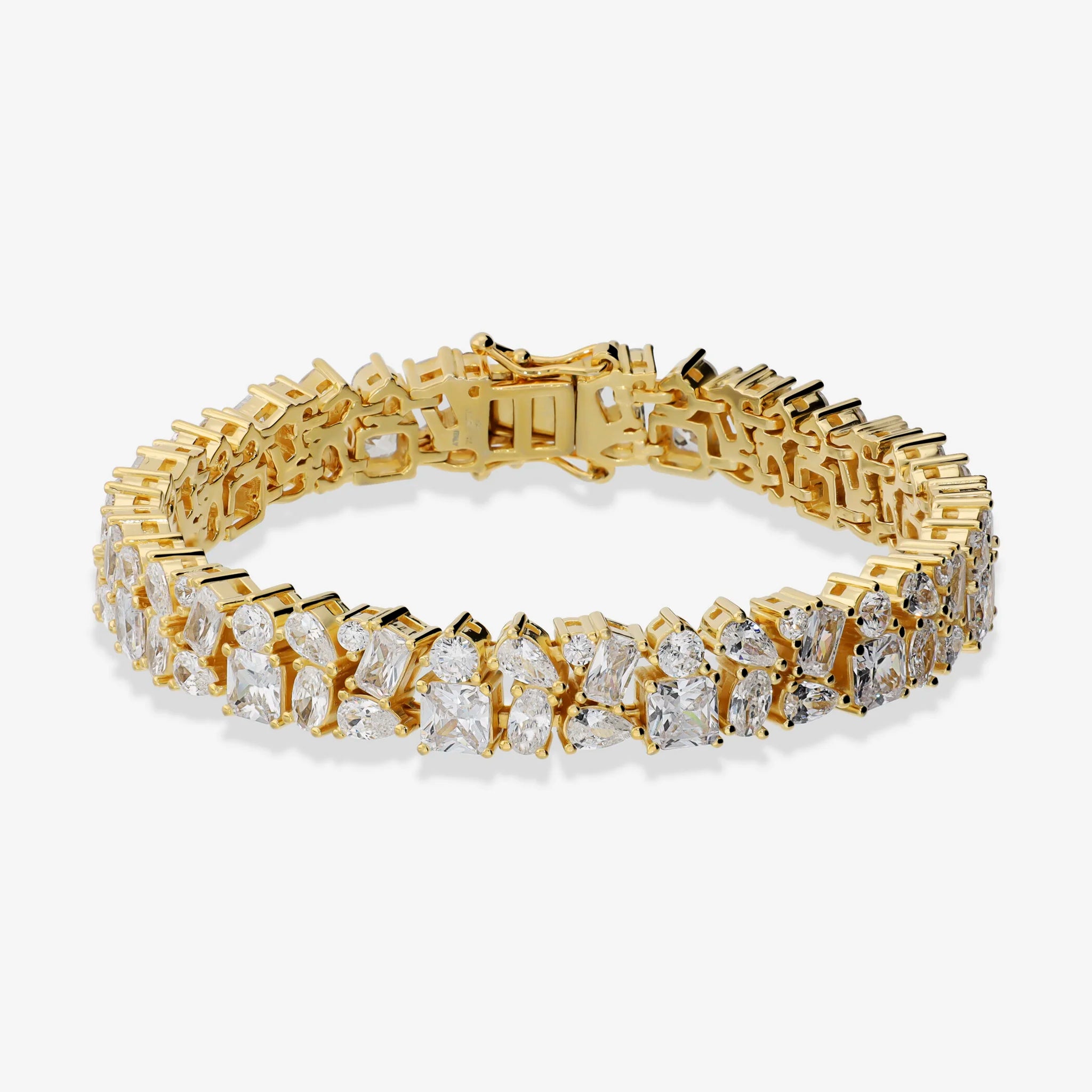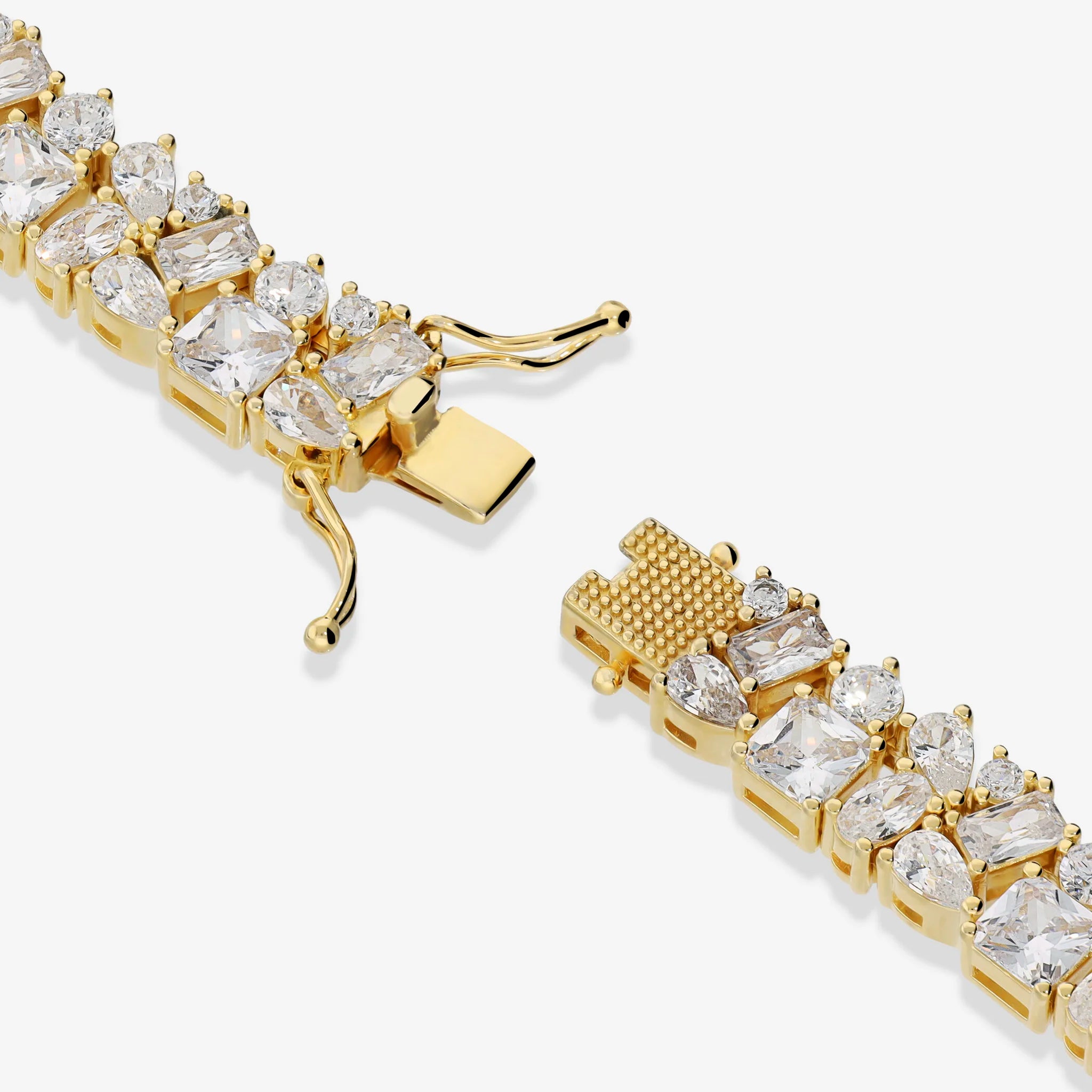 Bracciale in Argento 925, placcato Oro giallo 18kt, con pavé misto di cubic zirconia, qualità 'Luminosa', pari a 20.75ct. Tagli tondo, quadrato, baguette, goccia e ovale. Chiusura a cassetto con due otto di sicurezza. Lunghezza 19 cm.