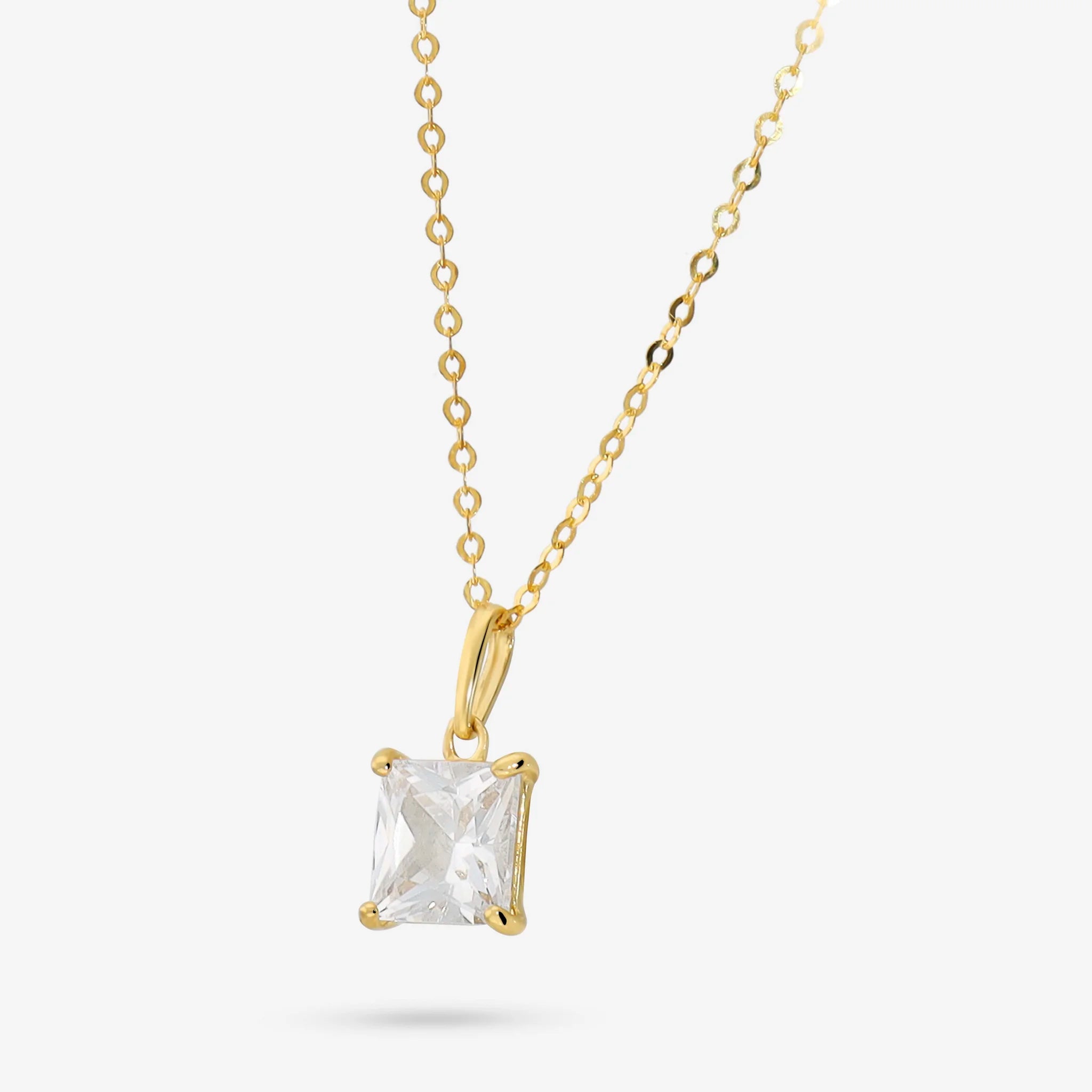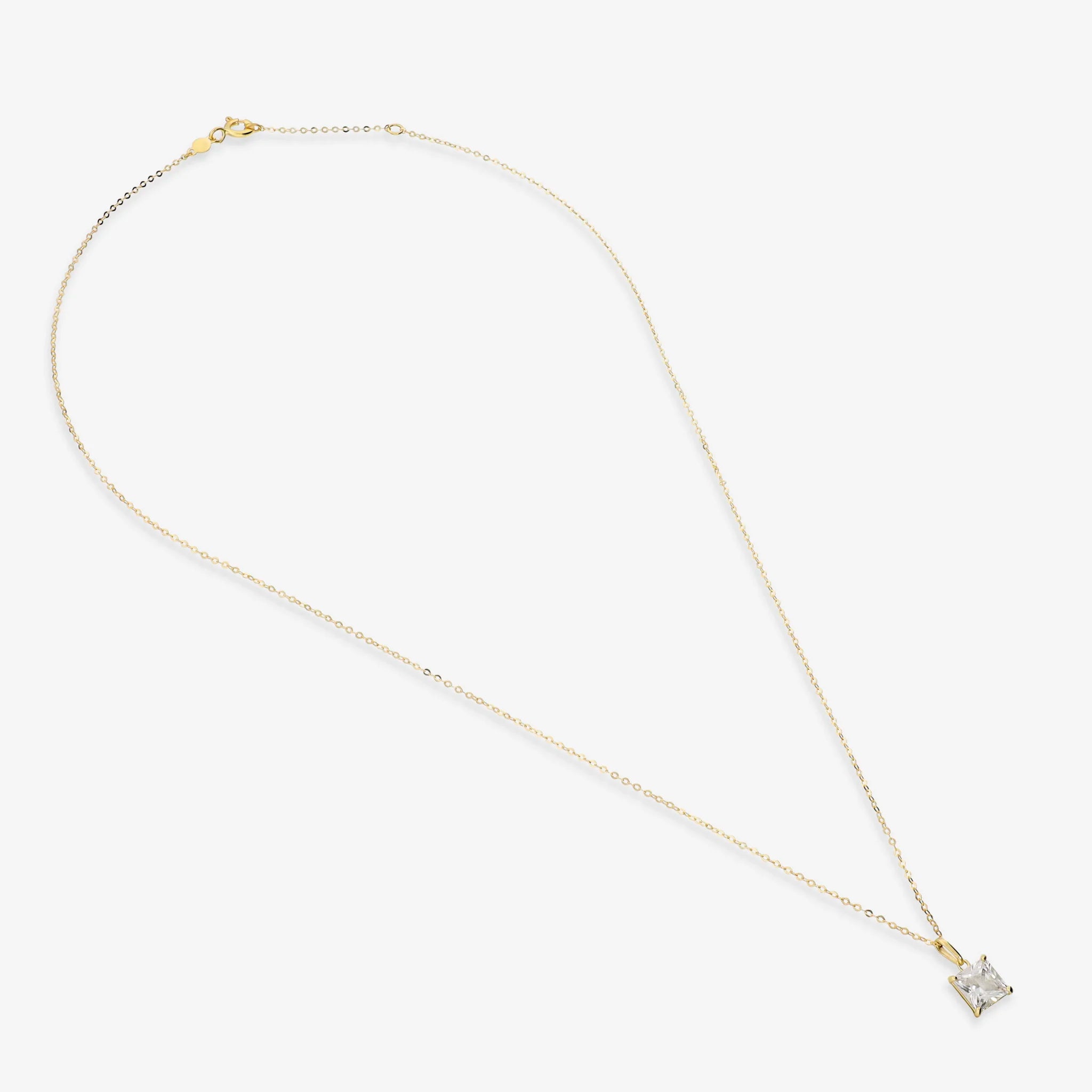 Collana girocollo in Oro giallo 14kt. Maglia brillantina diamantata con pendente in cubic zircocnia, taglio princess, pari a 1.15ct. Lunghezza 45.5 cm con anellino interposto a 43 cm. Chiusura ad anello a molla.