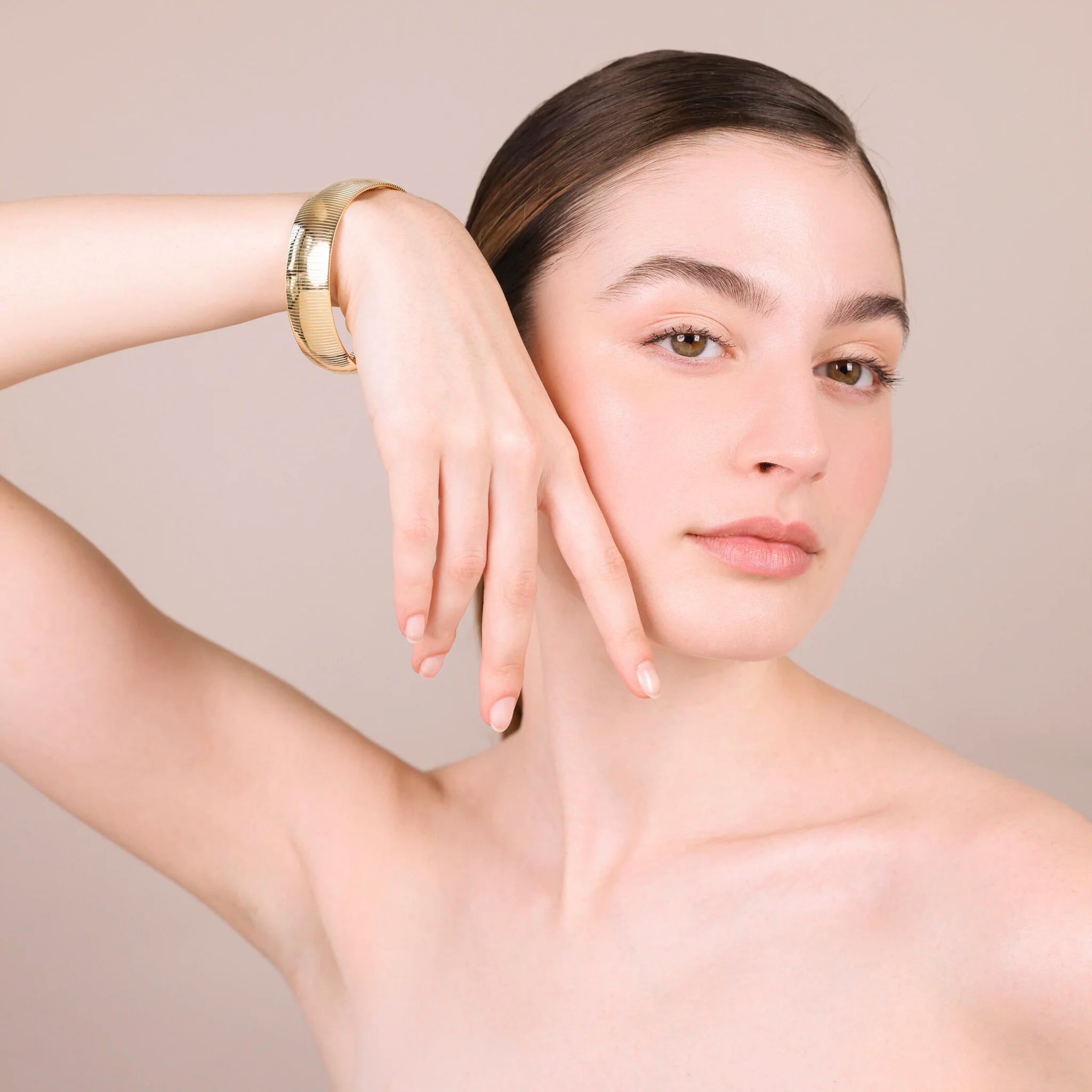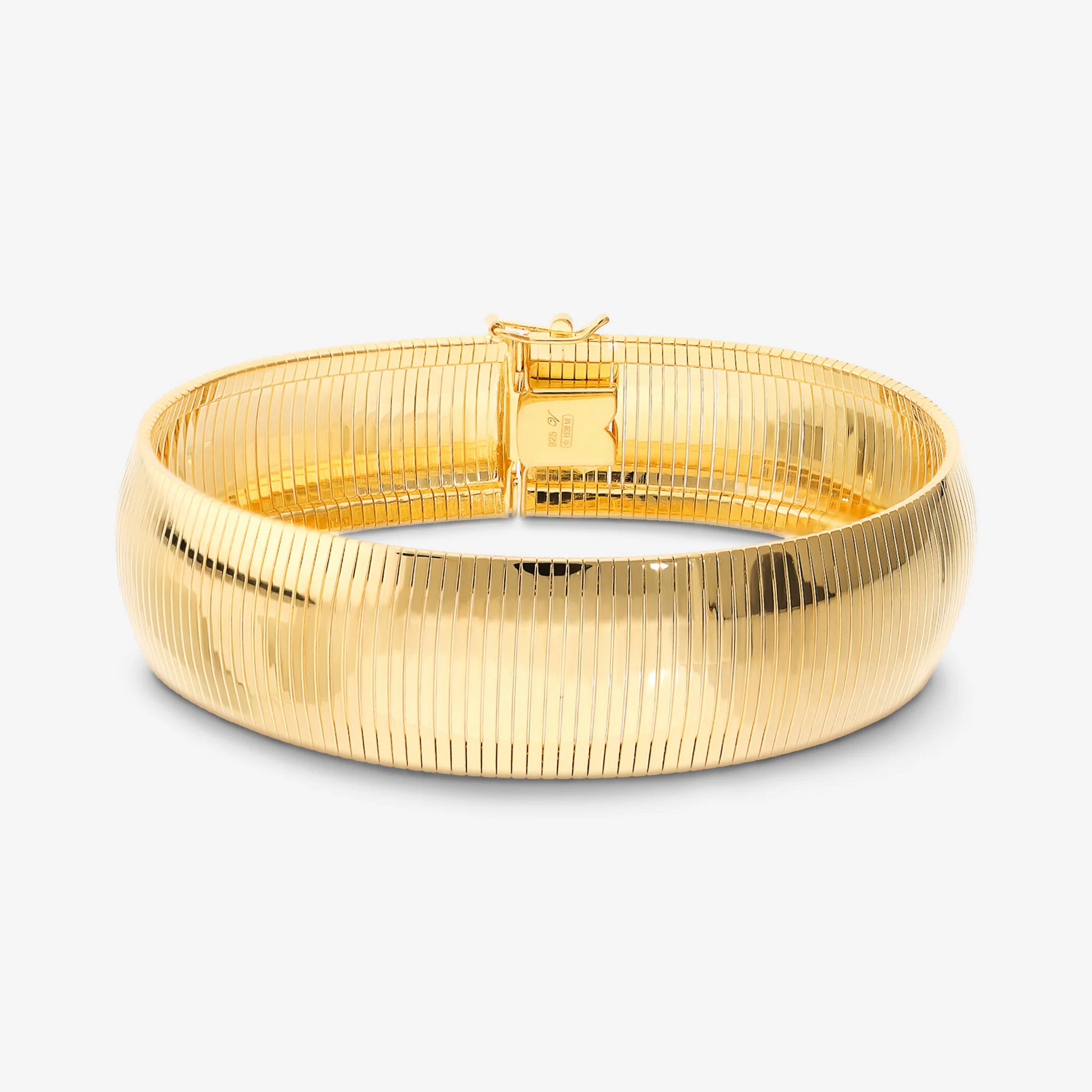 Maxi semi-rigid Omega bracelet in 18kt yellow gold plated 925 silver, slightly domed with a 3cm wide shiny surface. Length 19.5 cm. Concealed closure.