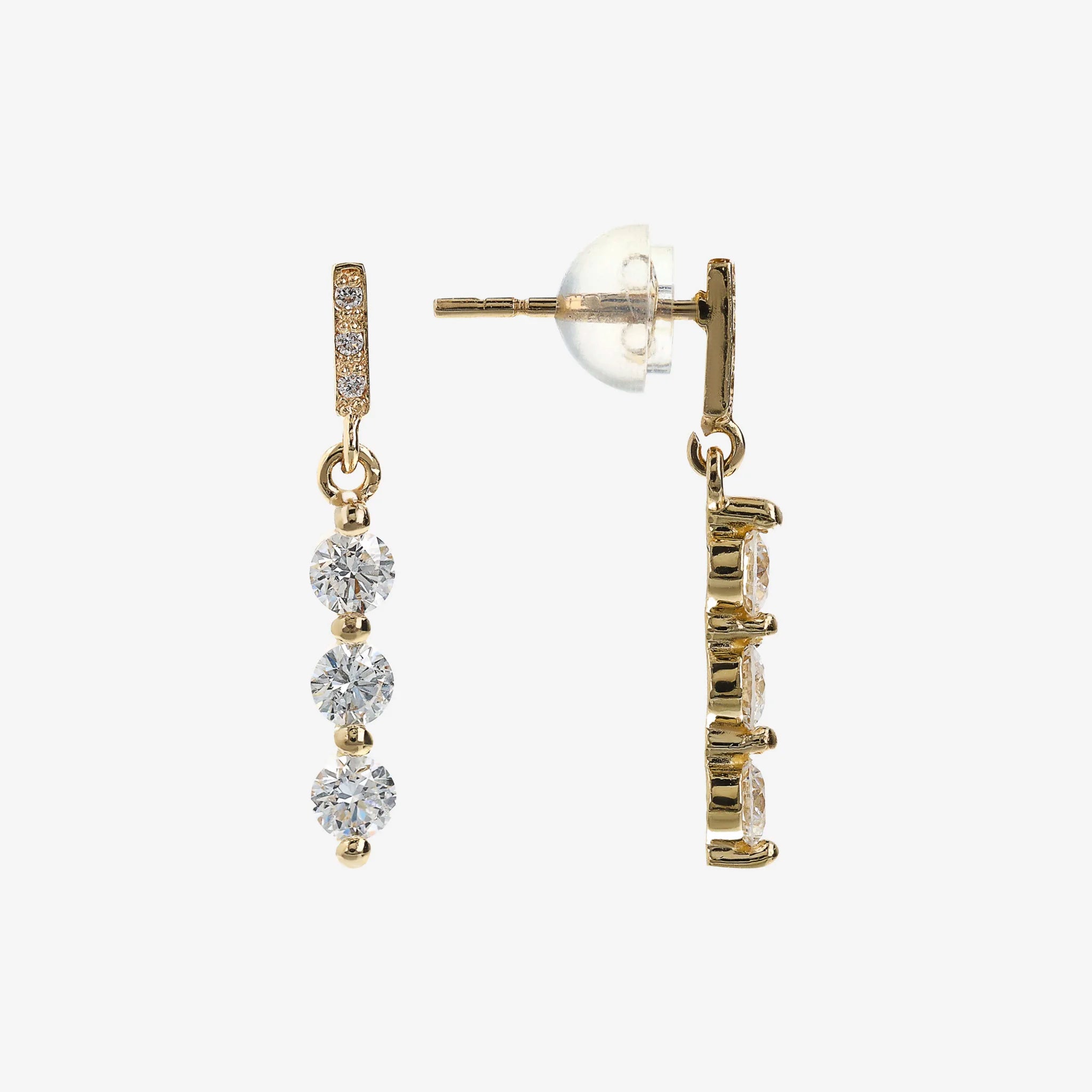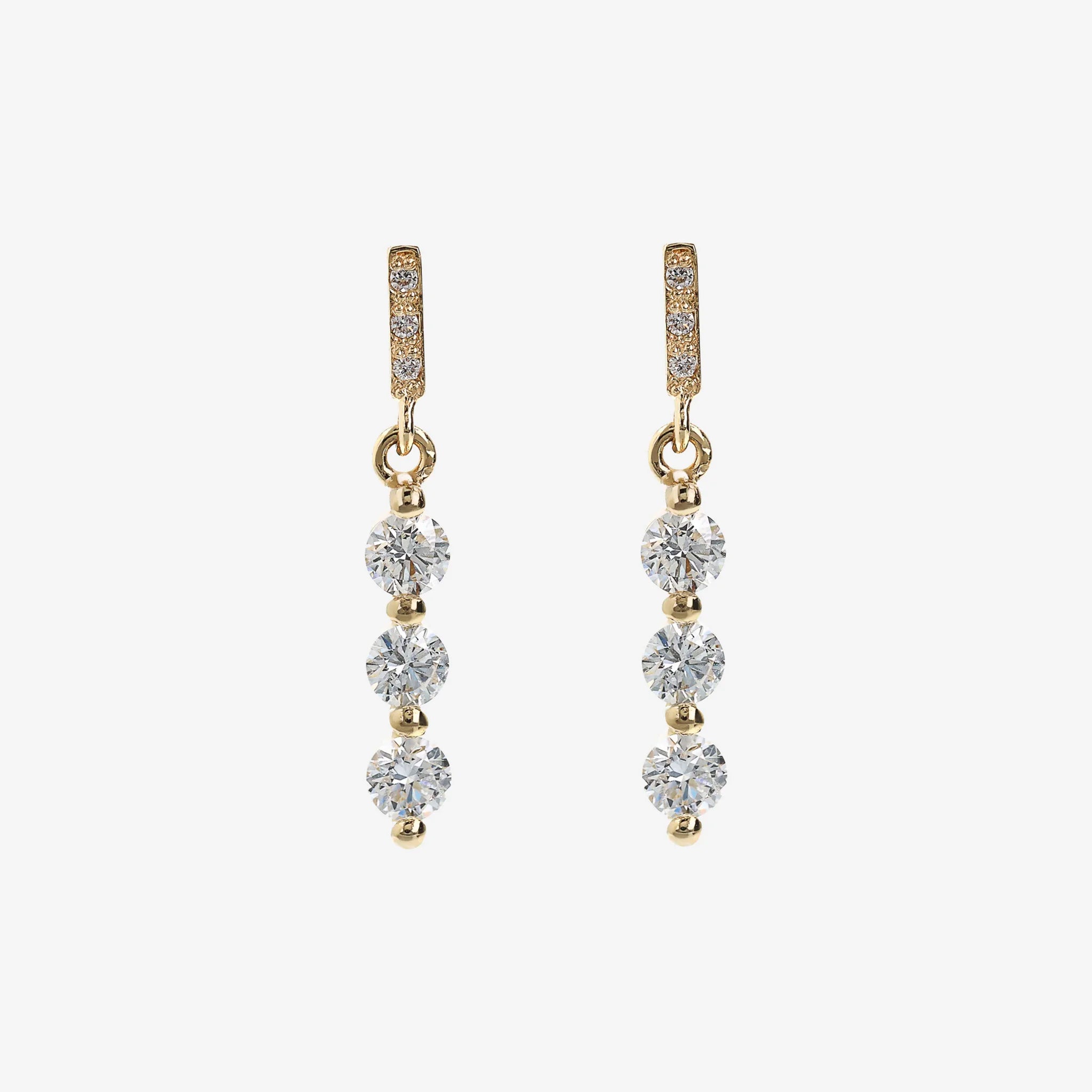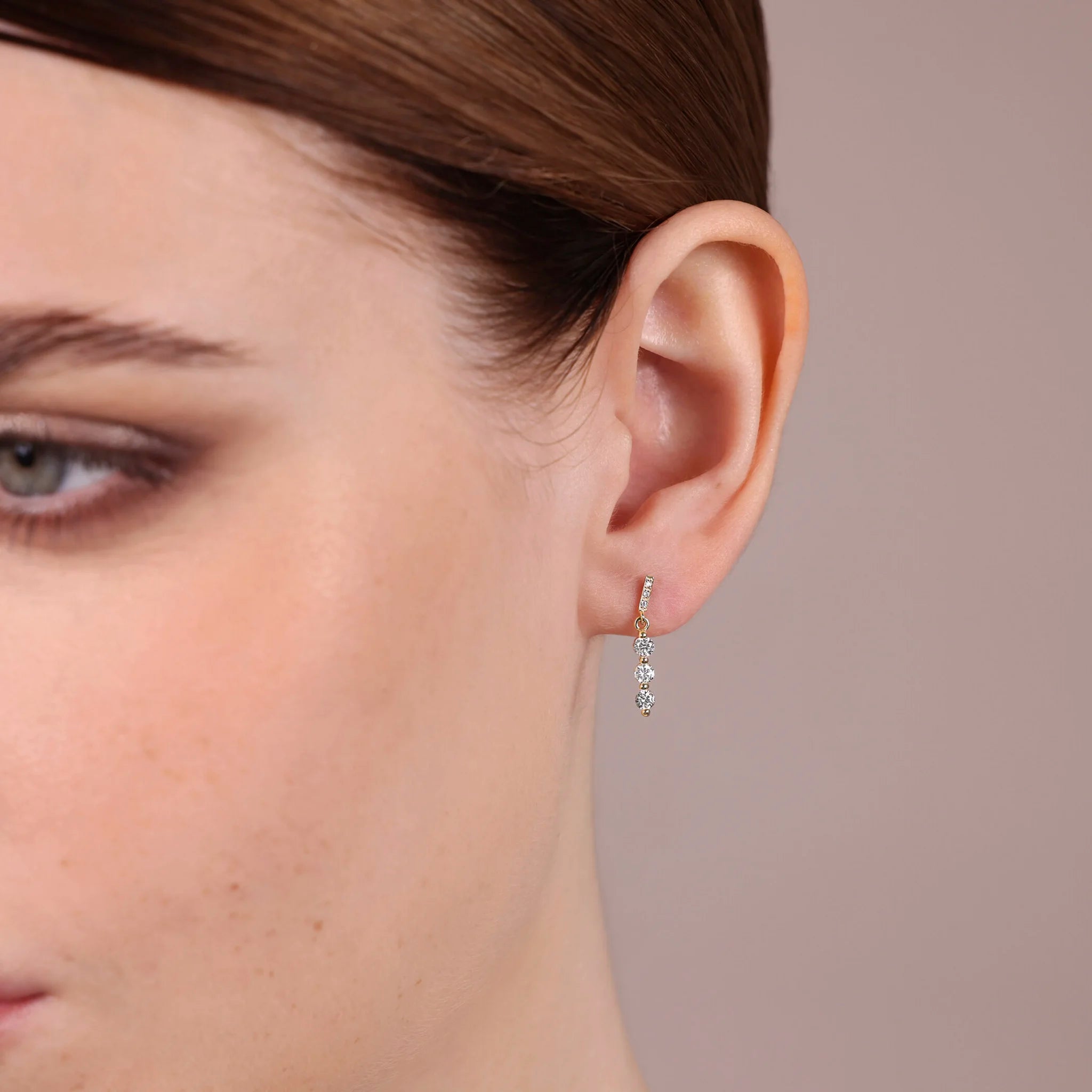 Pendant earrings in 375/1000 white gold with counter-link in pavé of lab grown diamonds from which three lab grown diamonds per earring hang (total weight 0.24ct). Round prong frame. Length 1cm. Pin and silicone closure.