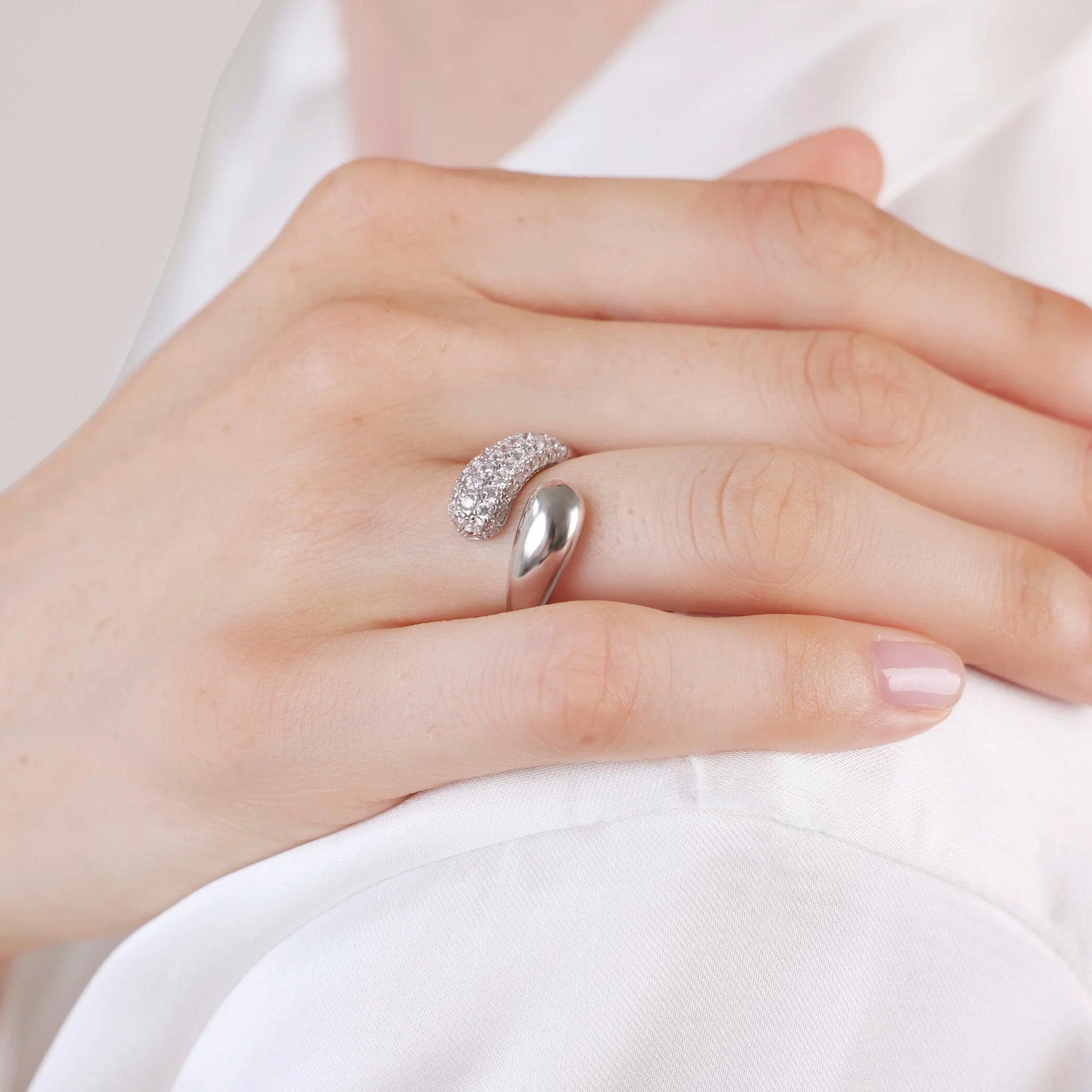 Opposite ring in 925 Silver, platinum plated, with a pavé surface of cubic zirconia, "Luminosa" quality, equivalent to 2ct.