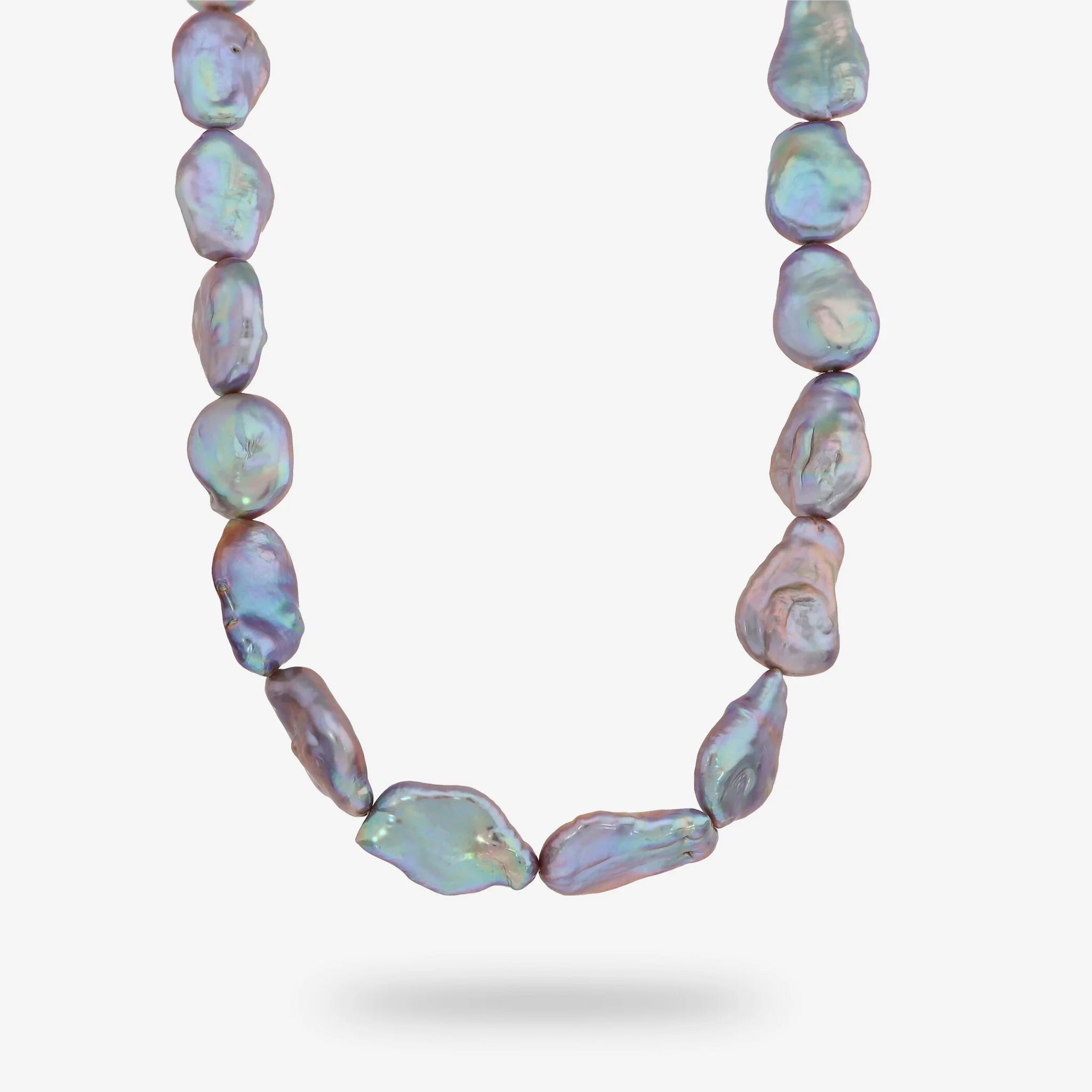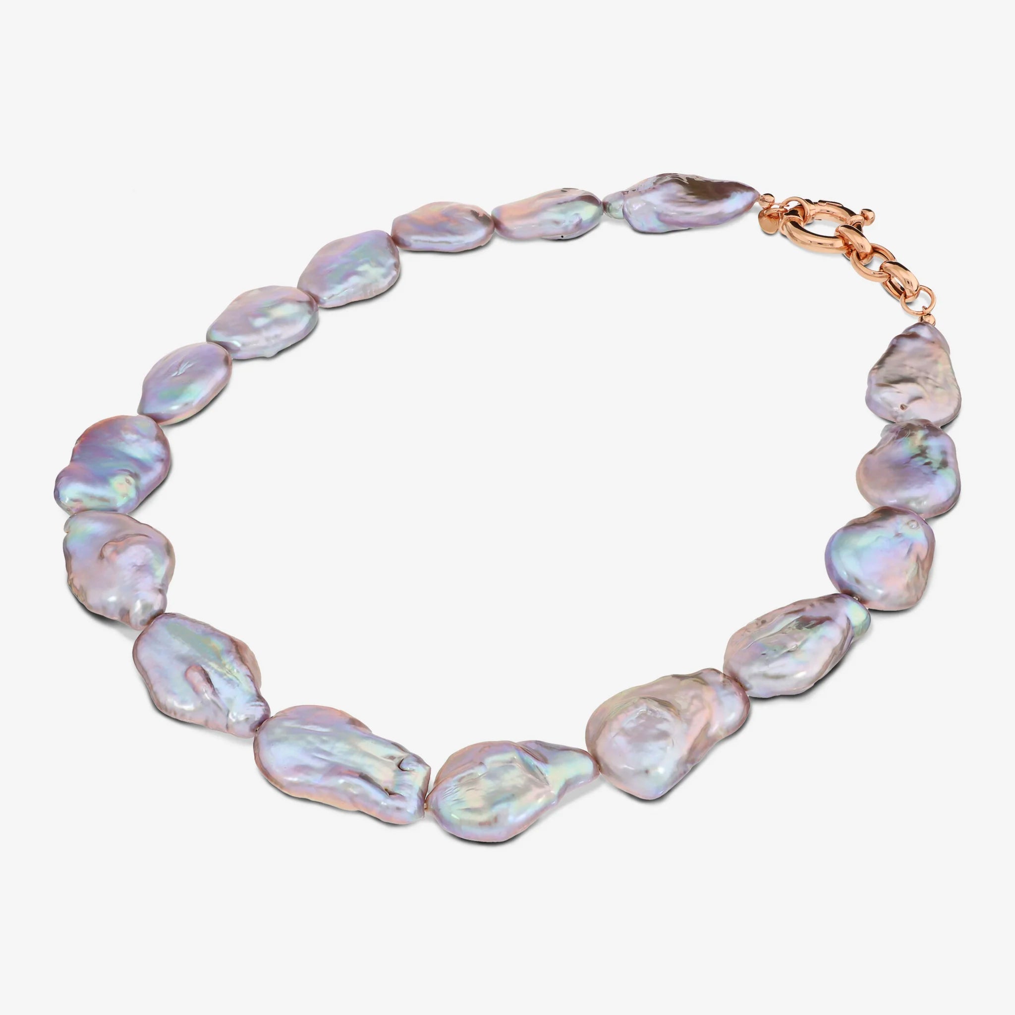 Coin Baroque cultured freshwater peacock pearl choker necklace with a diameter of approximately 17 mm. Length 42+2 cm extension. Spring ring clasp in 18kt rose gold plated 925 silver.