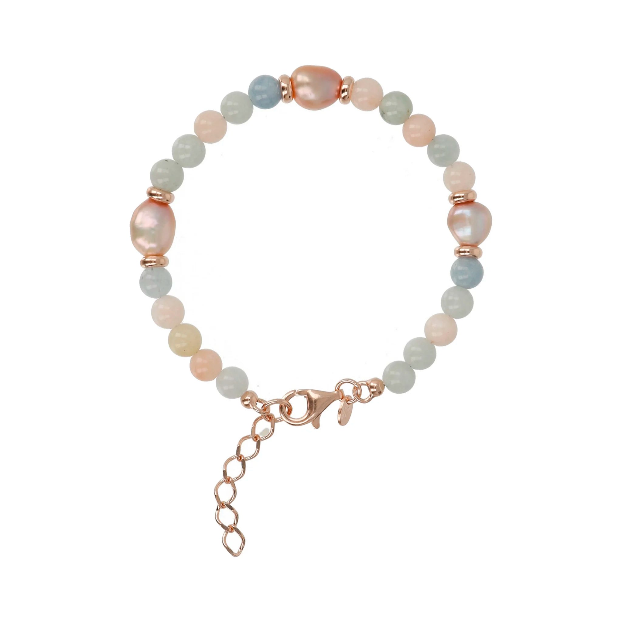 925 silver bracelet 19 cm long with lobster clasp and extender adorned with natural stone beads, multicolored quartzite, and three high-quality multicolored freshwater Baroque pearls with a rounded shape approximately 8/9 mm in diameter. 18kt rose gold plating.