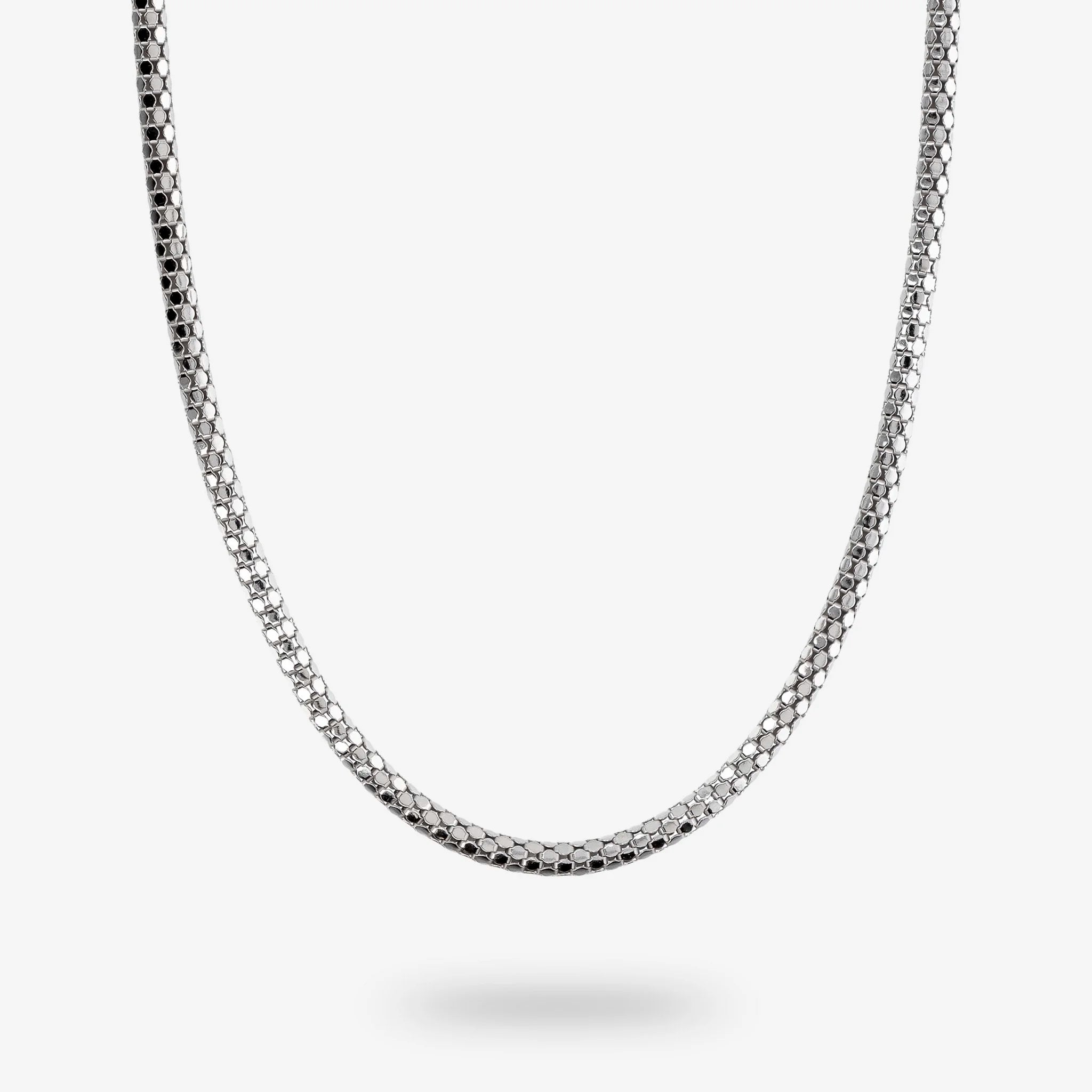 Collier ras de cou « peau de serpent » en maille popcorn en argent 925 platiné. Épaisseur 3,8 mm. Fermoir mousqueton.