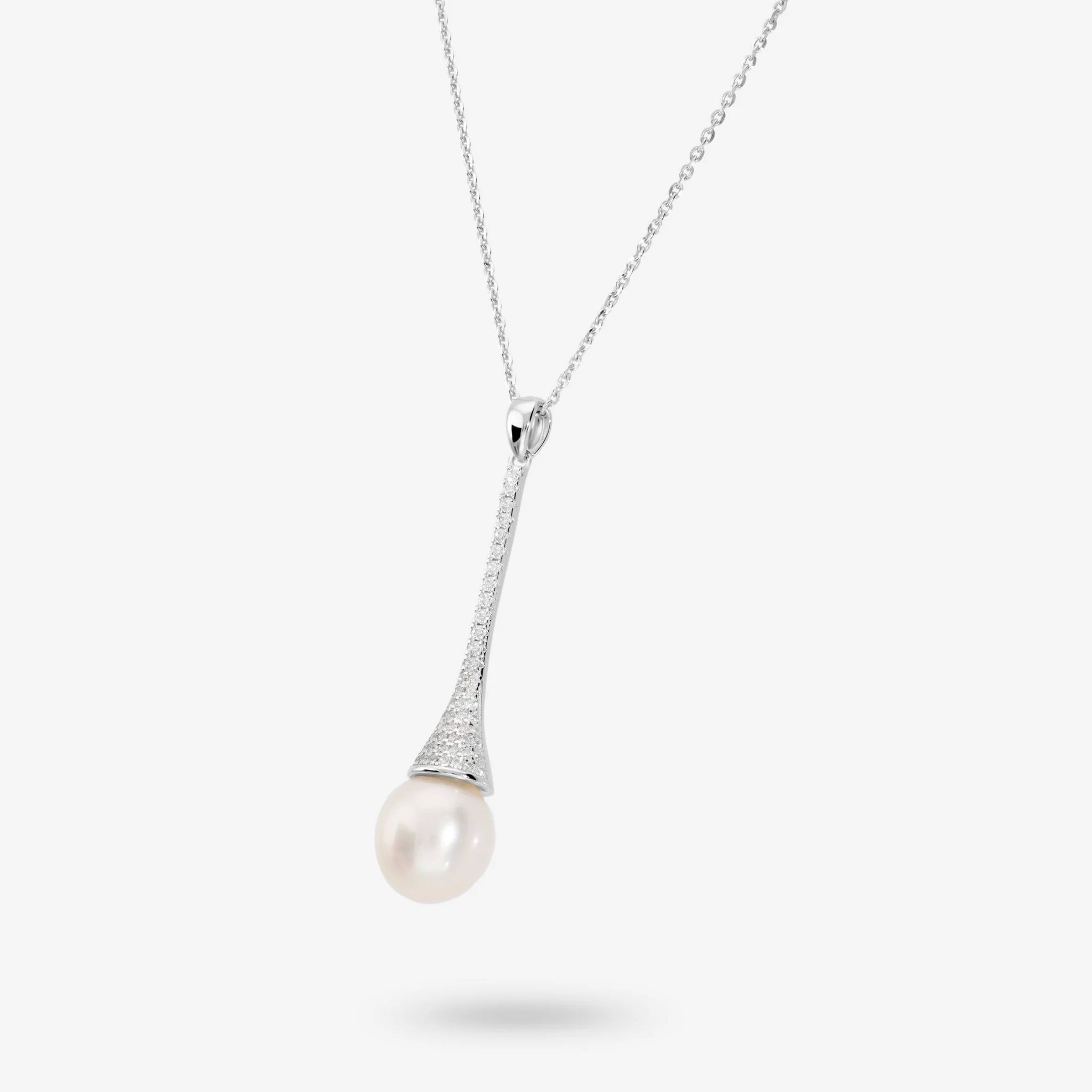 Collier long en argent 925 plaqué or blanc 18Kt avec pendentif en zircon cubique et perle blanche d'eau douce Ø 10 mm