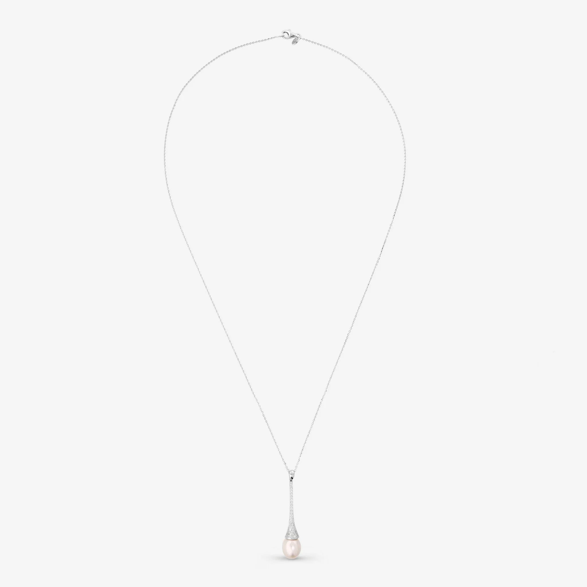 Collier long en argent 925 plaqué or blanc 18kt. Chaîne brillante avec pendentif en pavé de zirconium cubique, qualité "Luminosa", équivalent à 0,26 ct, et perle blanche d'eau douce cultivée d'environ 10 mm de diamètre. Longueur 60 cm. Fermoir mousqueton.
