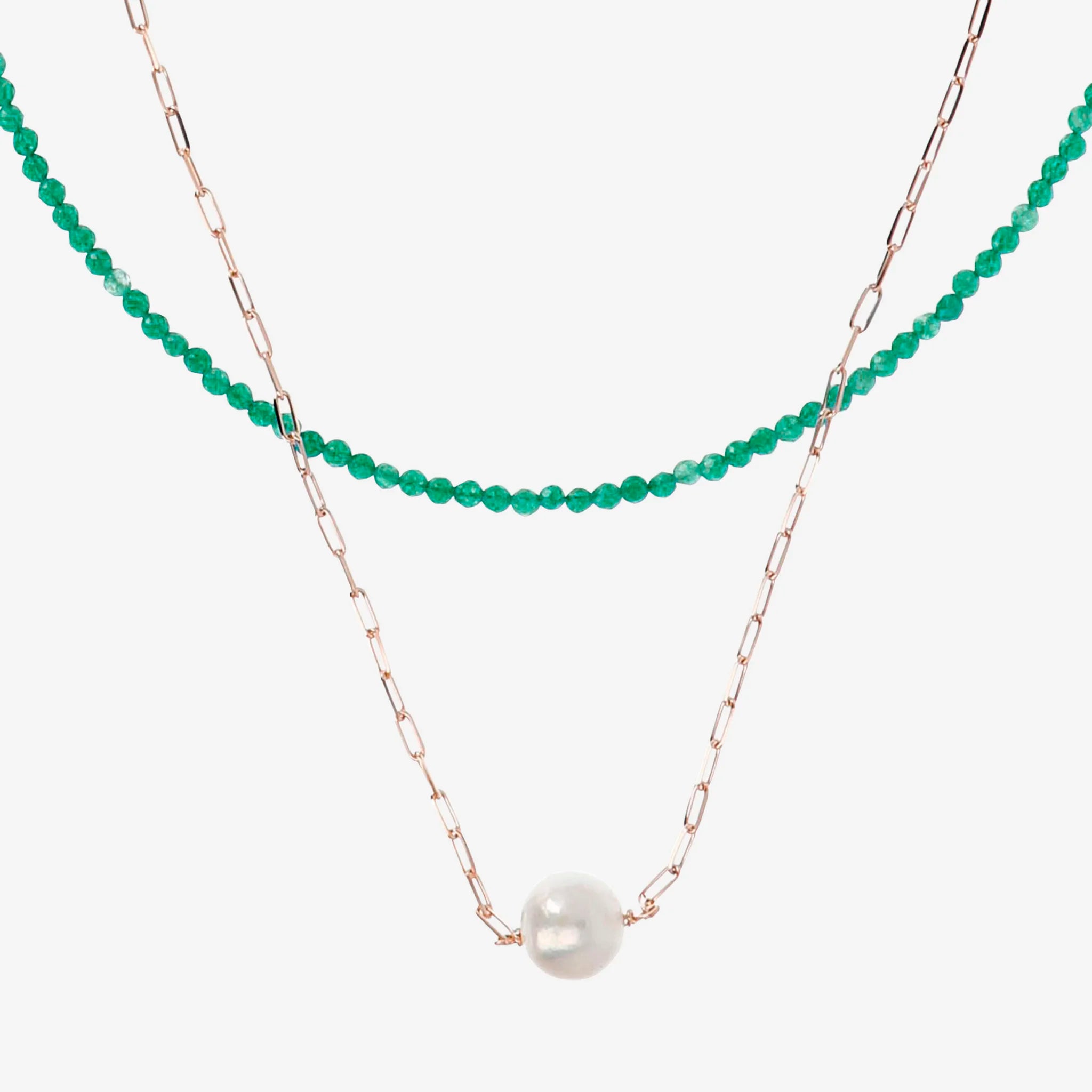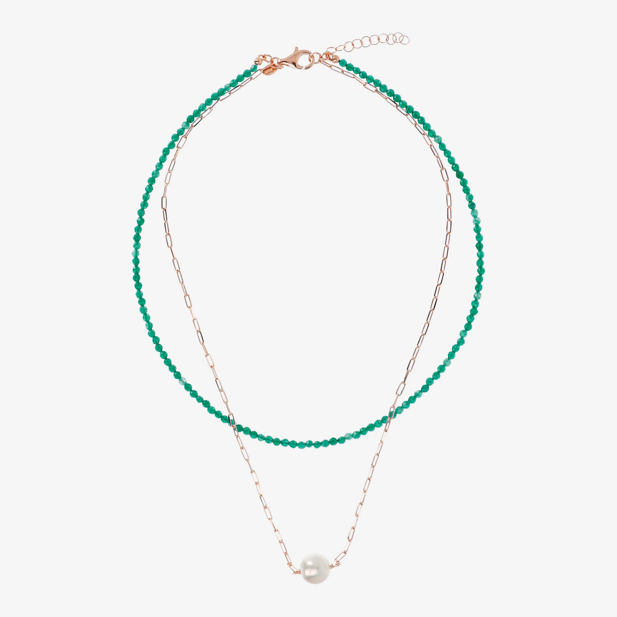 Collier Double Ras-du-Cou avec Quartzite Verte et Lien Forzatina avec Perle Ming Blanche Ø 11 mm en Argent 925 Doré à l'or fin 18ct