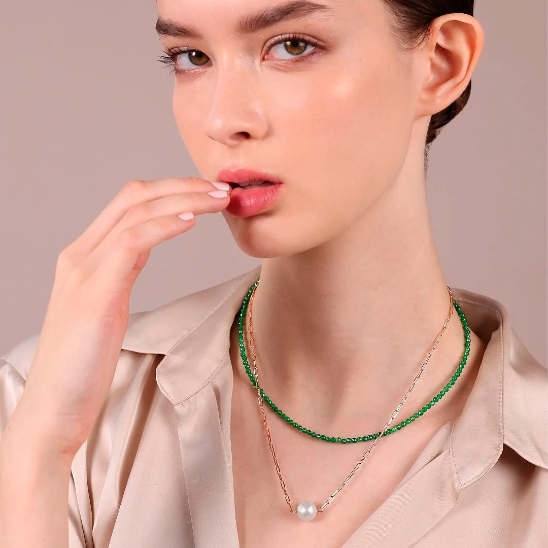 Collier multirangs Perlaviva de Milor composé d'un tour de cou de pierres naturelles rondes (3 mm) facettées en quartzites verts et d'un collier forzatina en argent 925 Doré à l'or fin 18ct avec maillons rectangulaires taille diamant et perle blanche de culture d'eau douce Ming d'un diamètre d'environ 11 mm. Le tour de cou mesure 35,5 cm de long tandis que la forzatina mesure 42 cm. Fermoir mousqueton avec extension de 3,5 cm.