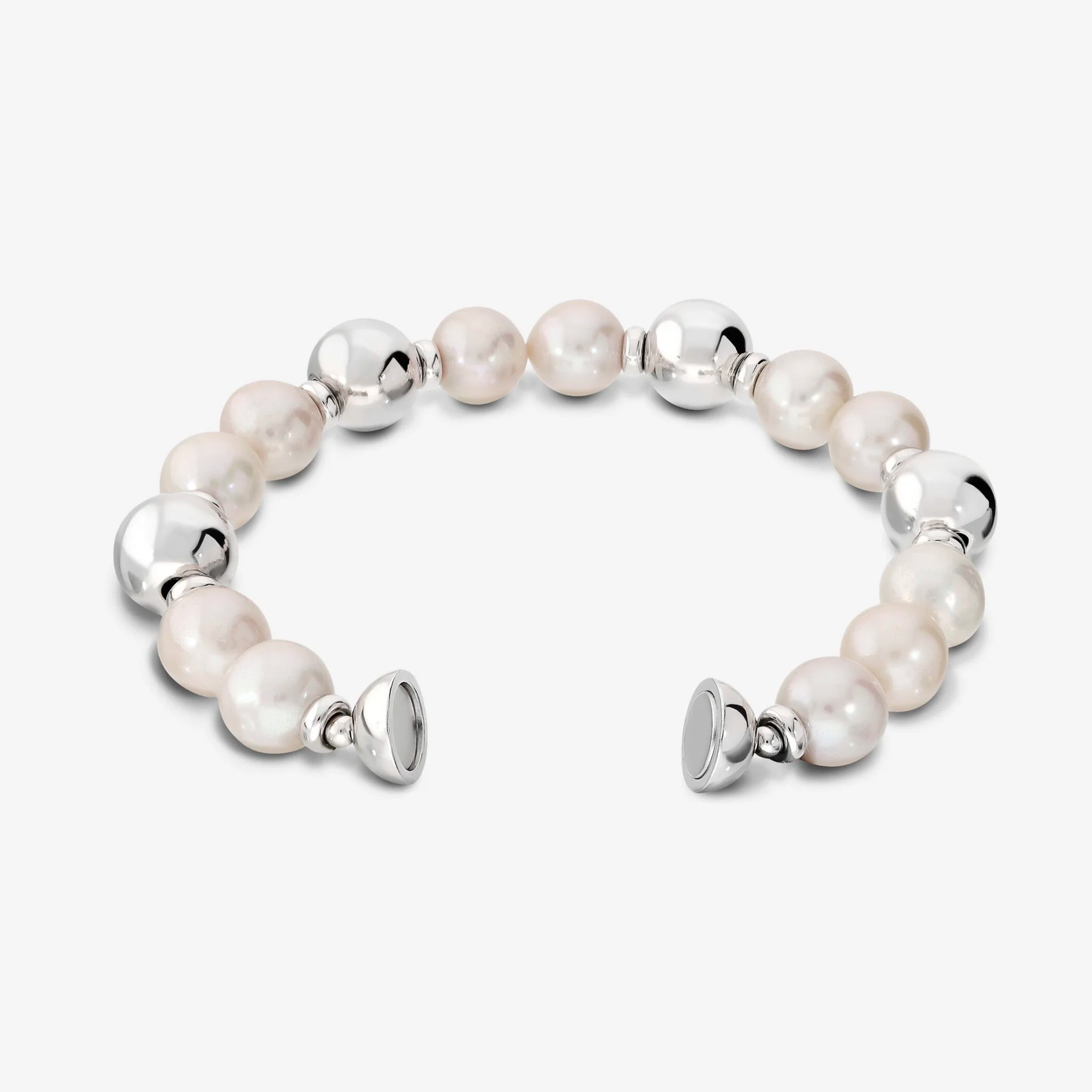 Bracelet Perlaviva de Milor avec des perles blanches de culture d'eau douce Ming d'un diamètre d'environ 10/11 mm, alternées avec des perles en argent (12 mm) et des petites rondelles (5,5x2 mm). Fermoir magnétique en argent 925 Doré à l'or fin 18ct.