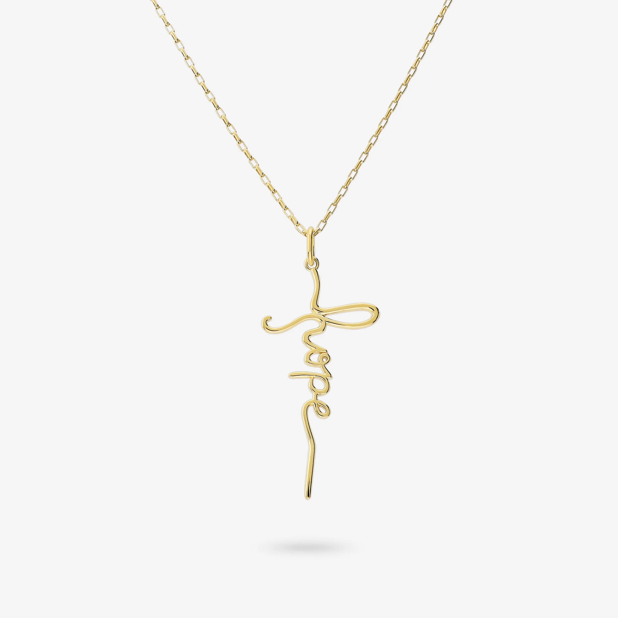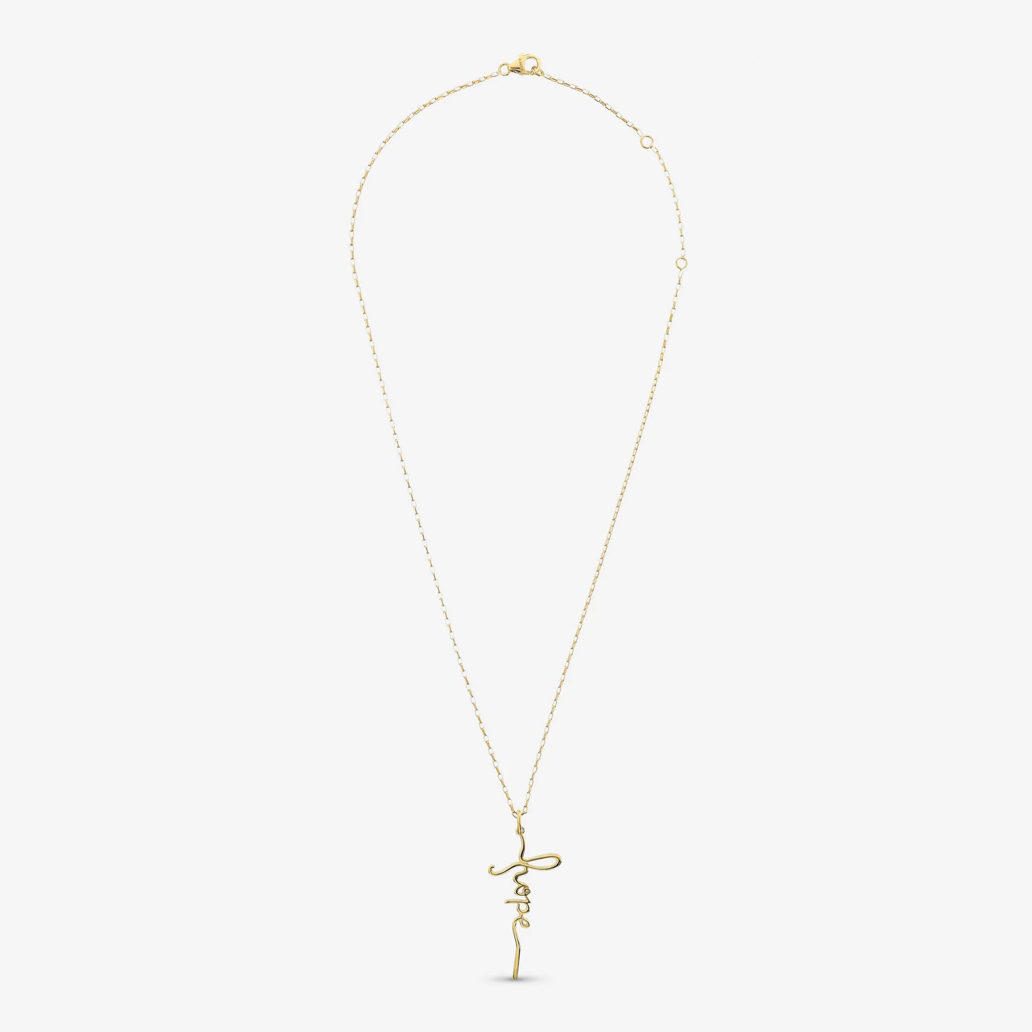 Collana in Argento 925 placcato Oro giallo 18kt. Maglia brillantina e pendente lucido rimovibile con scritta 'Hope'. Chiusura a moschettone. Lunghezza totale 50cm con anellini interposti a 43 e 47cm.
