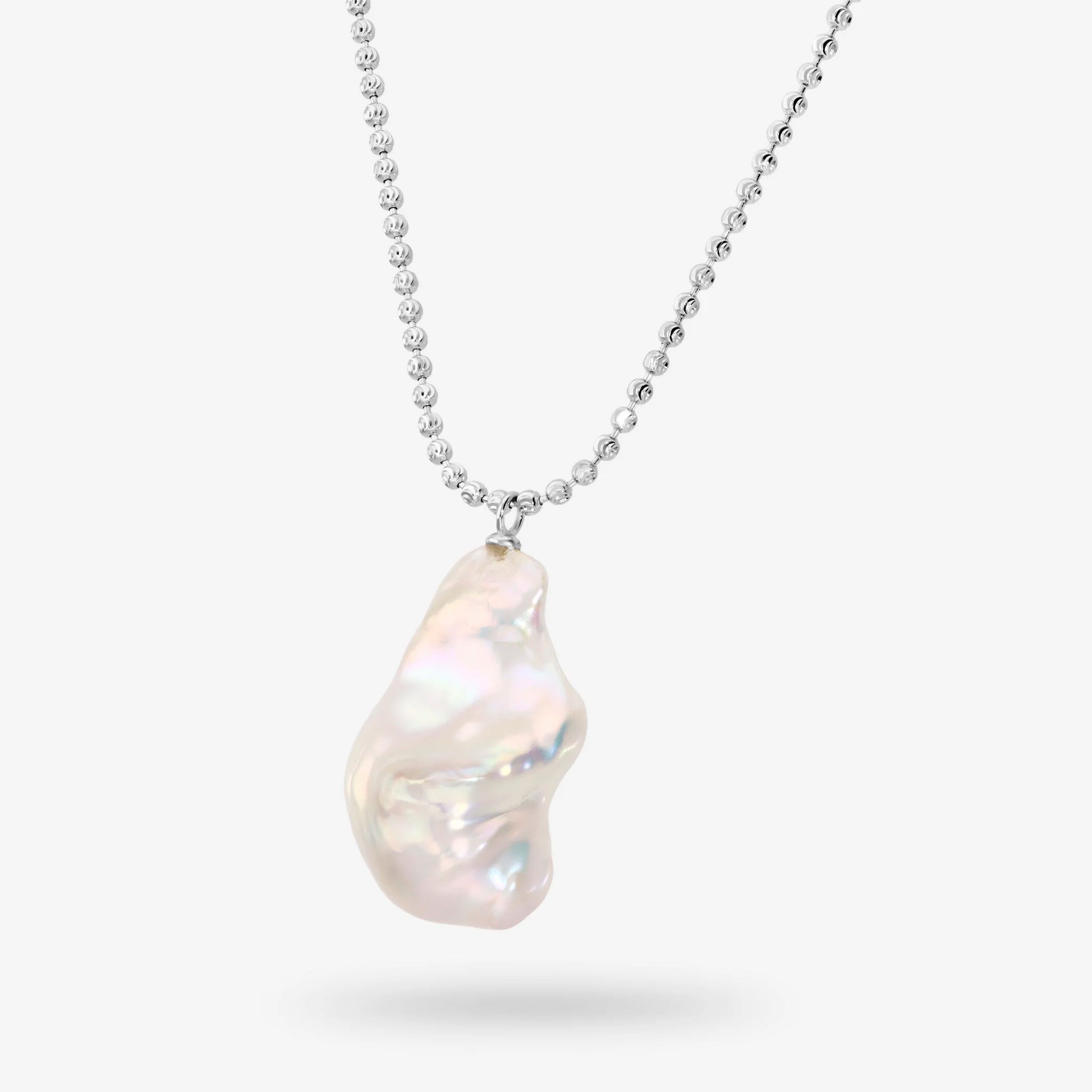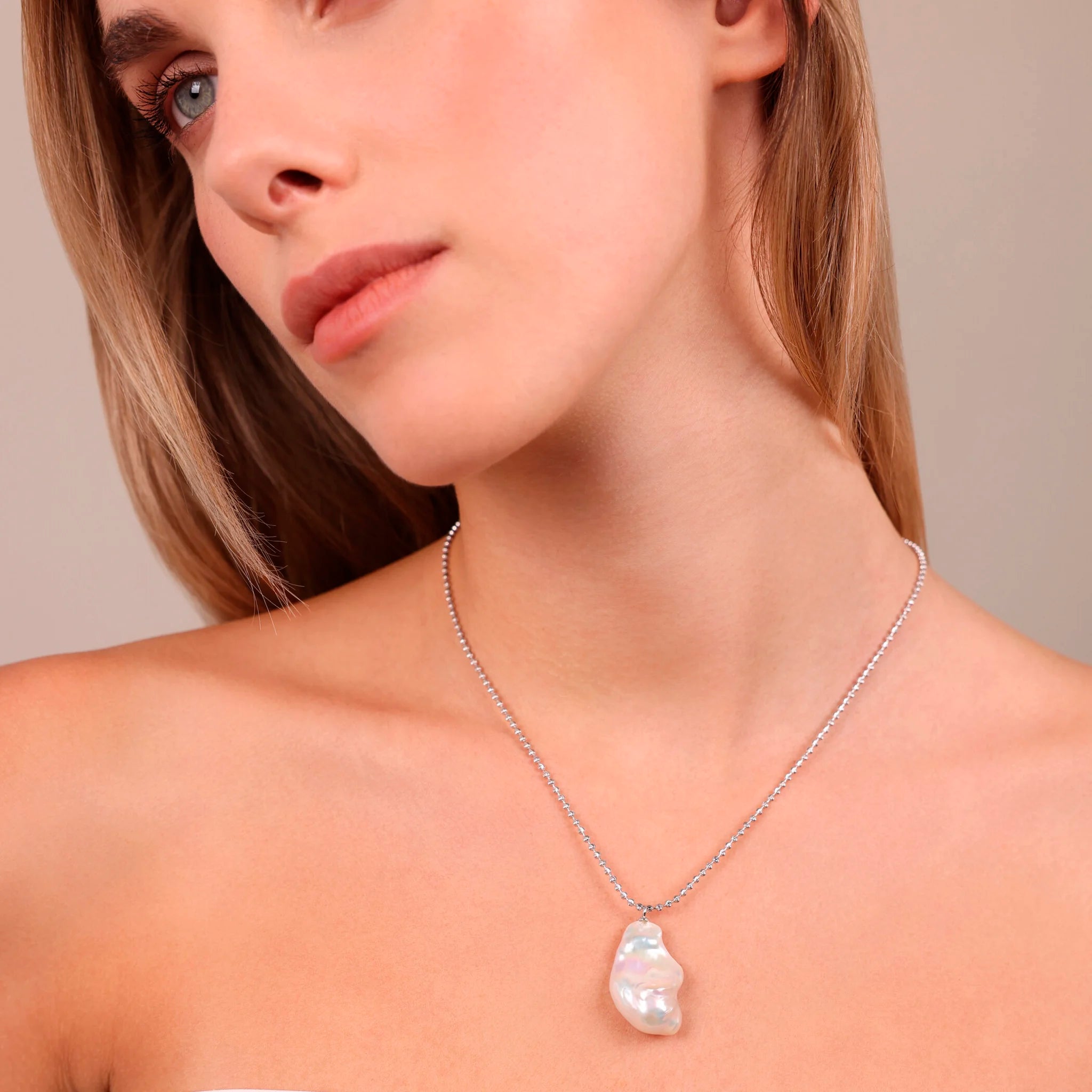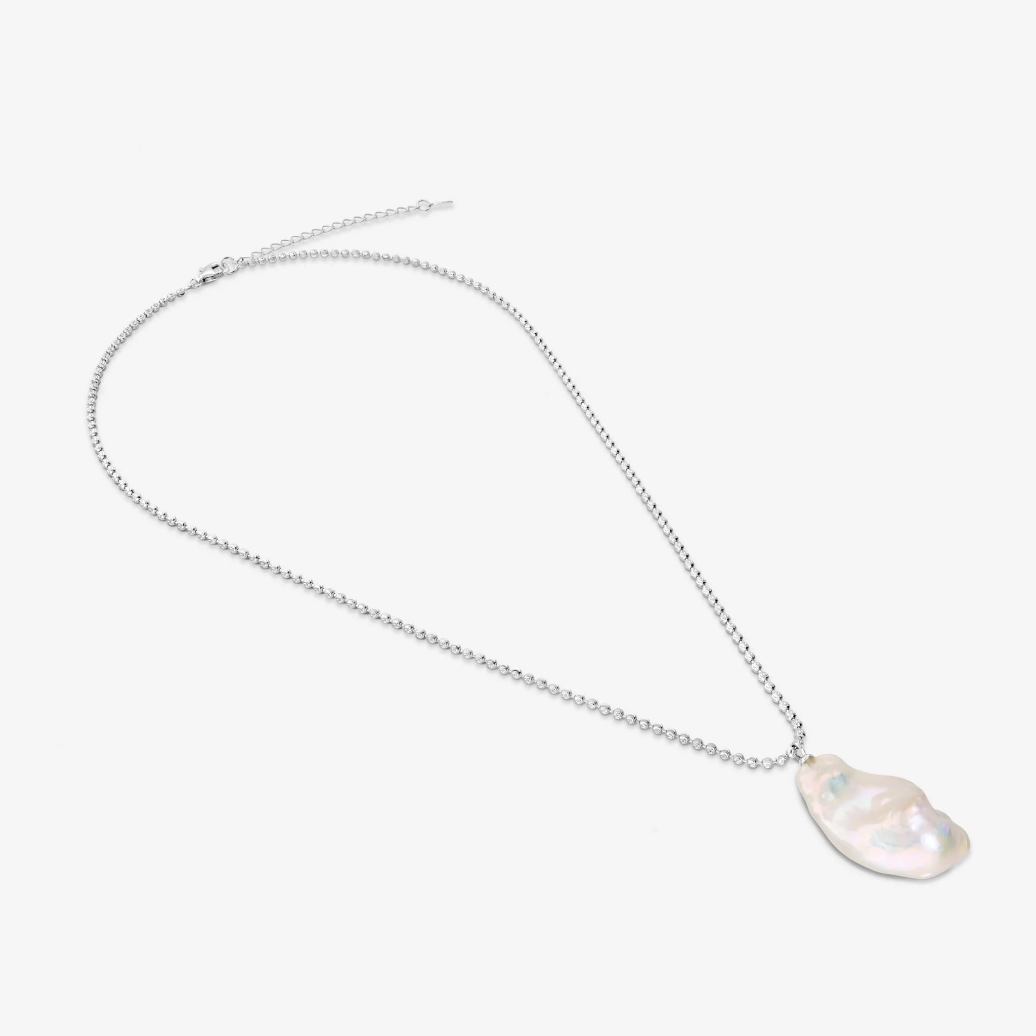 Collier ras du cou en argent 925, plaqué or blanc 18kt, avec microbilles brillantes et pendentif en perle Scaramazza blanche d'eau douce cultivée (30x18 mm). Longueur 45+5 cm avec extension. Fermoir mousqueton.