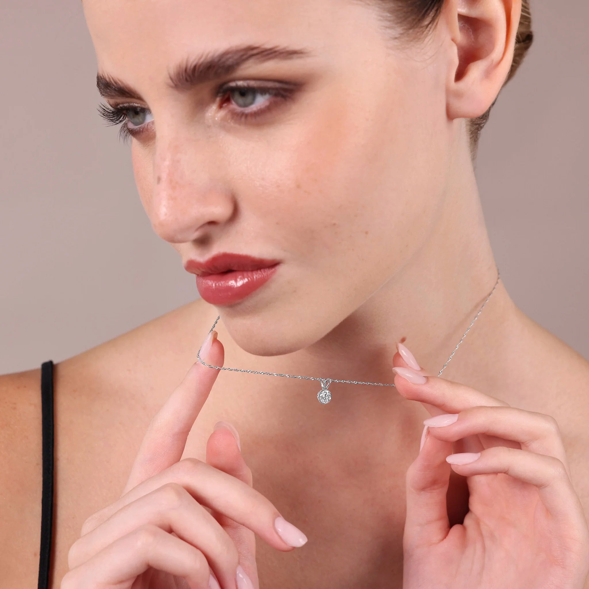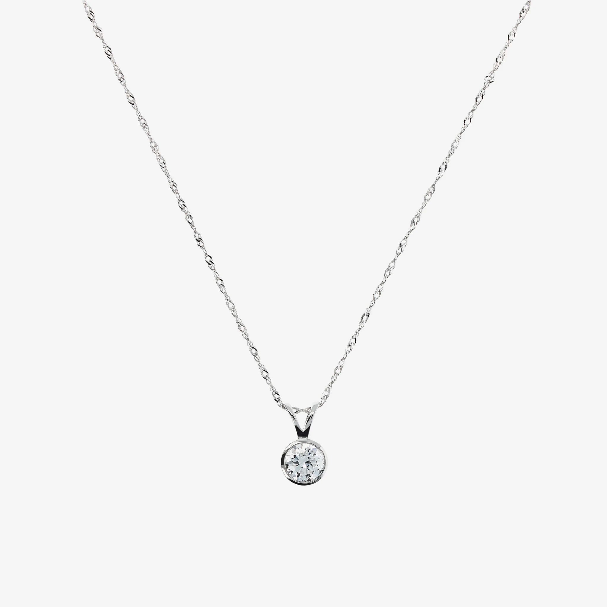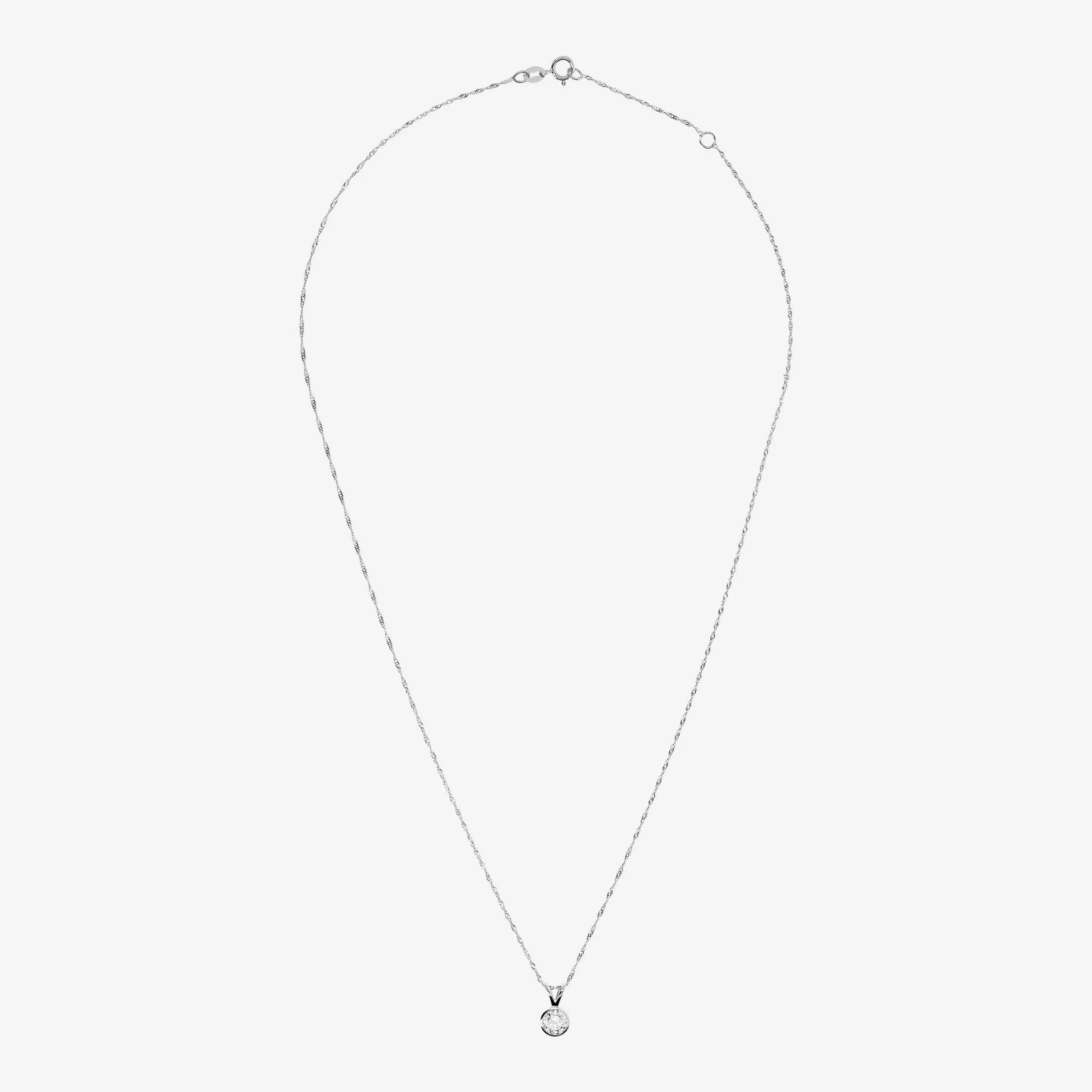 Collier maillon Singapour en or blanc 375/1000 avec pendentif point lumineux en diamant de synthèse (poids total 0,52 ct). Monture ronde, sans griffes. Longueur 45 cm avec anneau placé à 42 cm. Fermoir mousqueton.