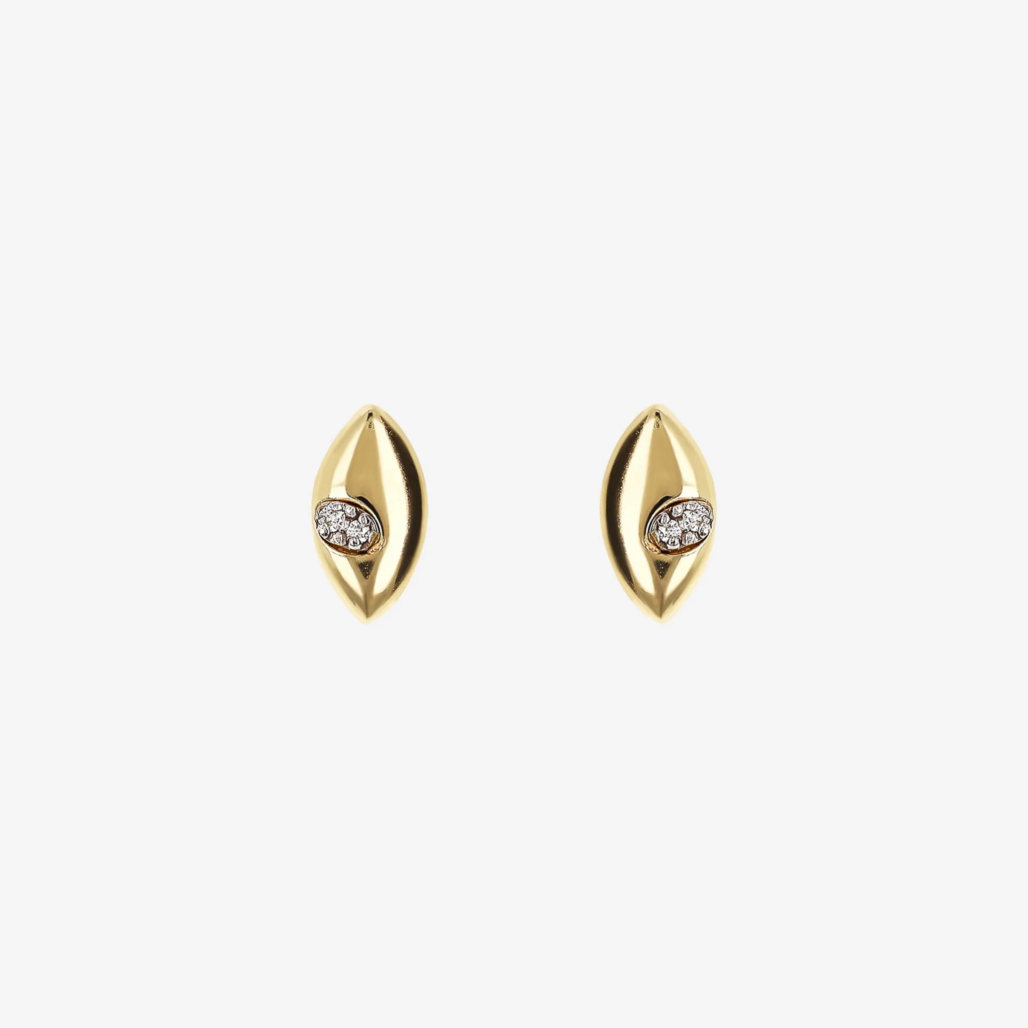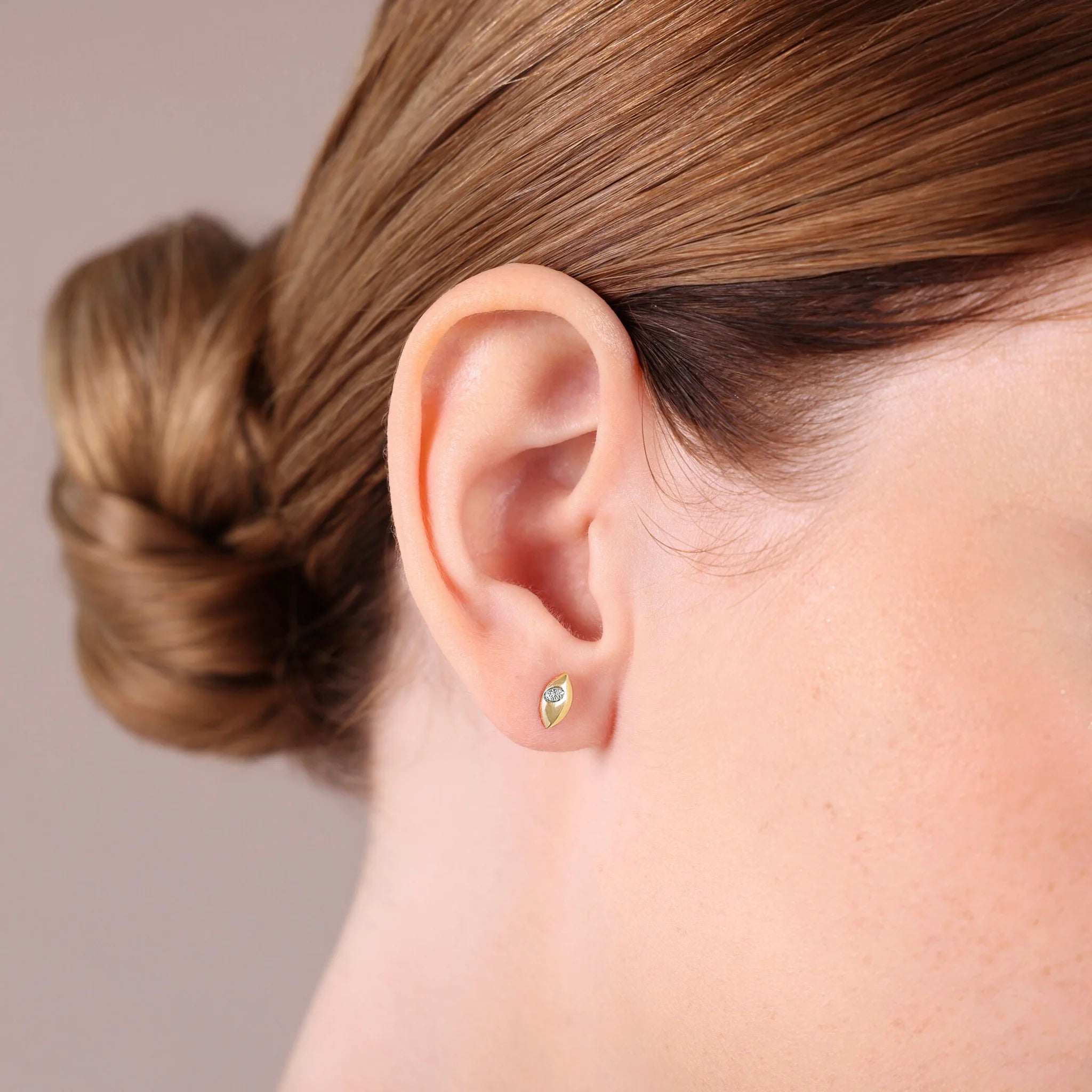 Boucles d'oreilles lobes de forme marquise en or jaune 375/1000 avec une pointe lumineuse en diamant synthétique (poids total 0,018ct). Fermeture par épingle et silicone.