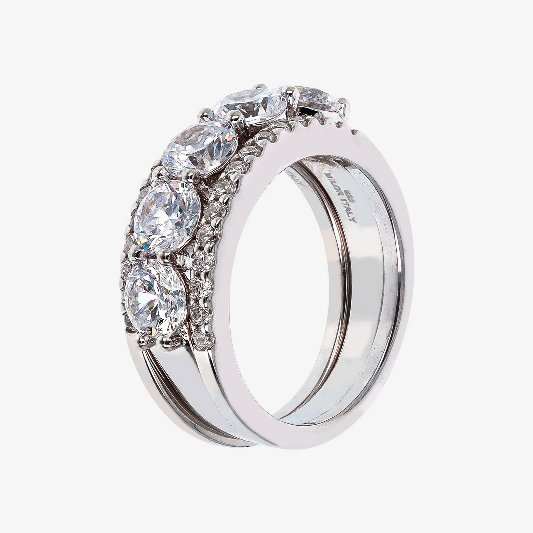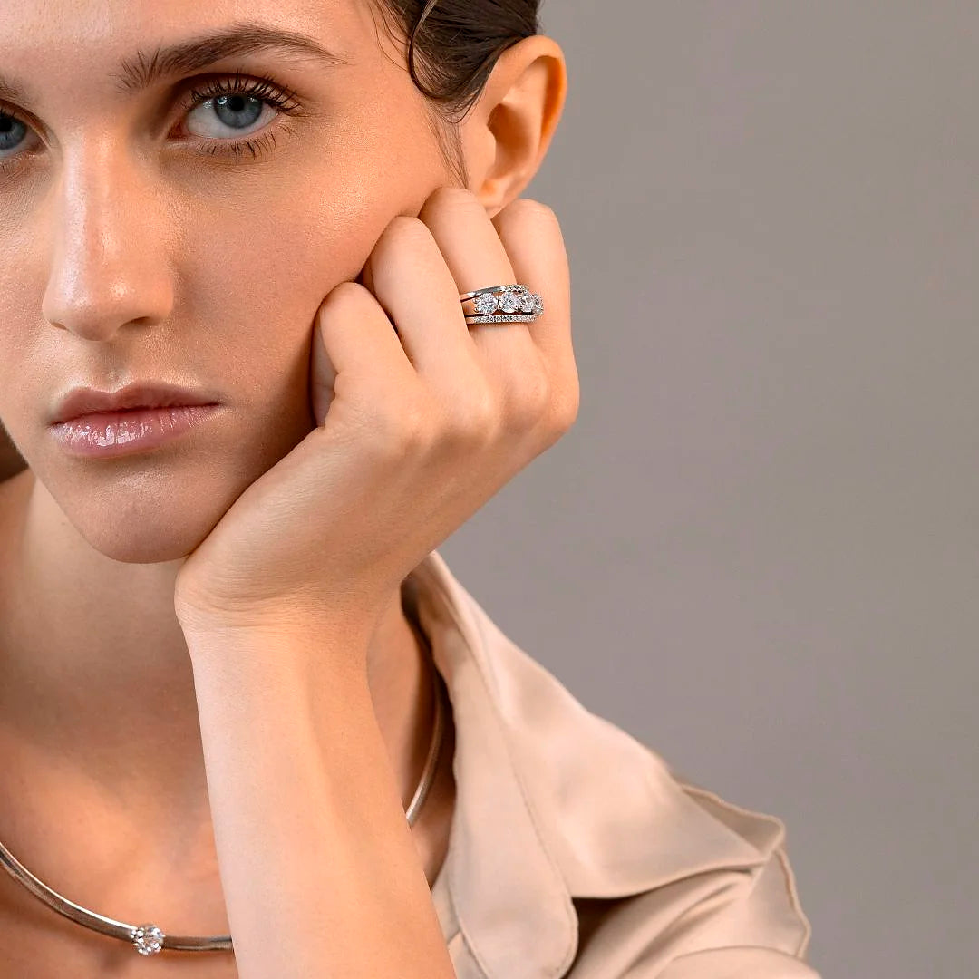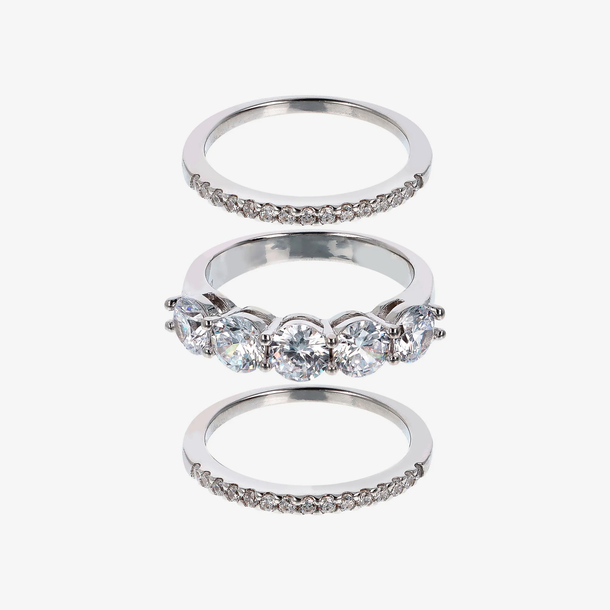 Lot de trois bagues rivière en zircons cubiques, qualité 'Lumineux', en Argent 925 Rhodié. Deux anneaux ont un total de 30 pierres de 1,5 mm, un anneau a cinq pierres de 5 mm égales à 2,95 ct.