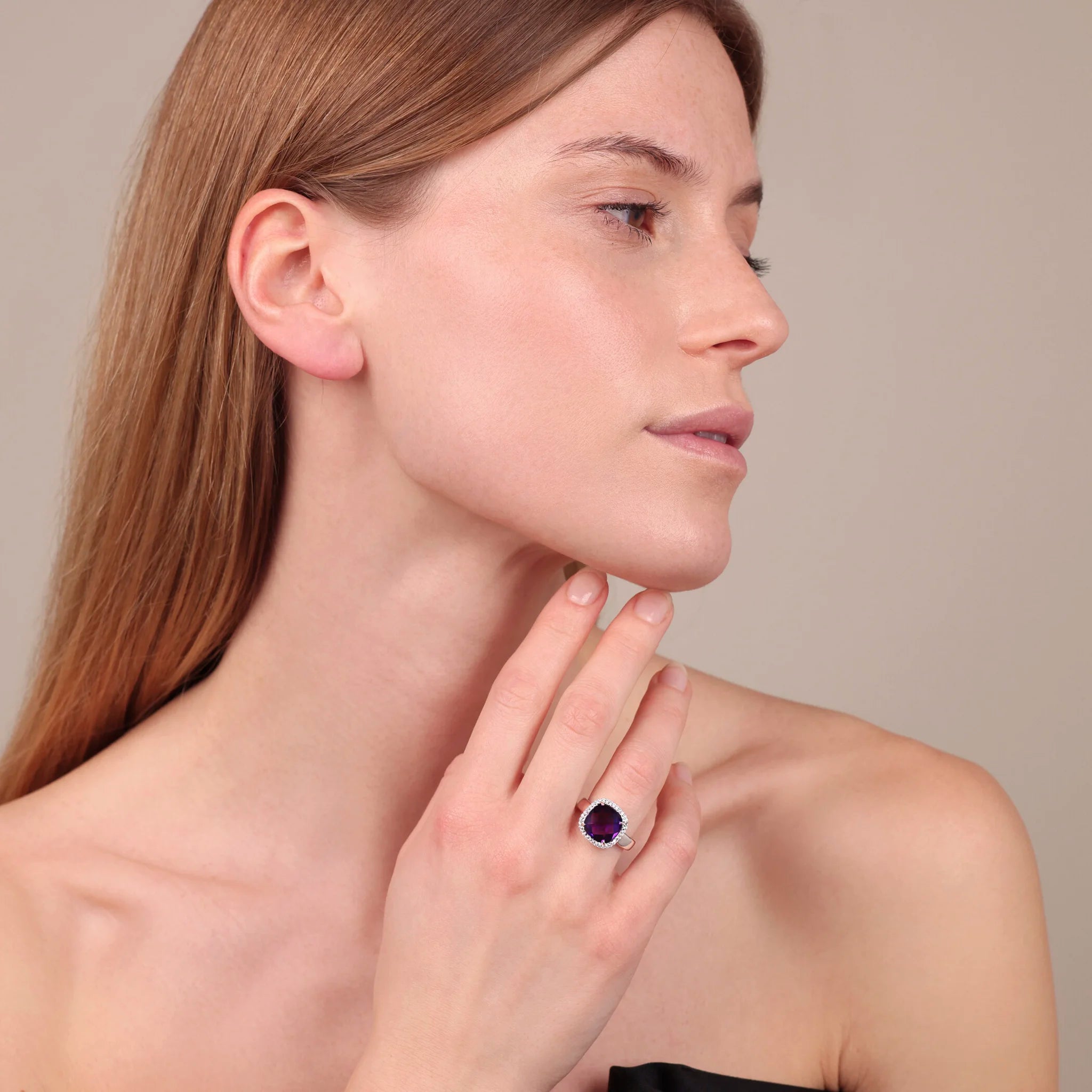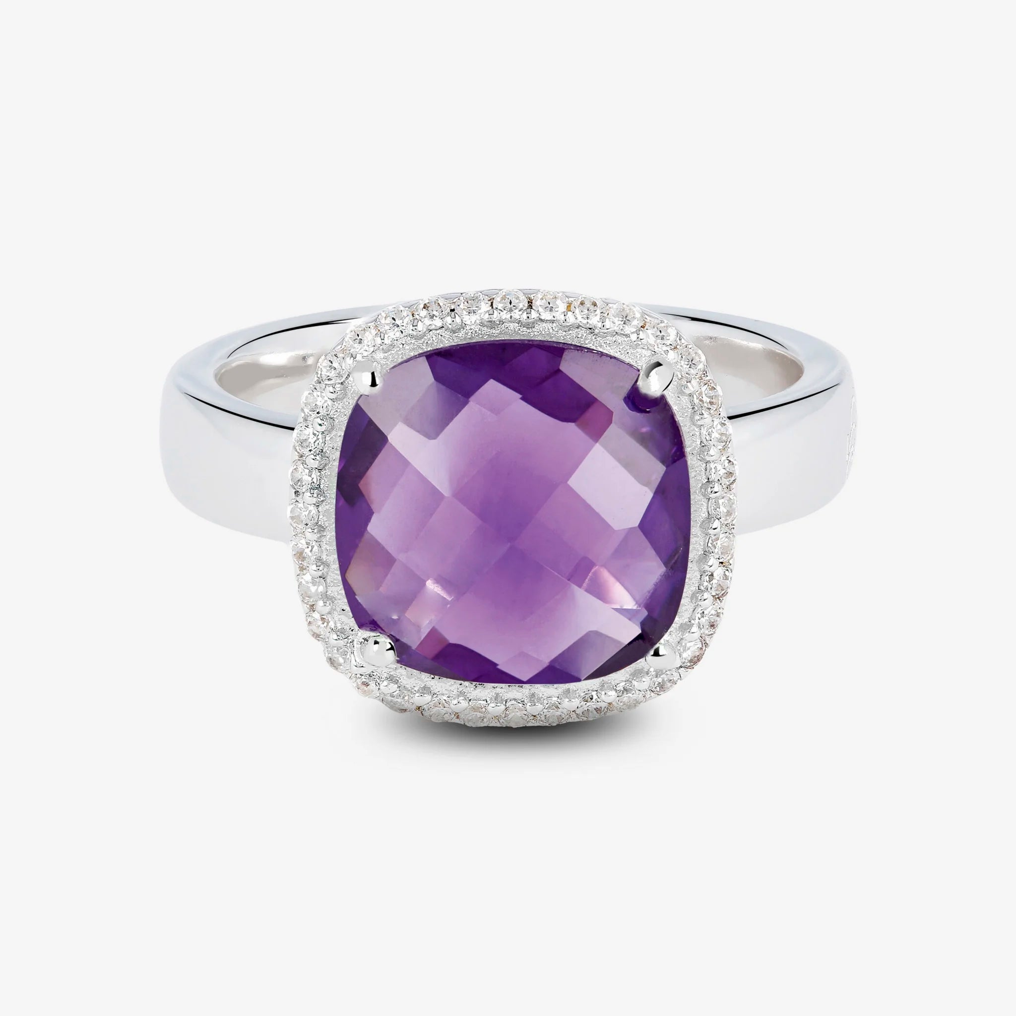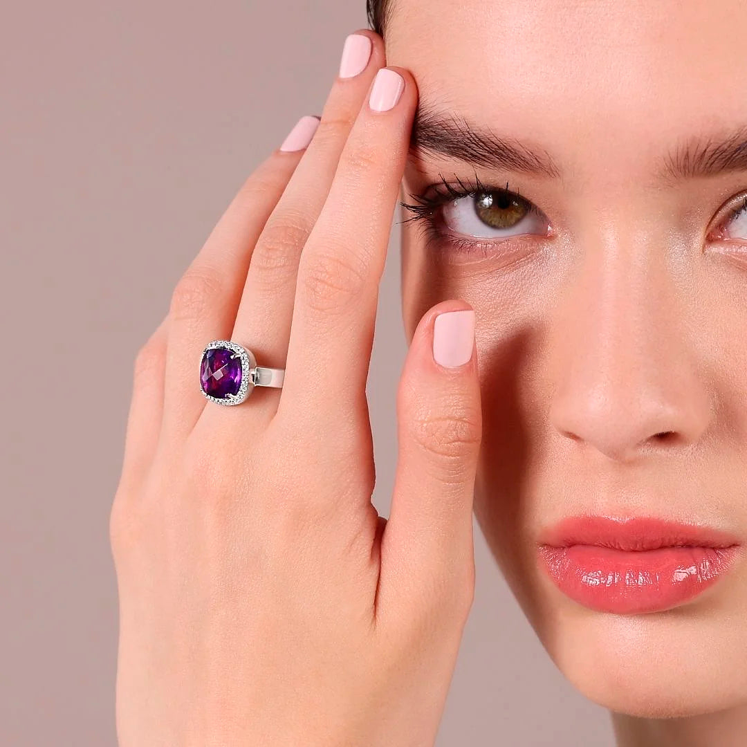 Bague solitaire en Argent 950 Platiné, avec améthyste facettée (10x10 mm) égale à 3,5 ct entourée d'un pavé de zircones cubiques, qualité 'Lumineux' égale à 0,15 ct.
