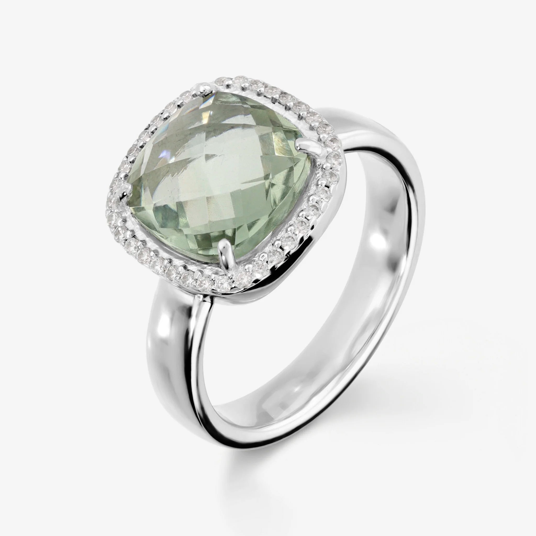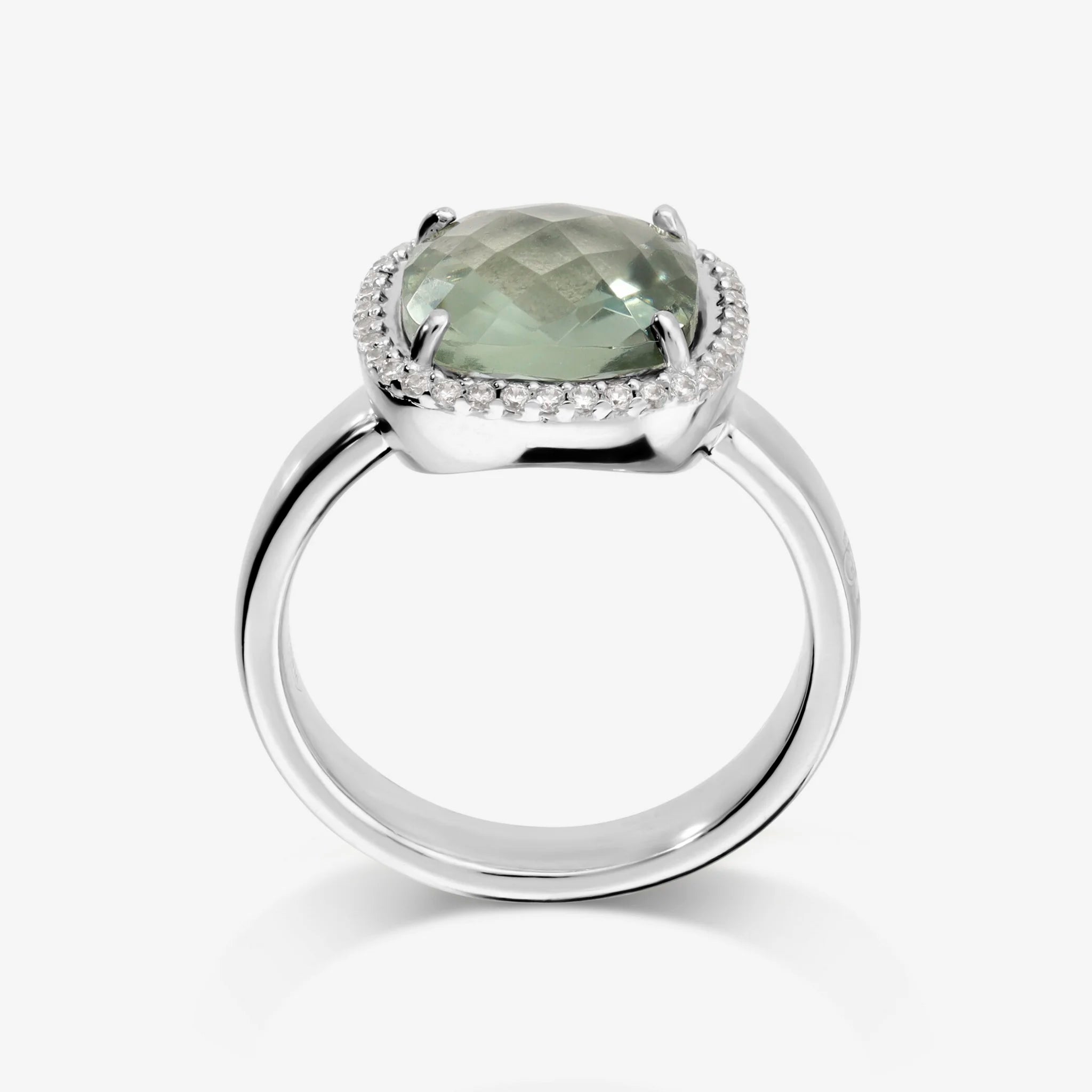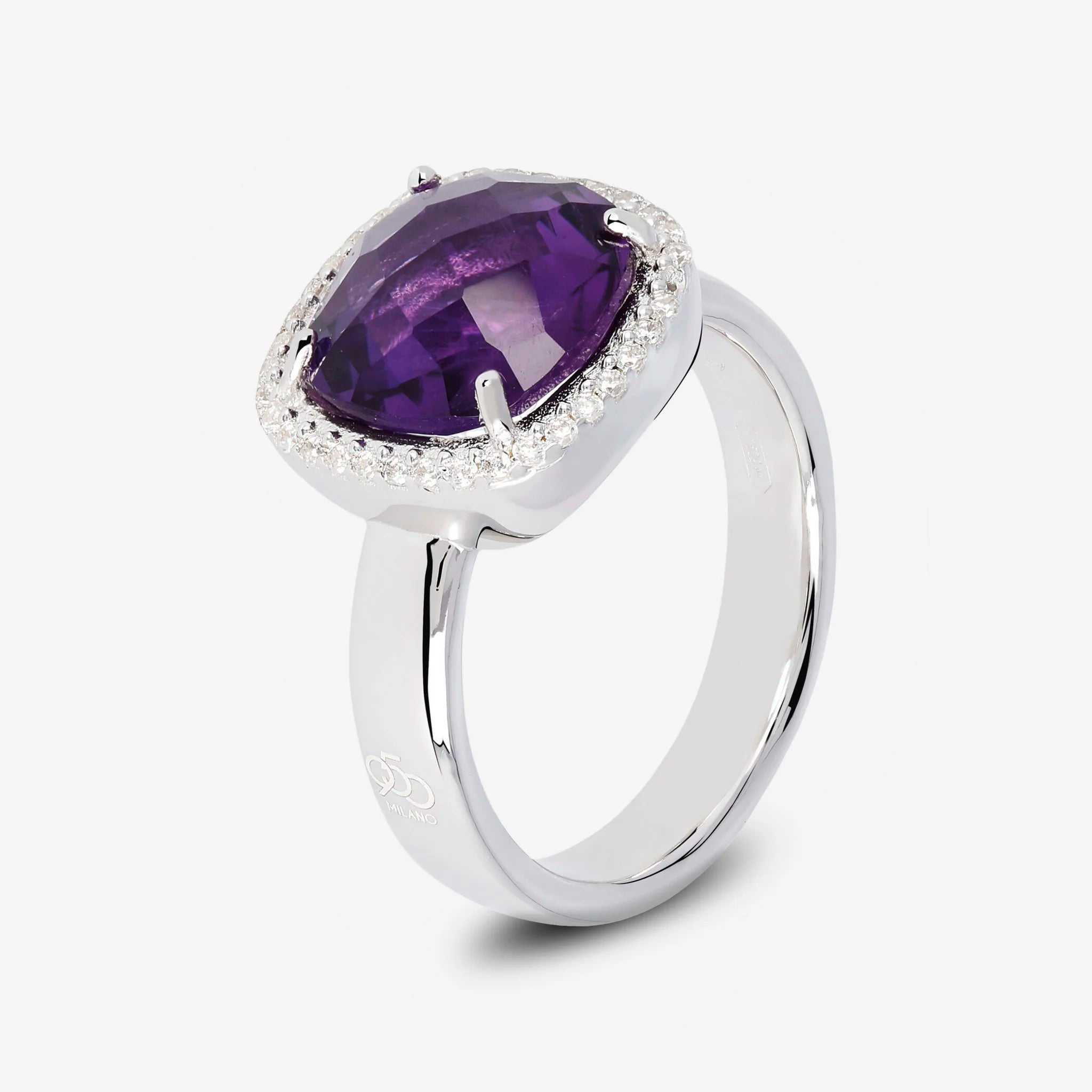 Bague solitaire en Argent 950 Platiné, avec améthyste facettée (10x10 mm) égale à 3,5 ct entourée d'un pavé de zircones cubiques, qualité 'Lumineux' égale à 0,15 ct.