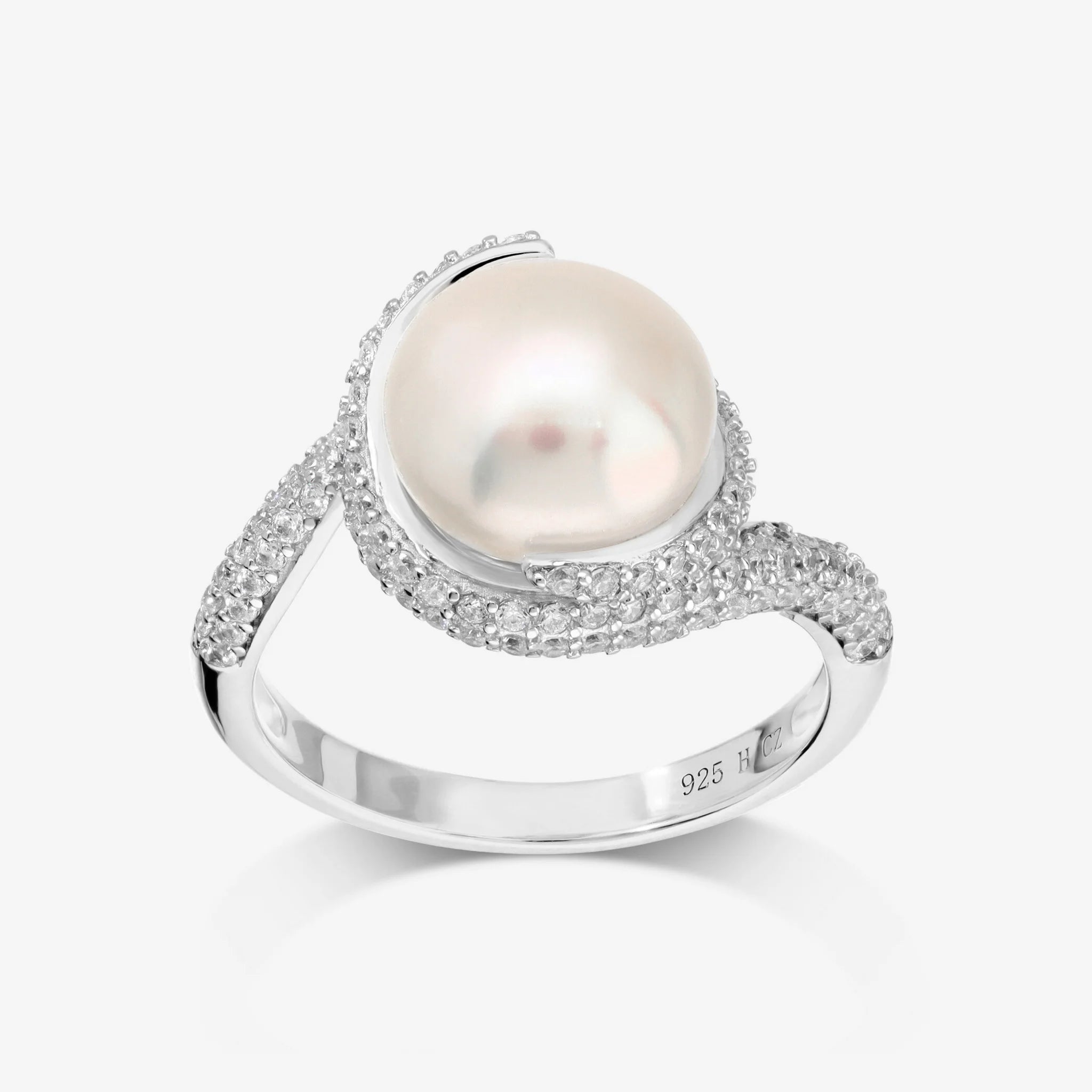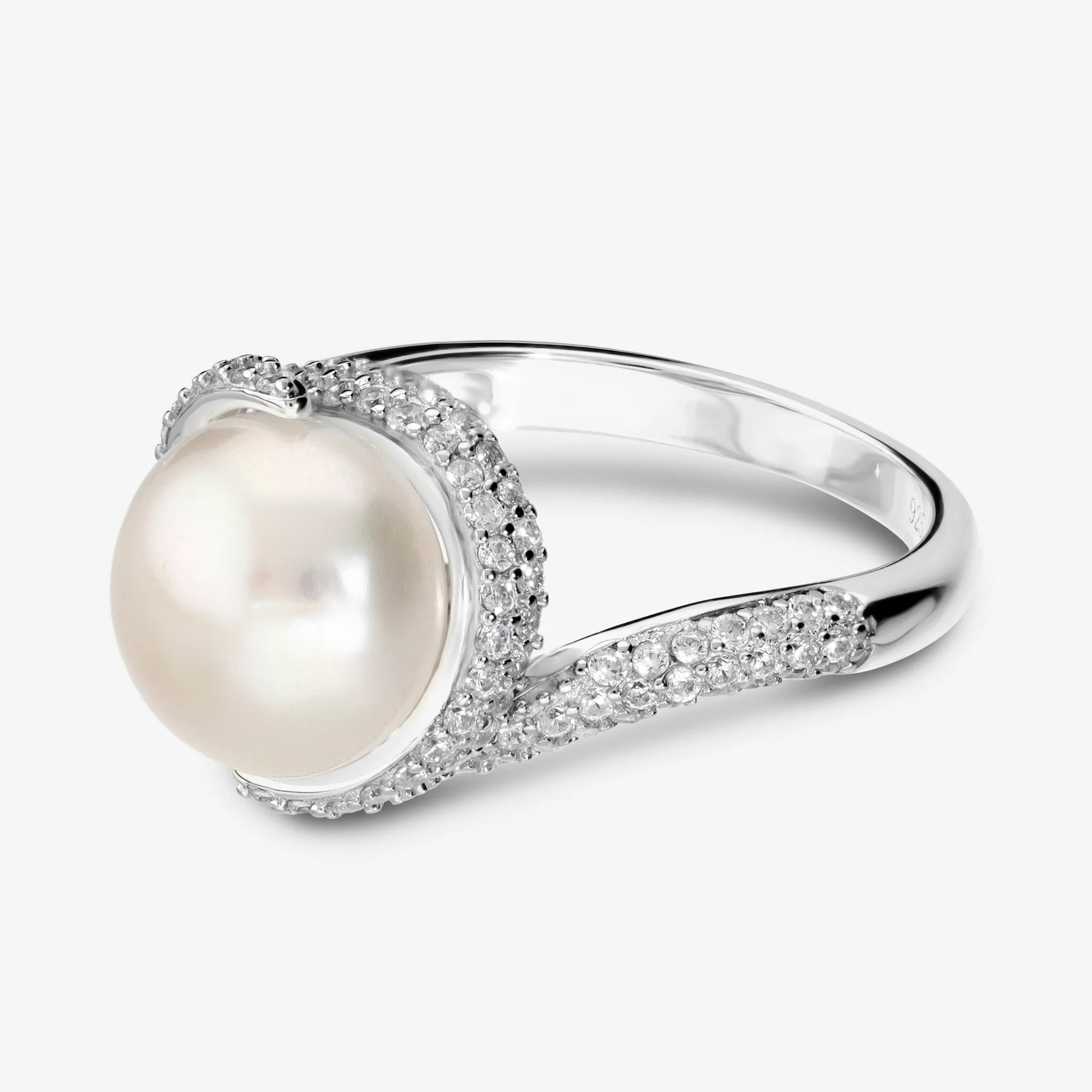 Bague solitaire en argent 925 au design sinueux avec pavé de zircones cubiques et perle bouton de culture d'eau douce blanche d'un diamètre d'environ 11/12 mm.