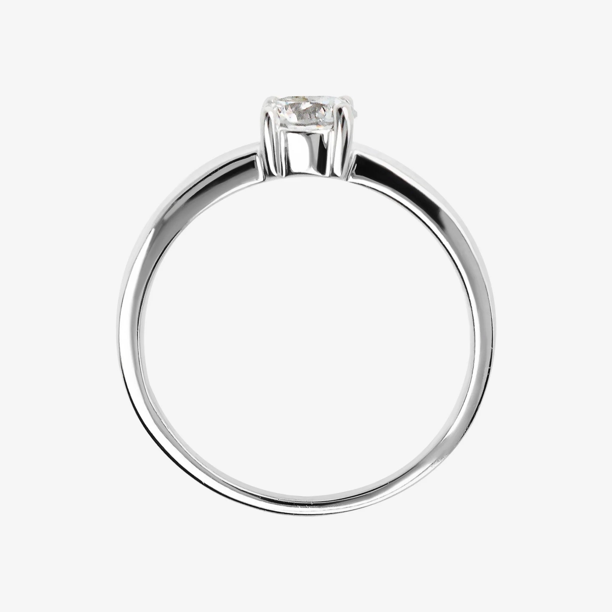 Bague solitaire en or blanc 375/1000 avec diamant synthétique (poids total 0,5ct). Cadre rond à quatre griffes.