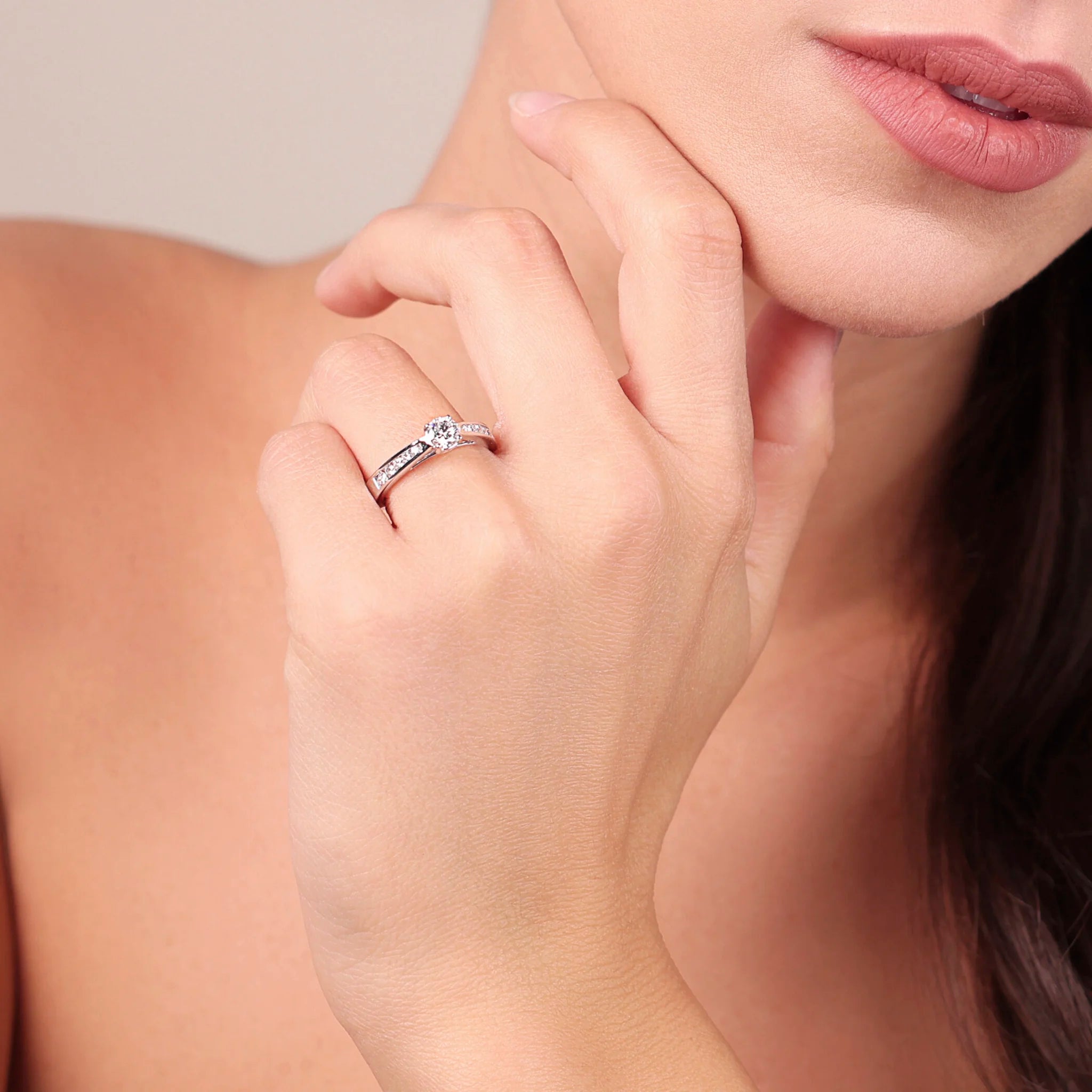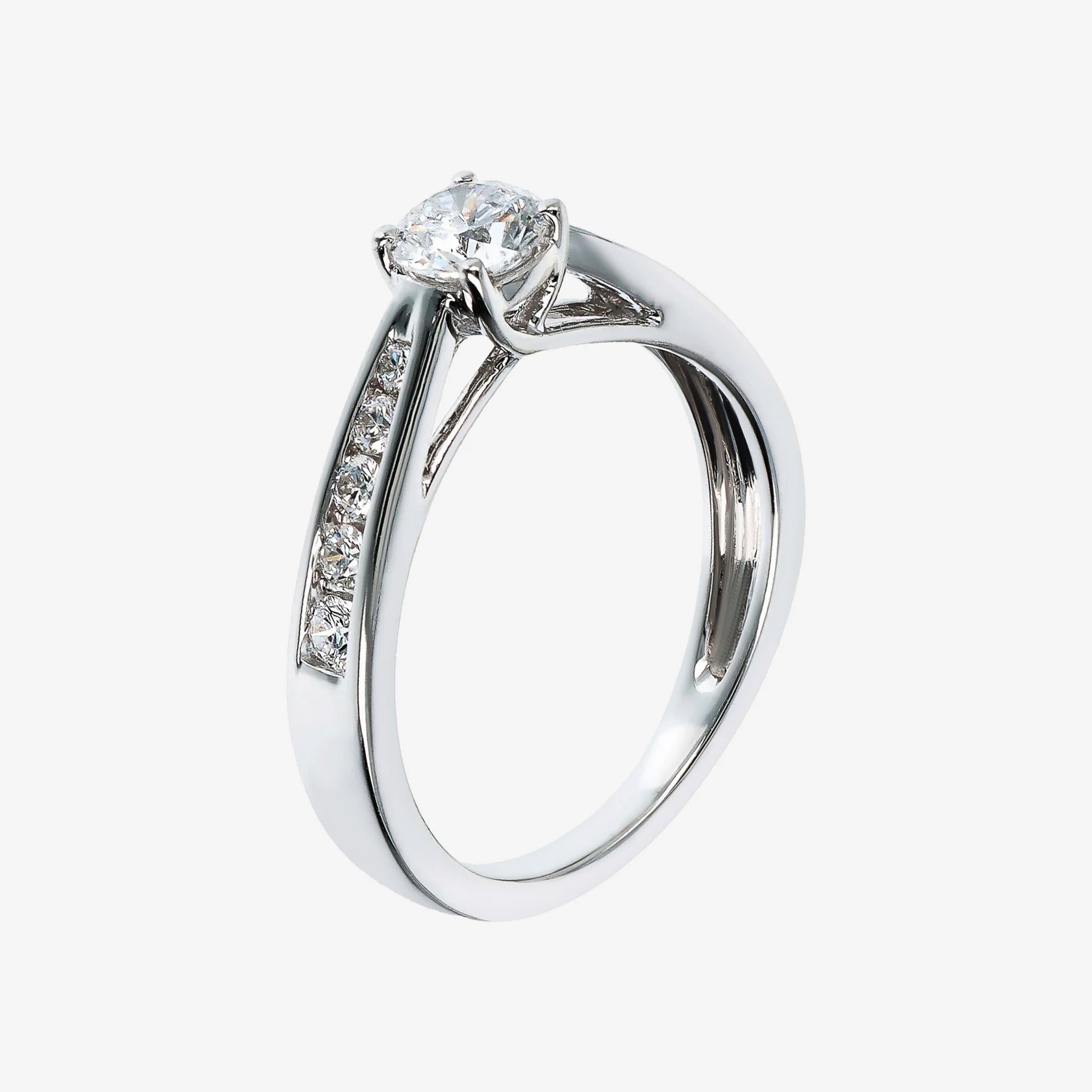 Bague solitaire en or blanc 375/1000 ornée d'une riviera de petits diamants de synthèse gradués et d'un diamant de synthèse central (poids total 0,75ct). Cadre rond à quatre griffes.
