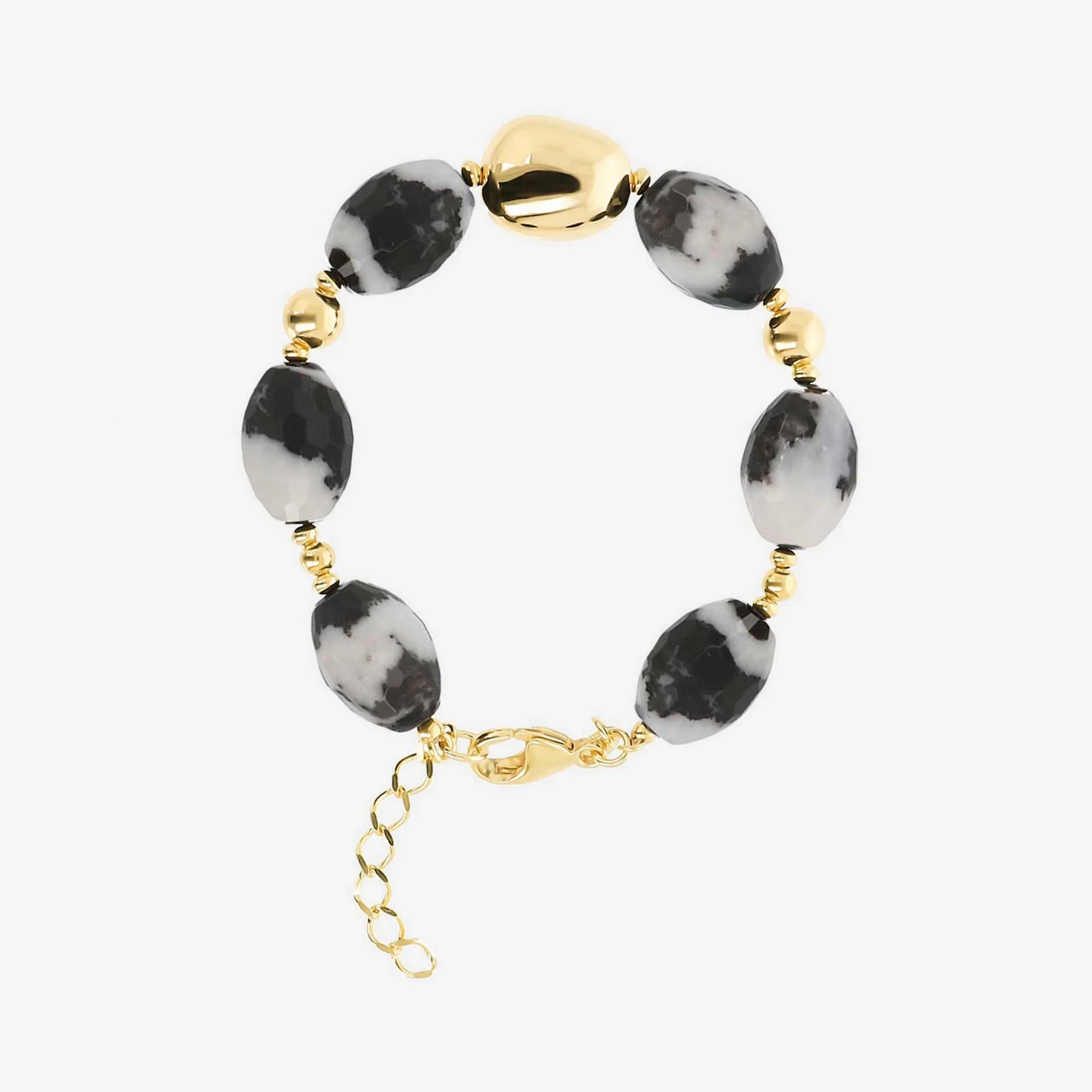 Bracelet en argent 925 doré à l'or fin 18ct avec pierres de jaspe naturelles noires et blanches facettées (18x13 mm), alternées avec des perles brillantes et une pépite électroformée. Fermoir mousqueton.