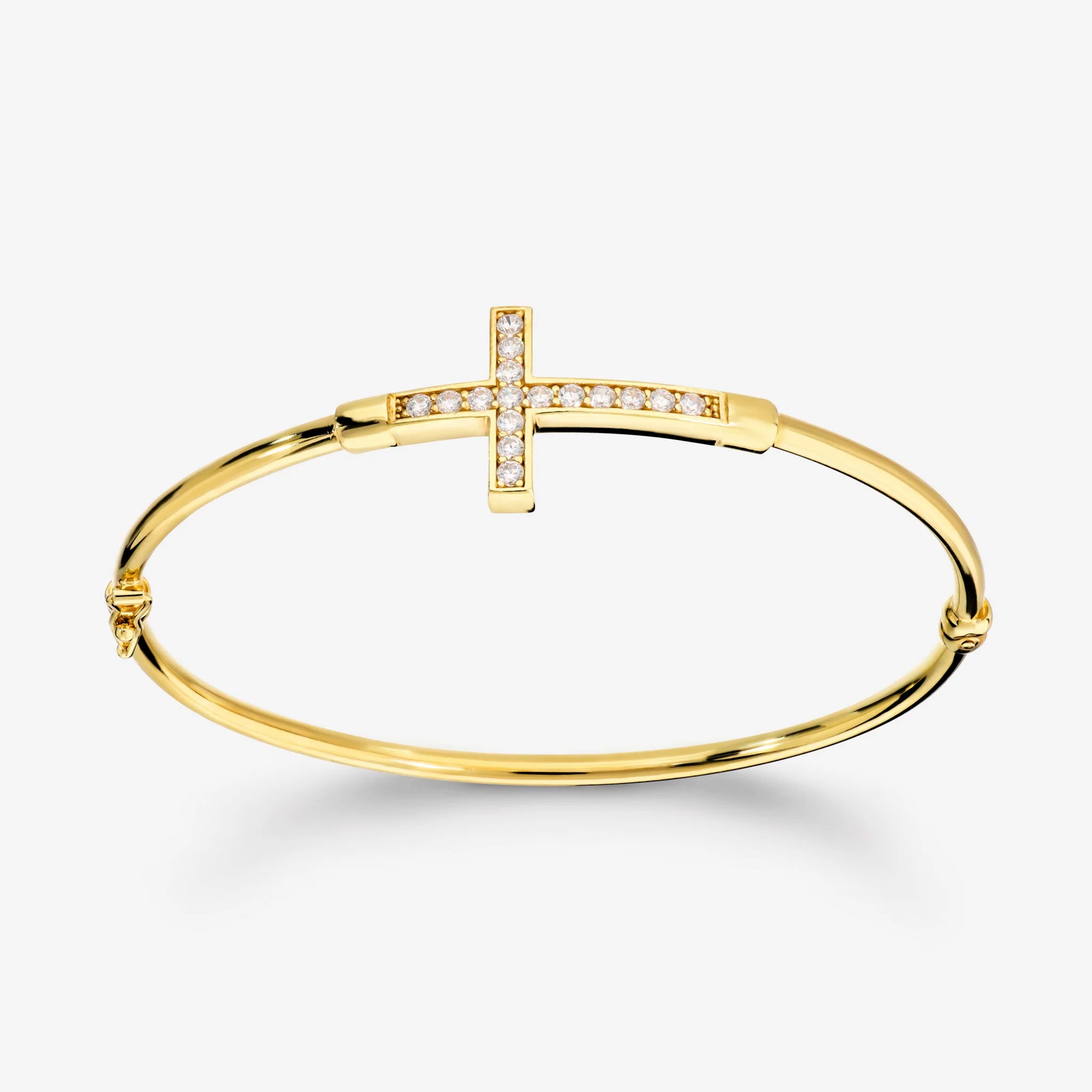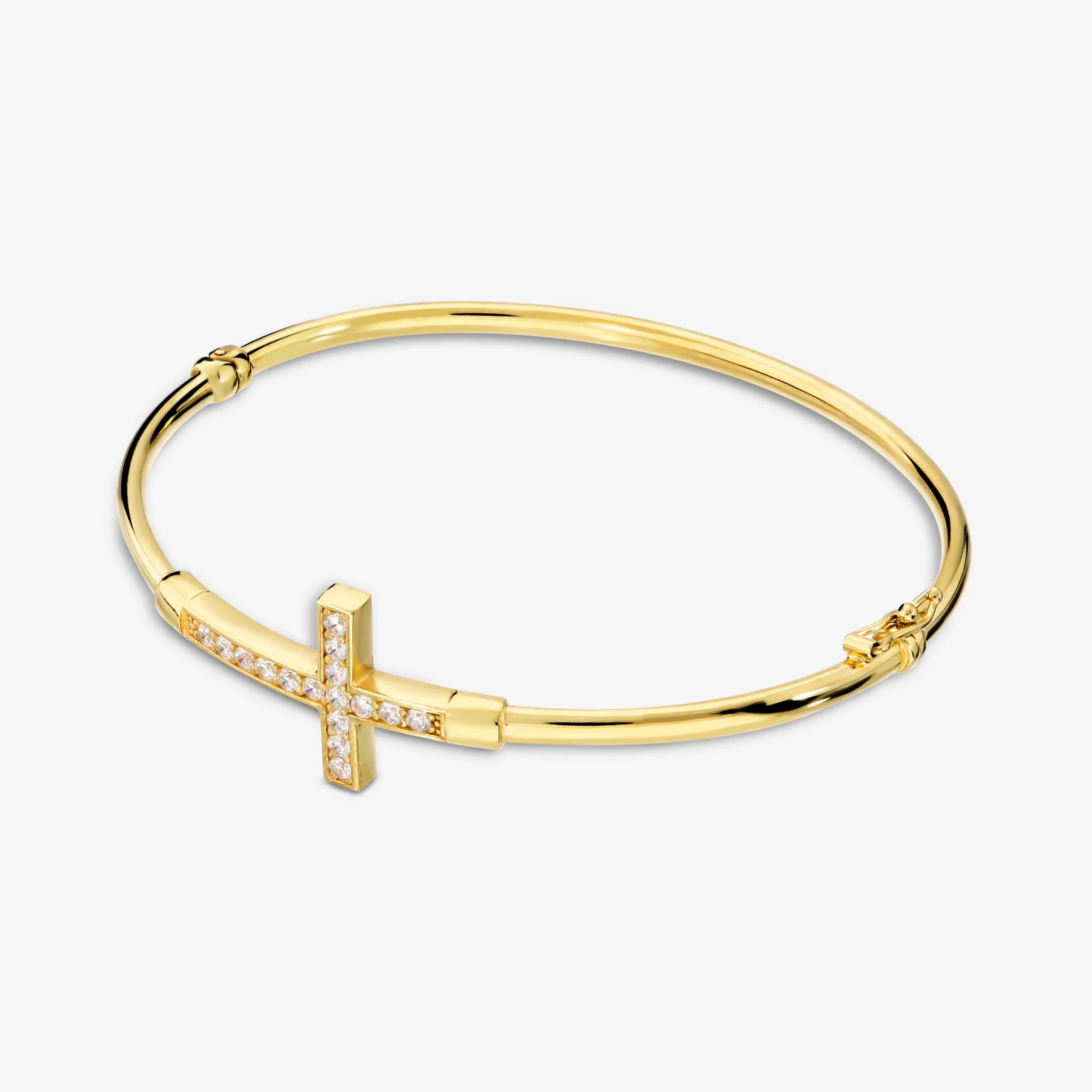 Bracelet rigide en argent 925 plaqué or jaune 18Kt avec croix en zircon cubique