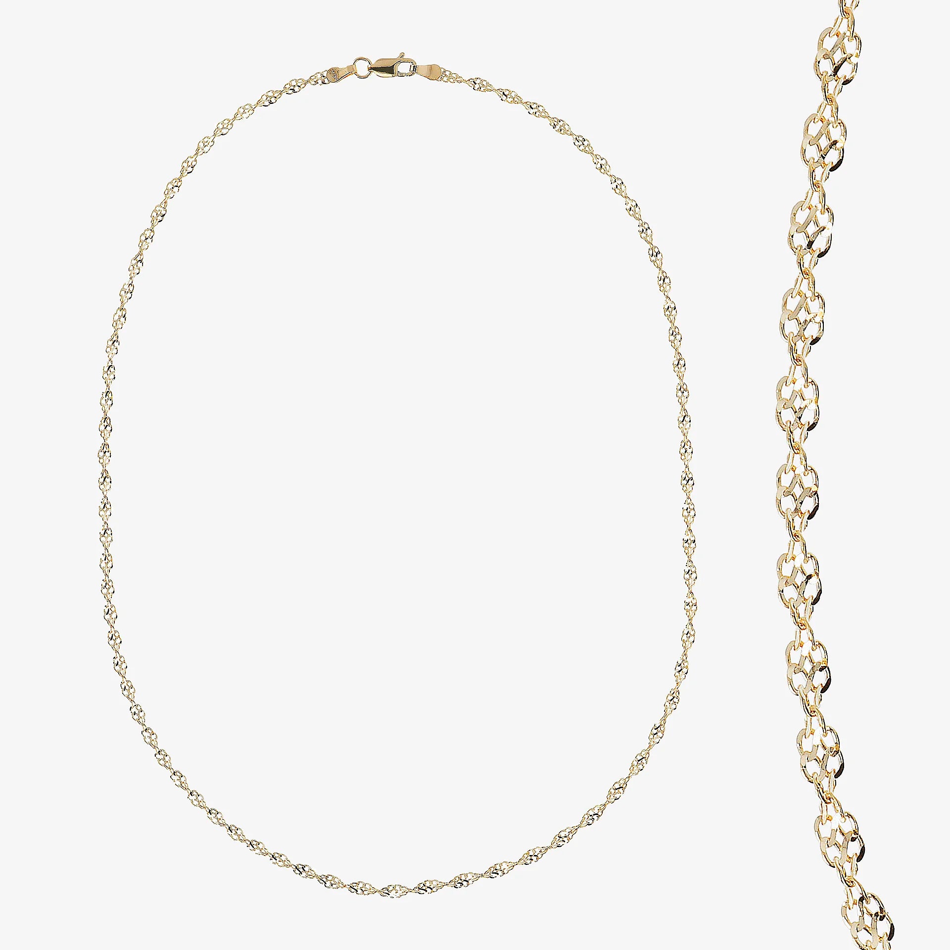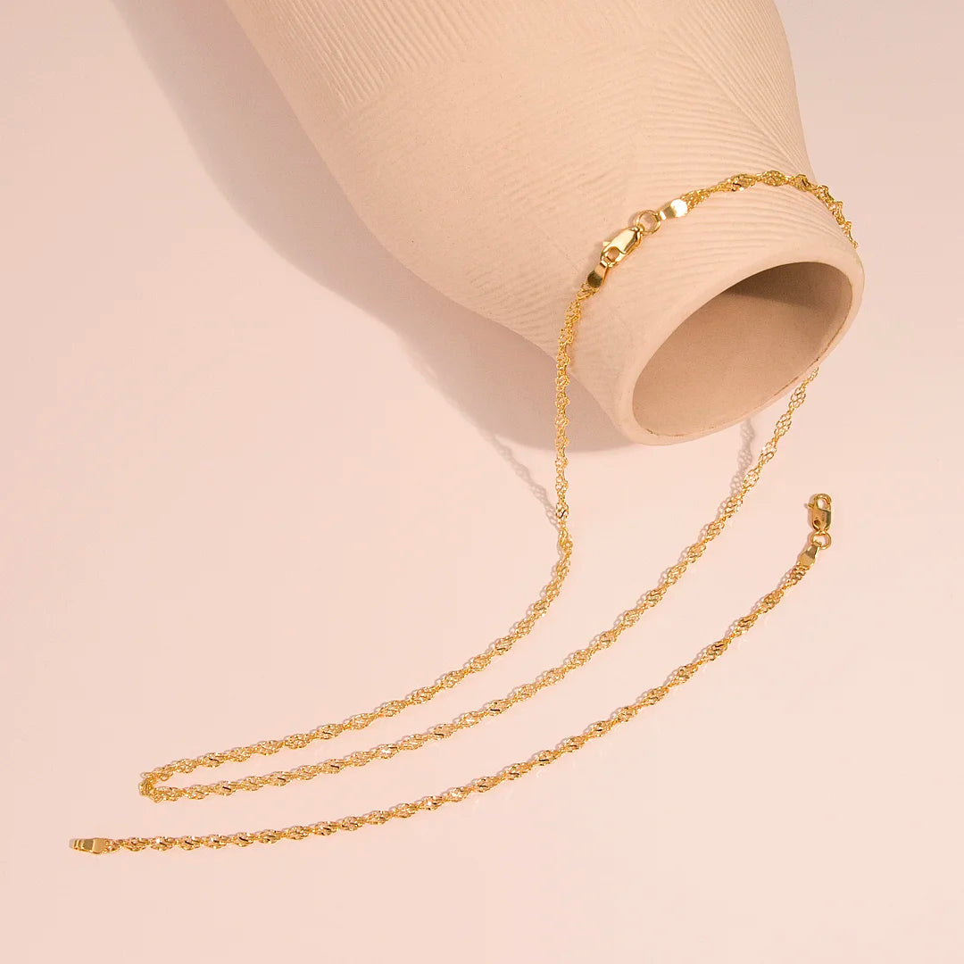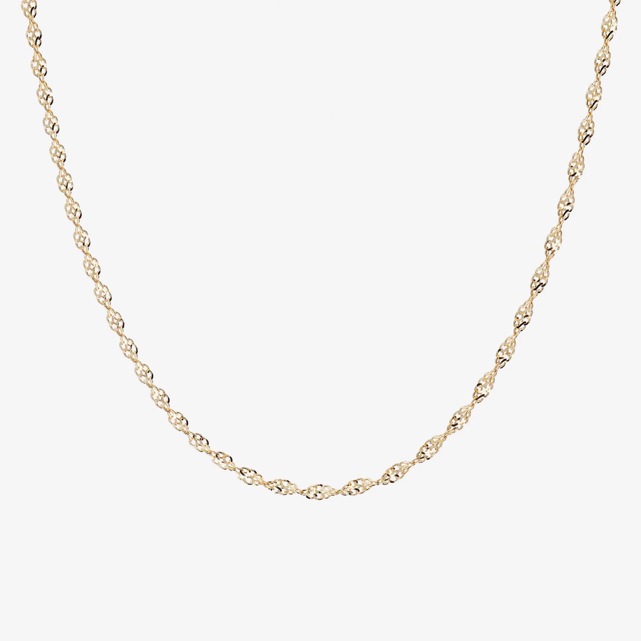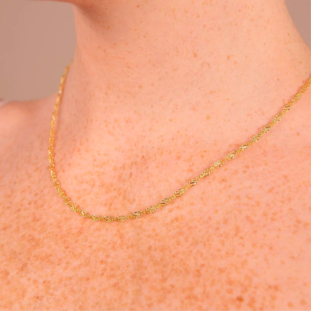 Le long collier à maillons singapour en or 9 carats est un classique intemporel. Entièrement conçu et fabriqué en Italie, ce pull a un design torsadé et double face qui rappelle une corde.