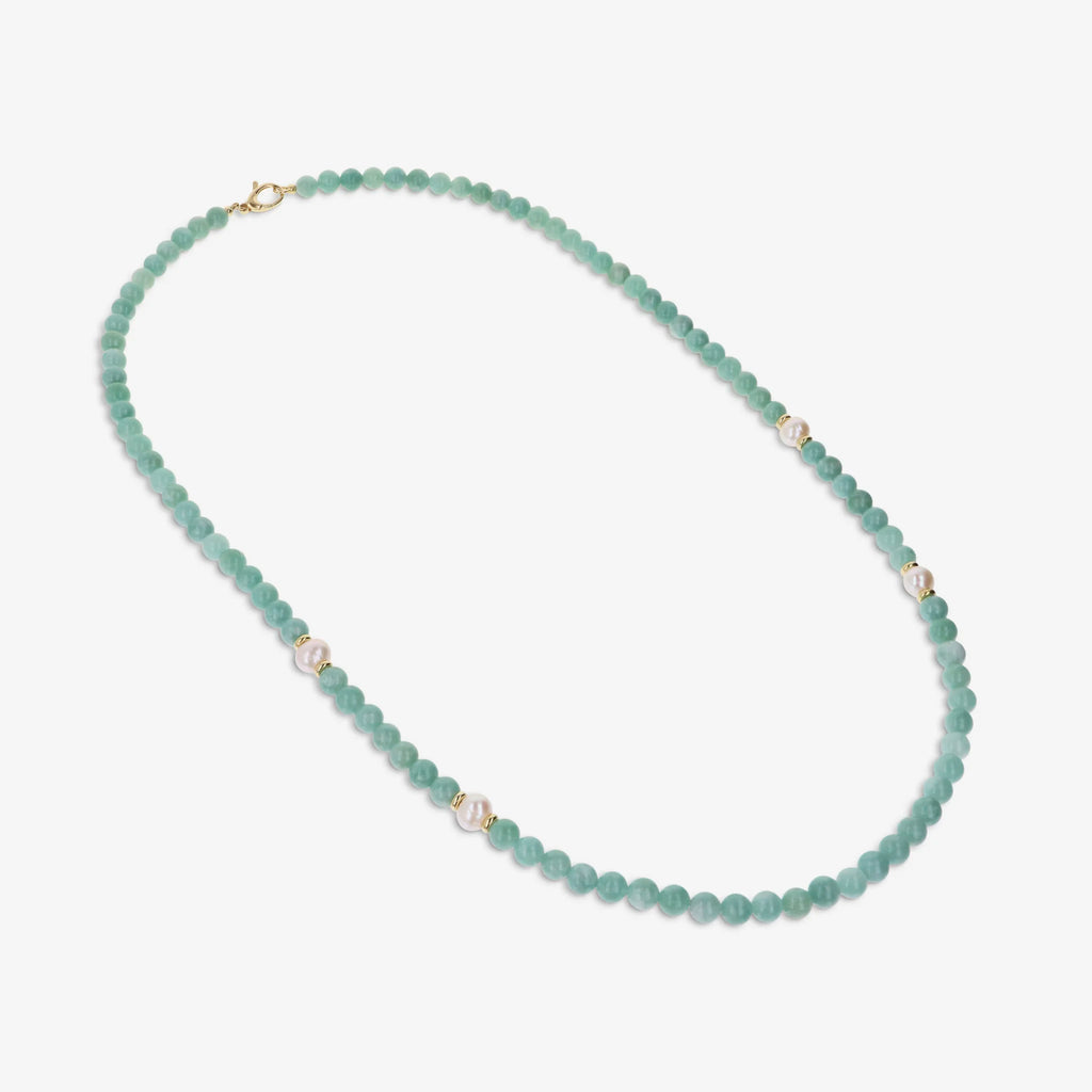 Collier Perlaviva de Milor orné de sphères en pierre naturelle, quartzite verte et de quatre perles de culture d'eau douce blanches de haute qualité de forme semi-ronde d'un diamètre d'environ 9/10 mm. Fermoir mousqueton en argent 925 doré à l'or fin 18ct.
