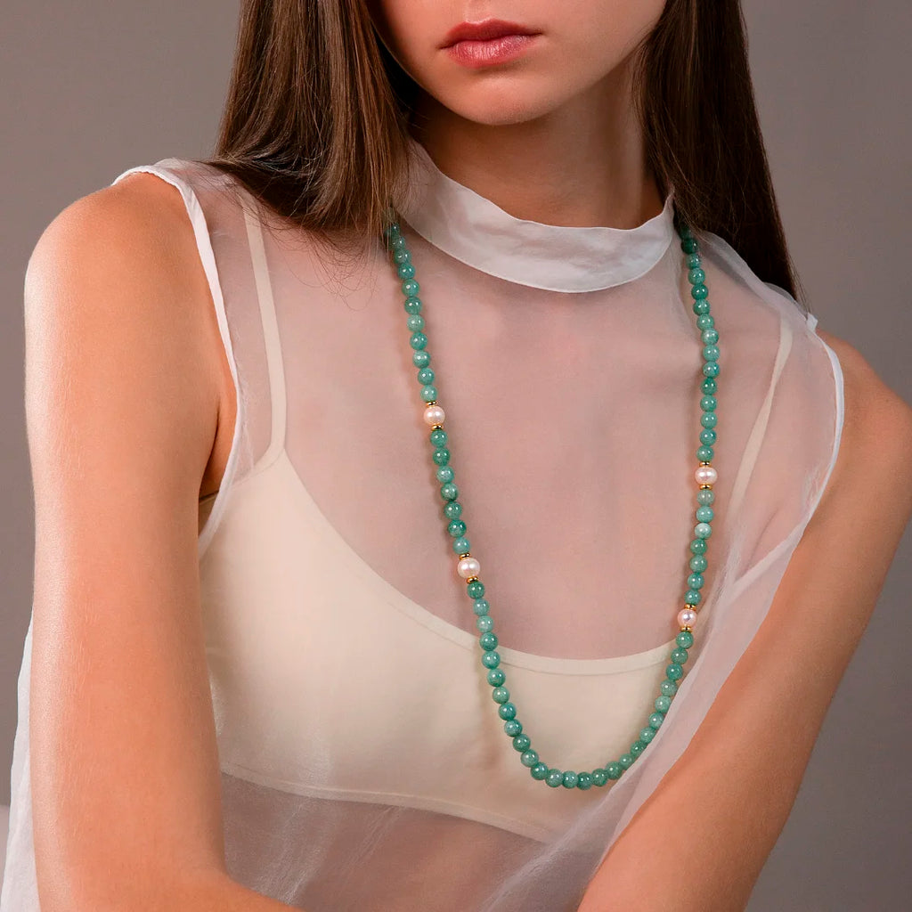 Collier Sautoir avec Quartzite Verte et Perles d'Eau Douce Blanches Ø 9/10 mm en Argent 925 doré à l'or fin 18ct
