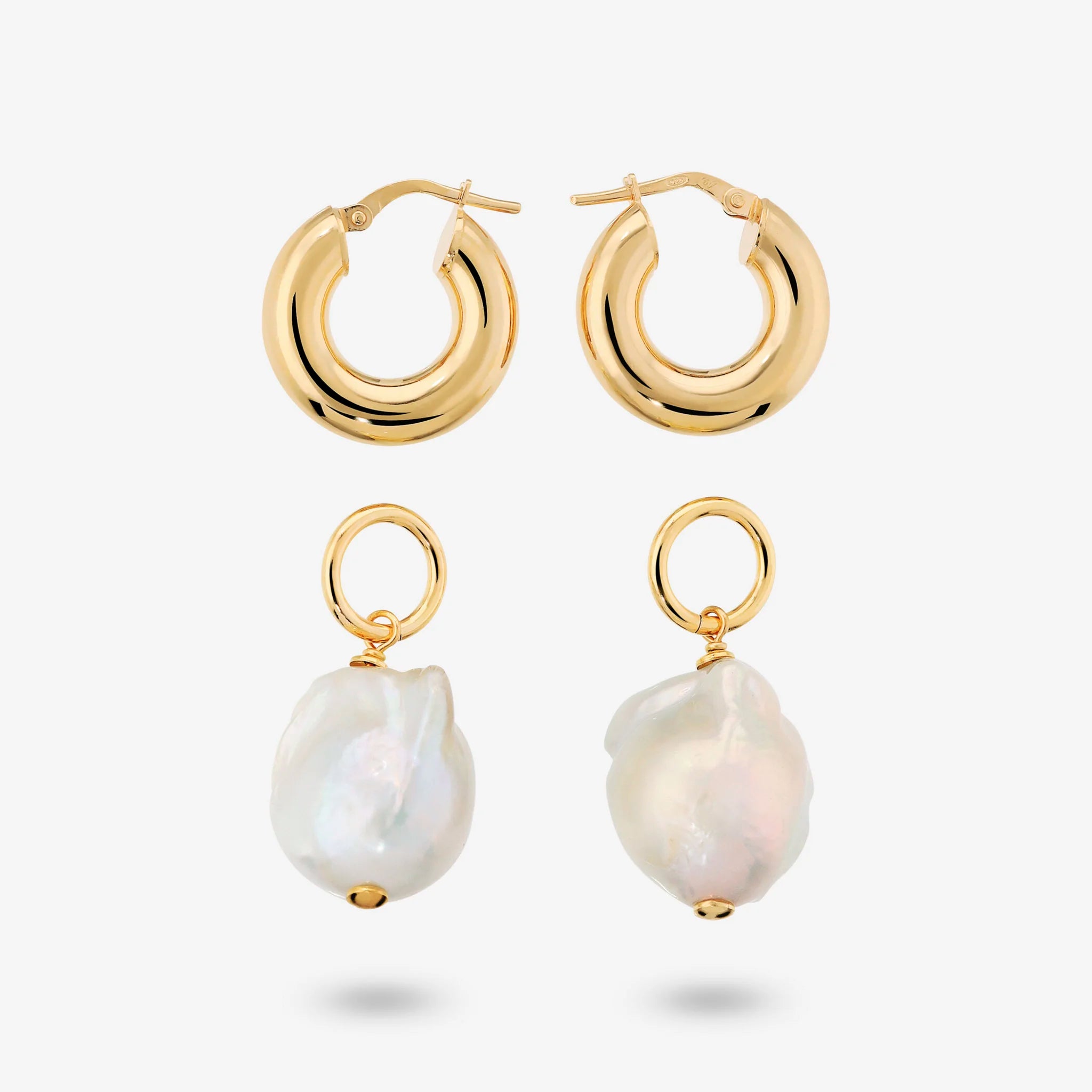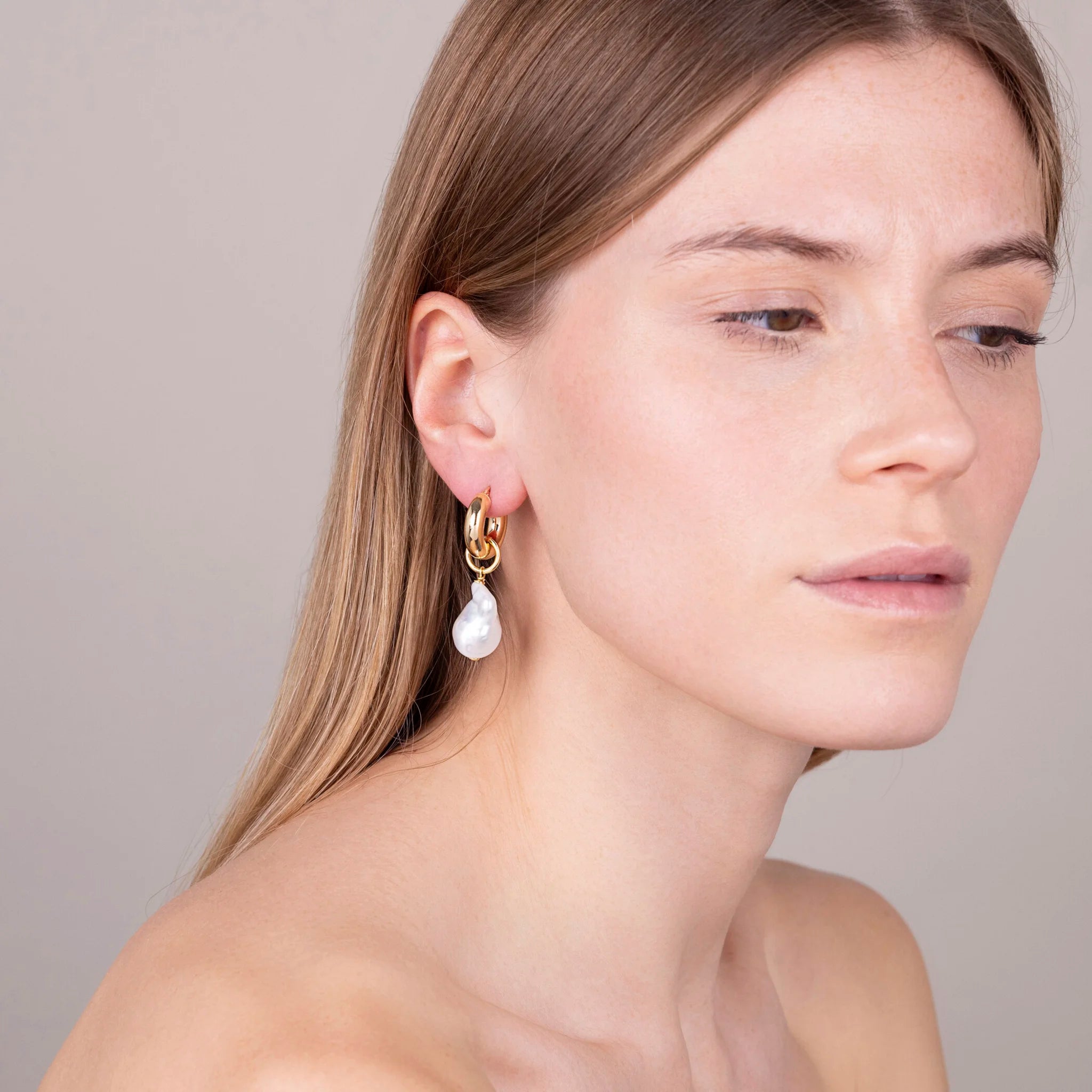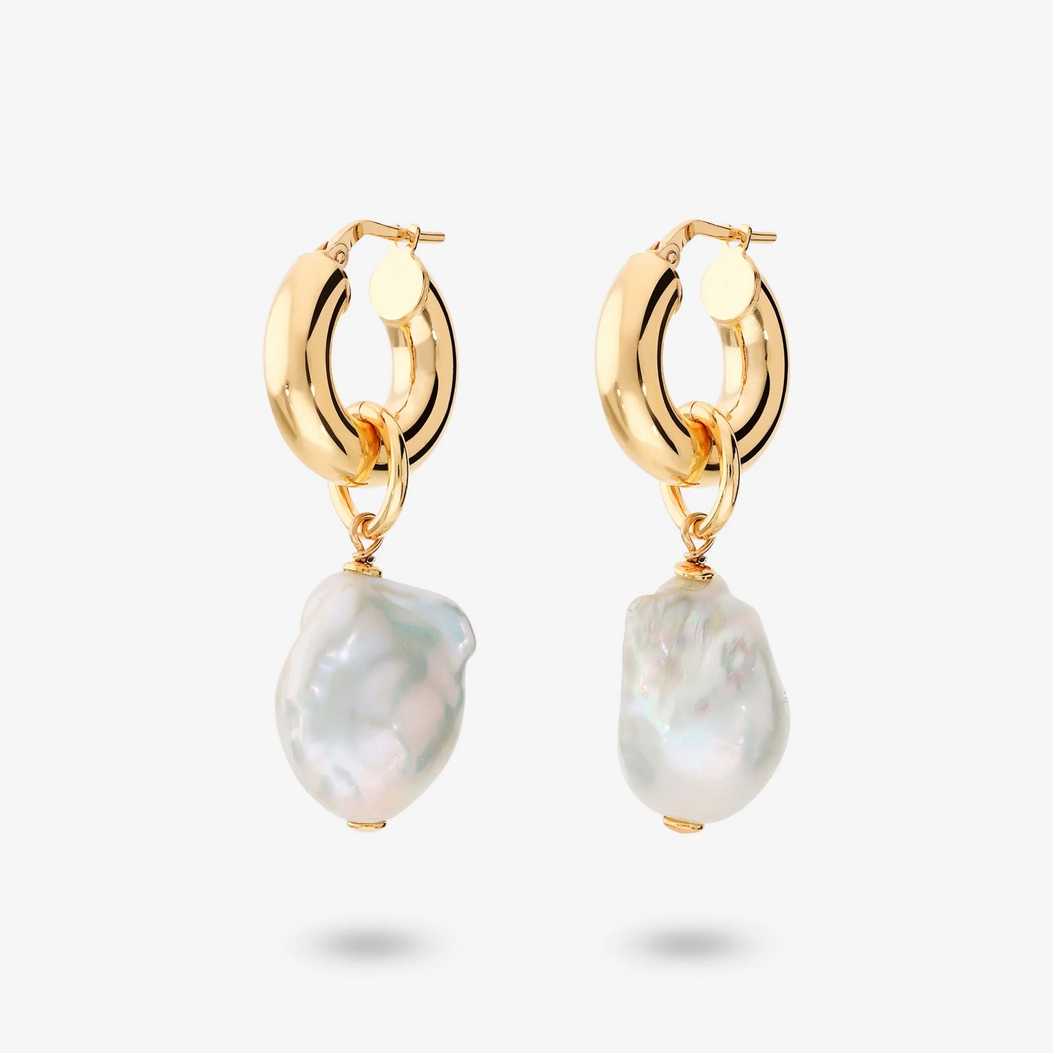 Boucles d'oreilles créoles en Argent 925 plaqué Or Jaune 18Kt avec des Perles Scaramazze Blanches d'Eau Douce 18x12 mm