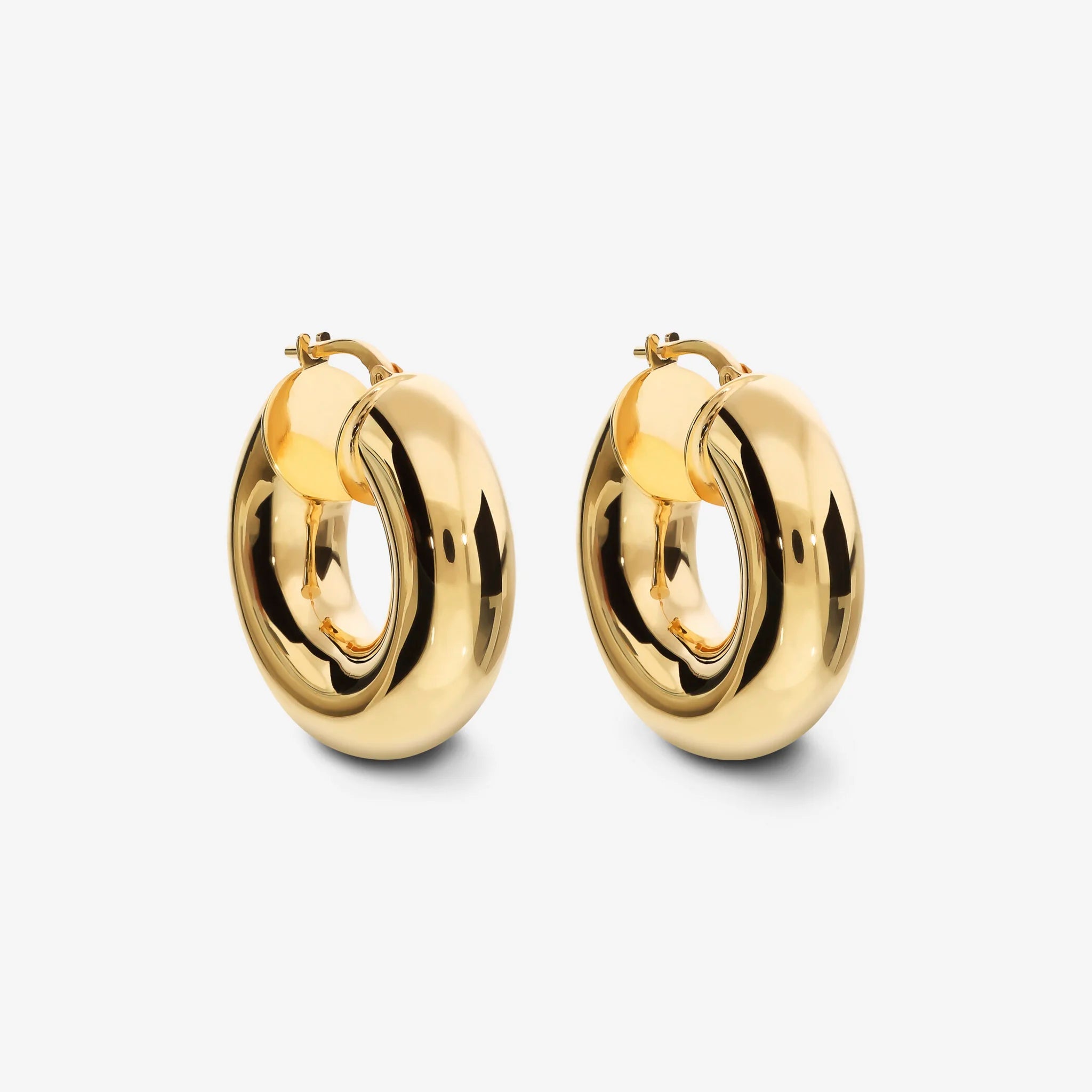 Boucles d'oreilles créoles maxi en Argent 925 plaqué Or jaune 18kt. Finition brillante. Épaisseur 8 mm. Diamètre extérieur 2,5 cm. Fermeture à baïonnette.