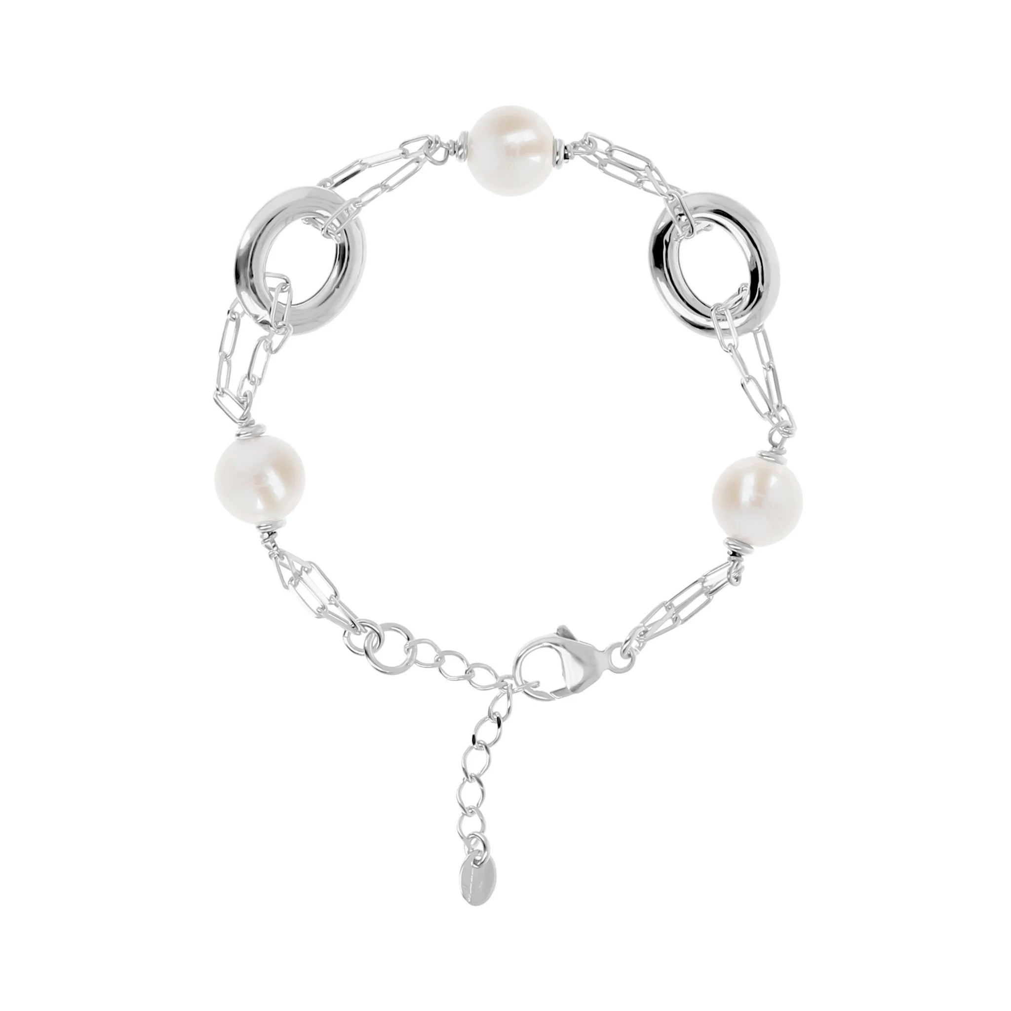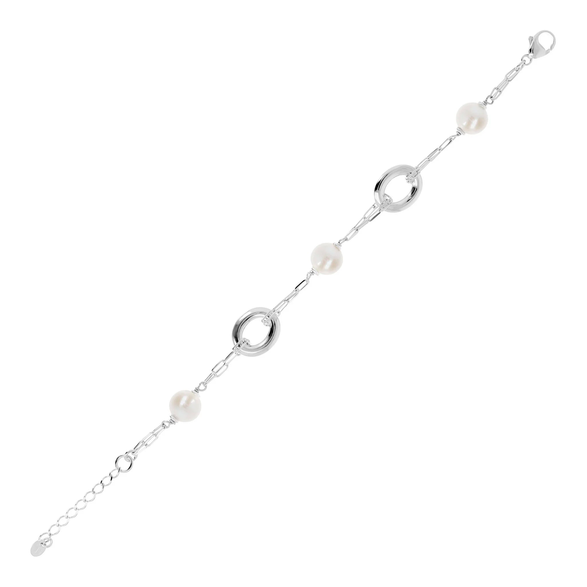 Bracelet en argent 925 plaqué or blanc 18 carats, avec chaîne forzatina agrémentée de deux maillons ovales et de trois perles de culture d'eau douce blanches. Longueur 18+3,5 cm d'extension. Fermoir mousqueton.