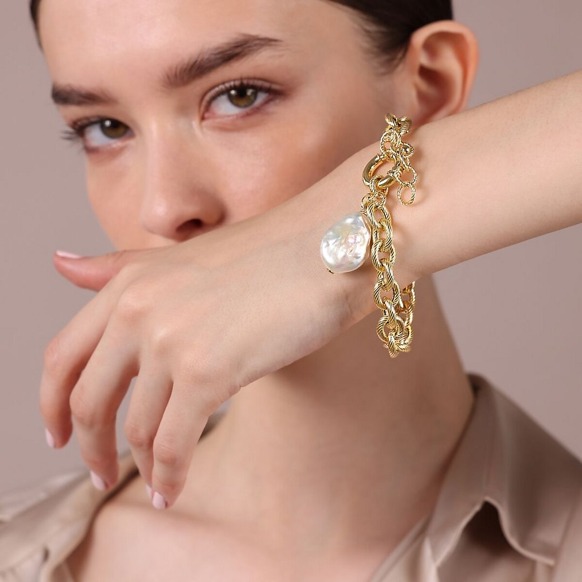 Bracelet en Argent 925 Plaqué Or Jaune 18 Carats avec Perle Keshi d'eau Douce Blanche 17x20 mm