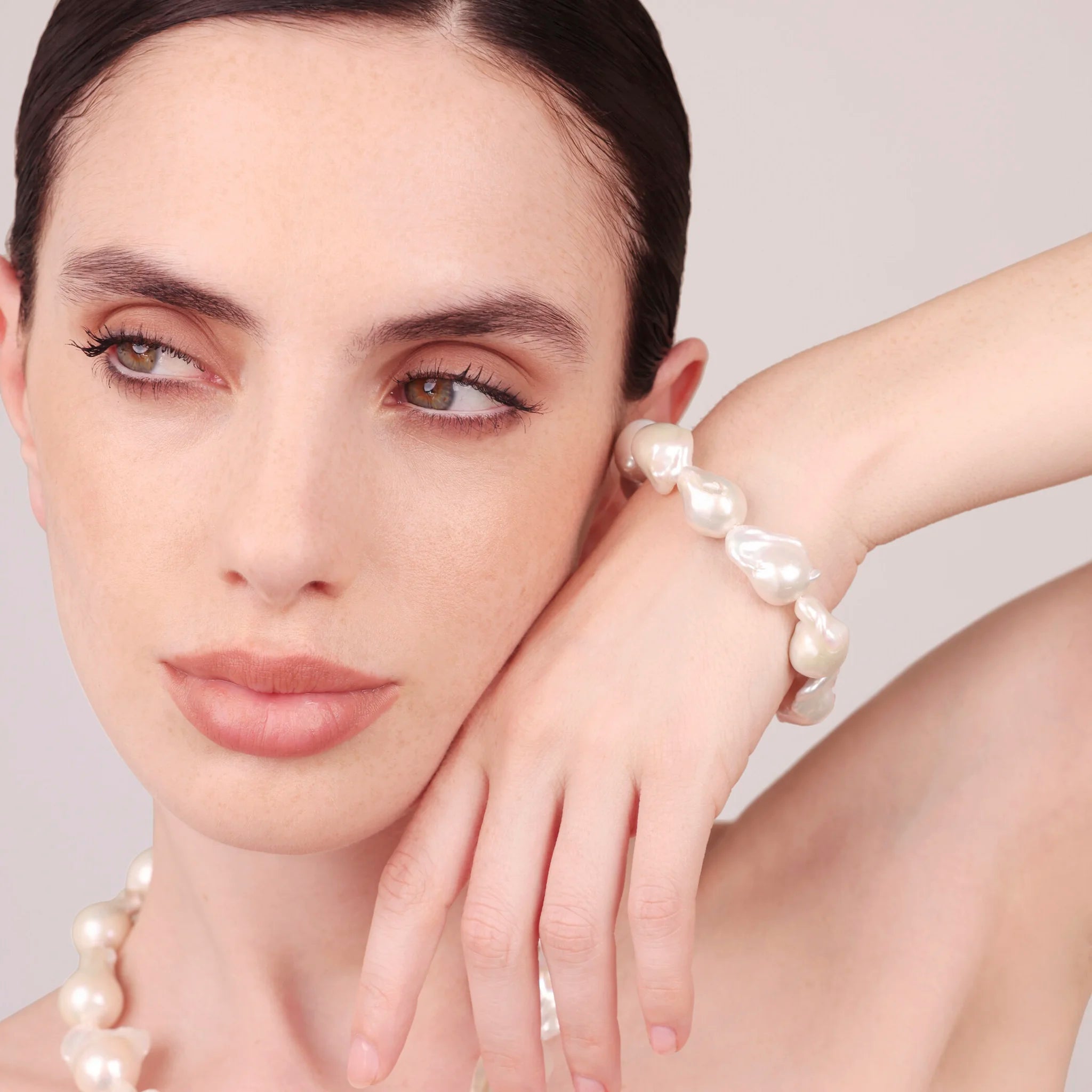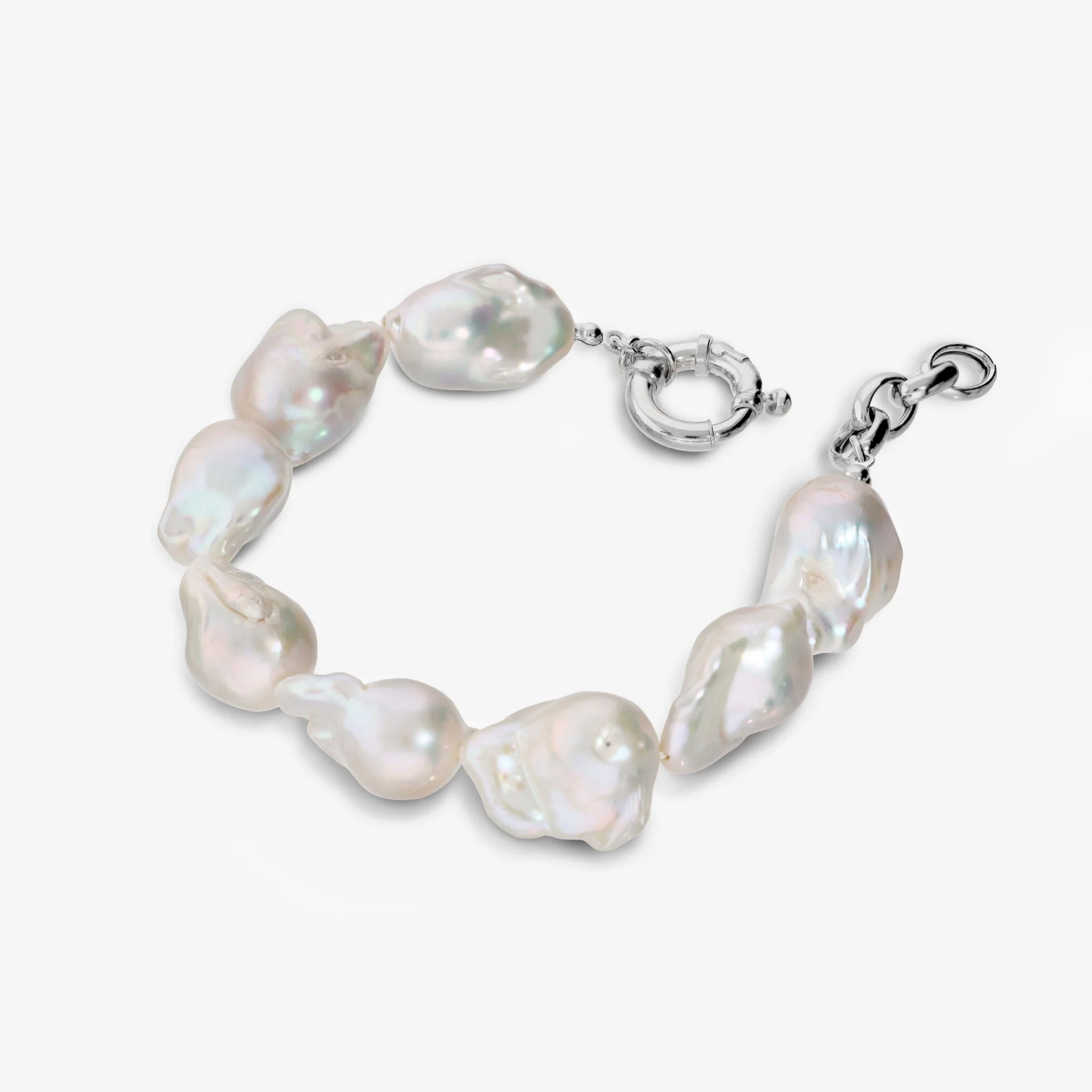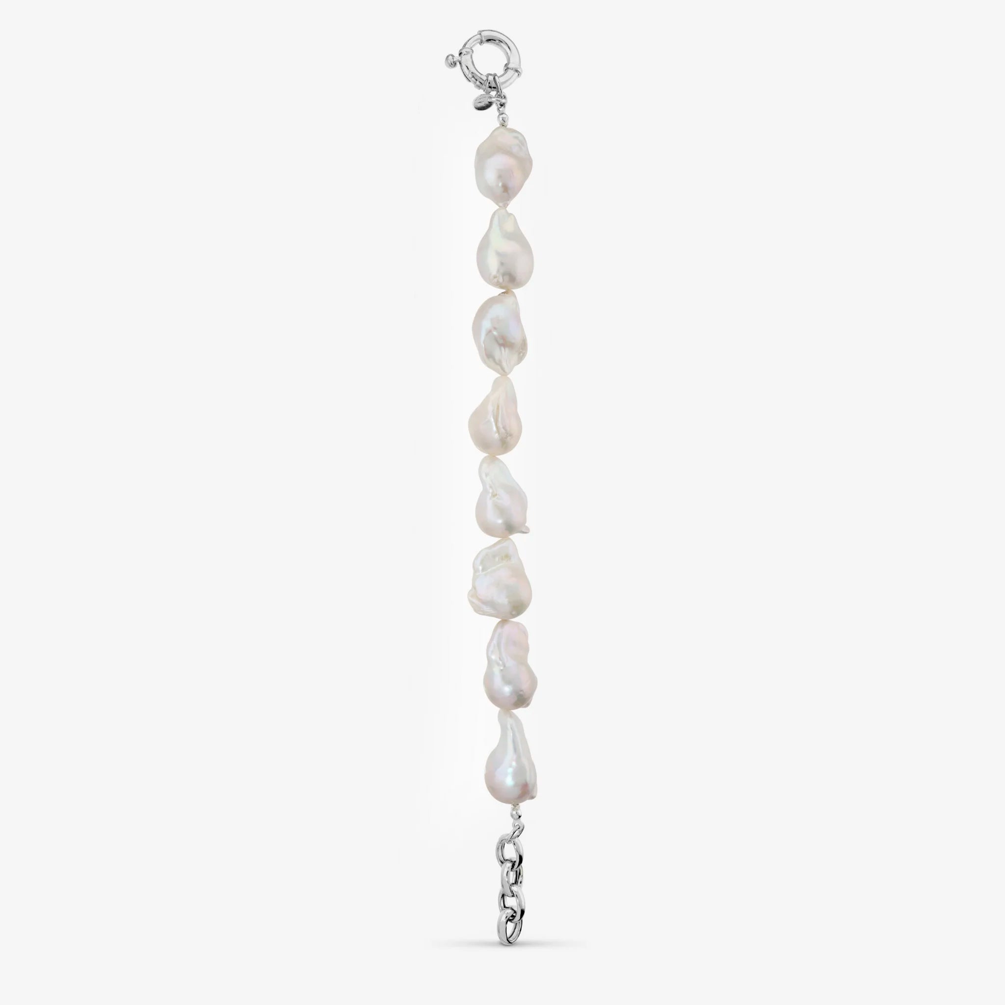 Bracelet de perles Scaramazze blanches d'eau douce cultivées, de forme irrégulière légèrement allongée et d'un diamètre d'environ 13/14 mm. Longueur 19,5 + 2,5 cm d'extension. Fermoir à anneau ressort en Argent 925 plaqué Or 18kt.