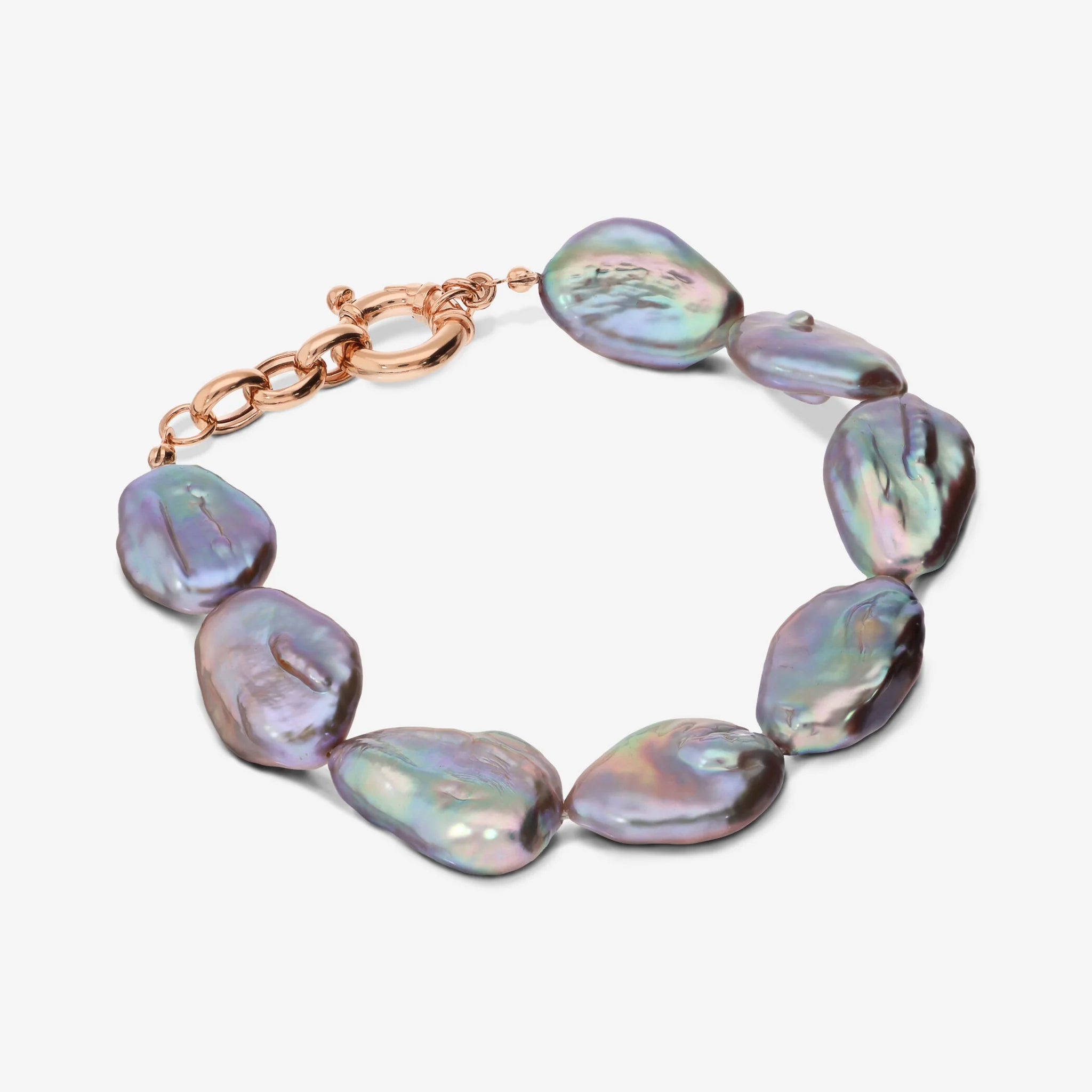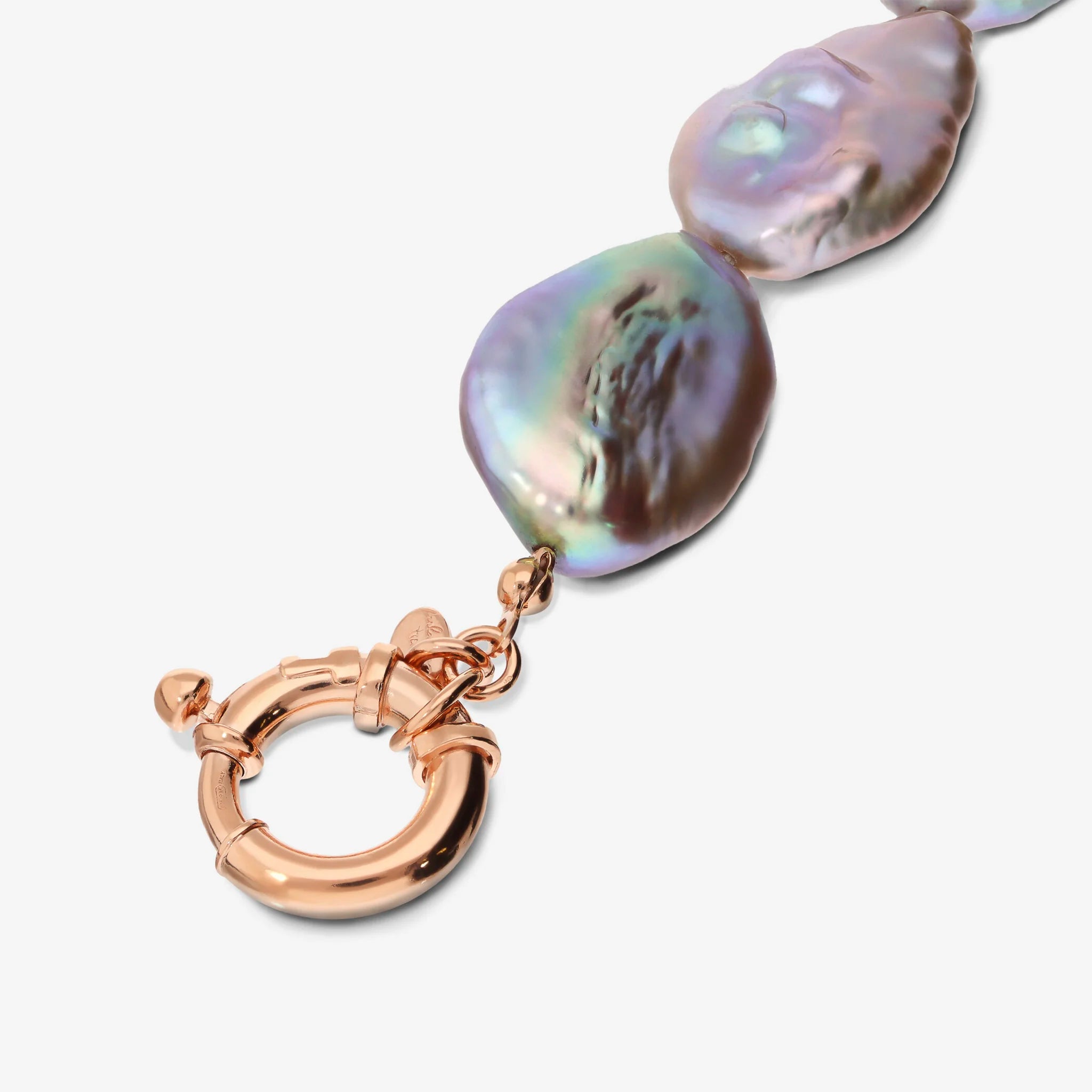Bracelet de perles de culture d'eau douce Paon baroque Coin d'un diamètre d'environ 17 mm. Longueur 21+2 cm de rallonge. Fermoir à ressort en argent 925 plaqué or rose 18 carats.