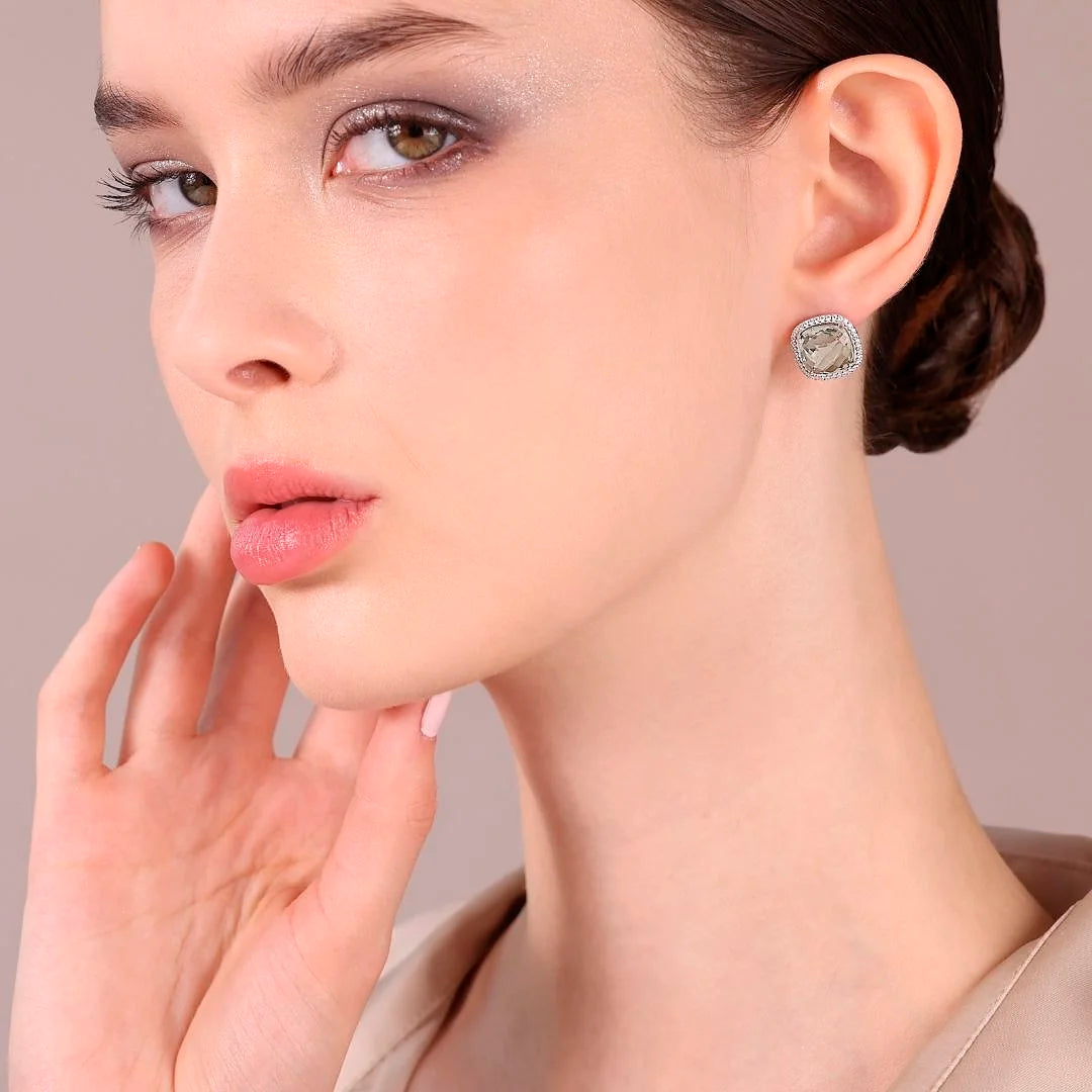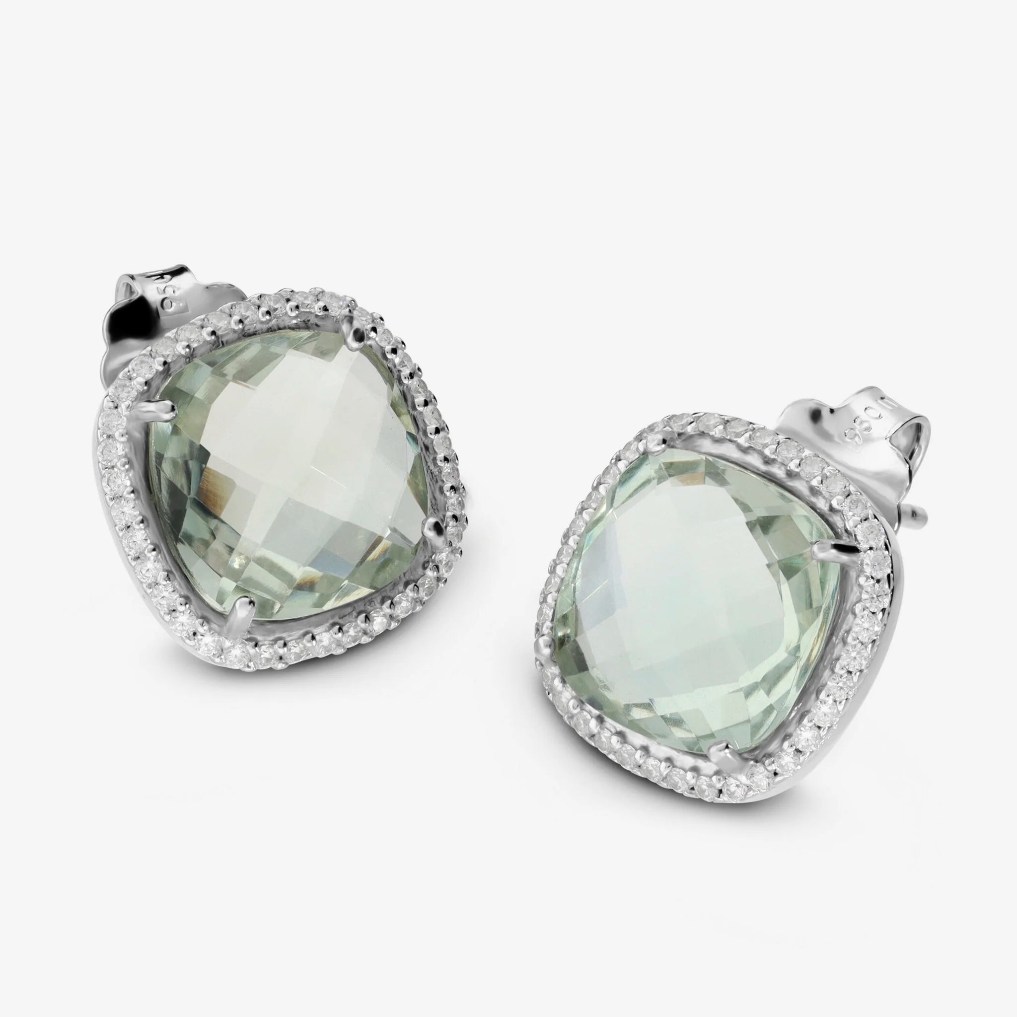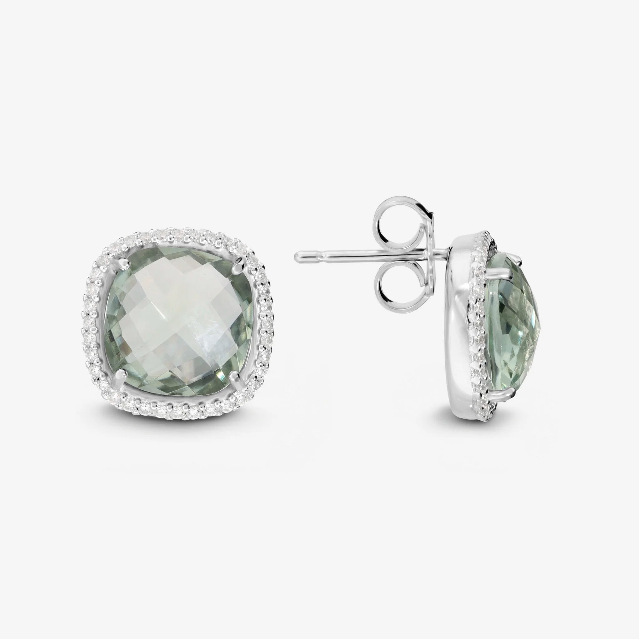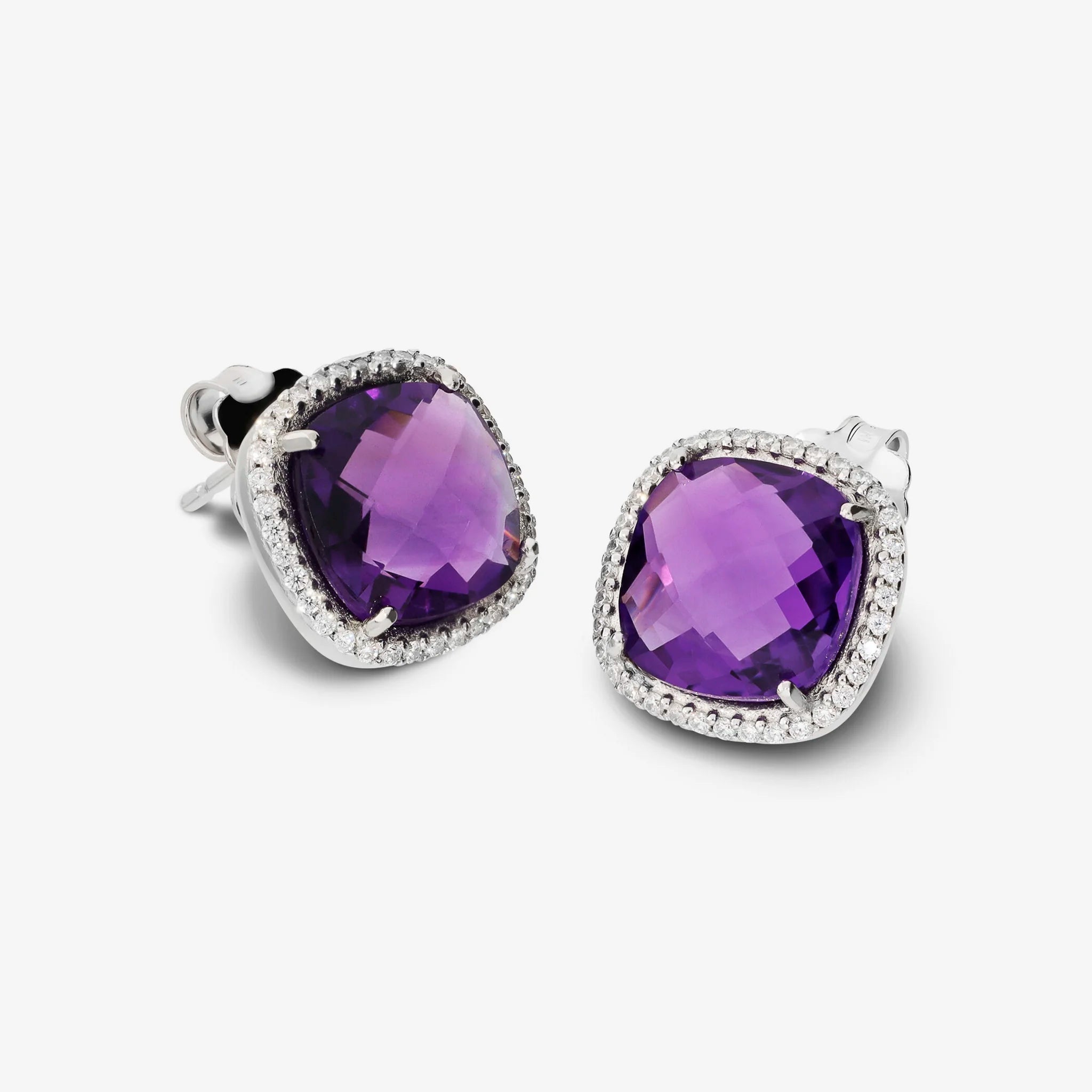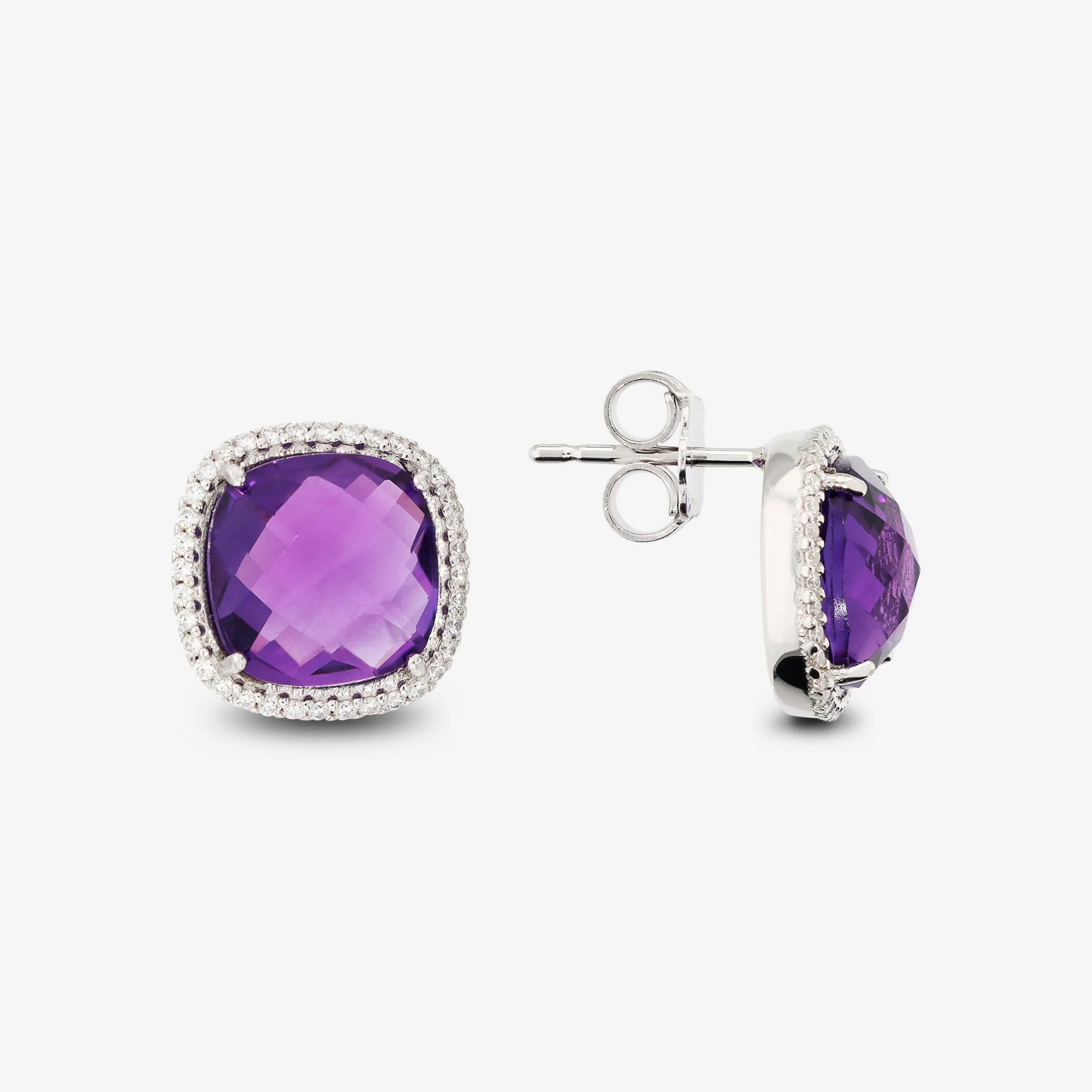 Boucles d'oreilles lobe en Argent 950 Plaqué Platine, avec améthyste facettée (10x10 mm) égale à 7 ct entourée d'un pavé de zircones cubiques, qualité 'Lumineux', égale à 0,35 ct. Fermeture épingle et papillon.