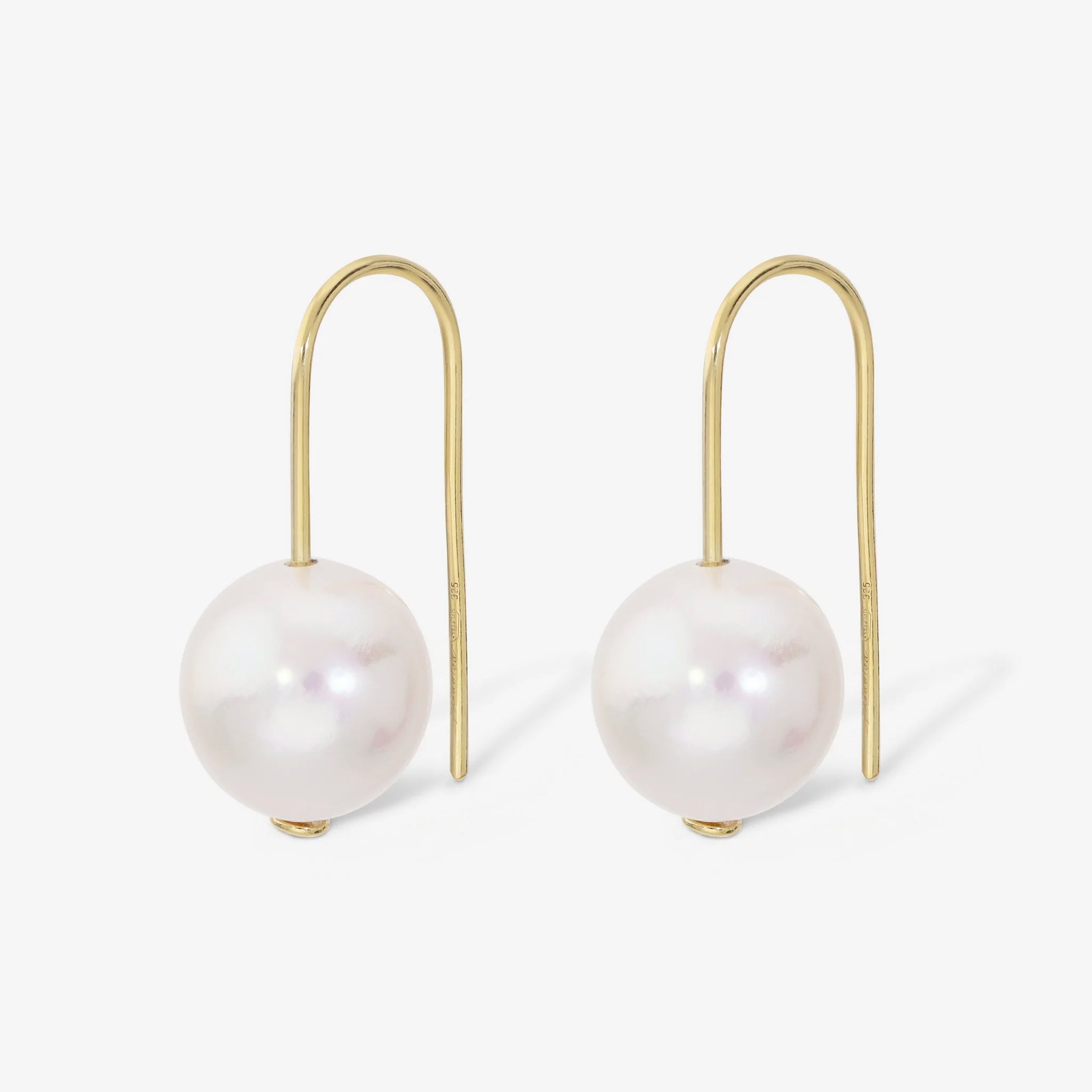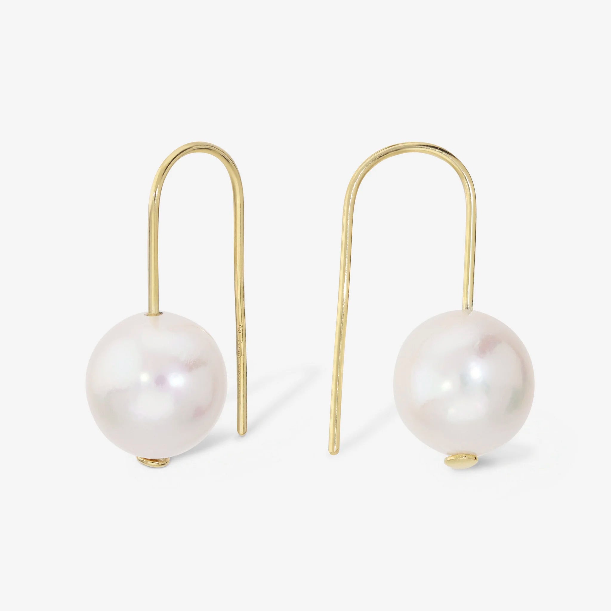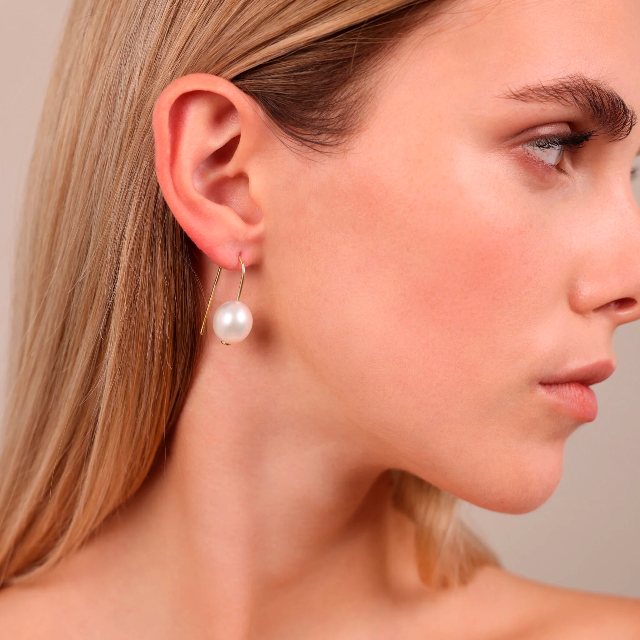 Boucles d'oreilles pendantes en Argent 925, plaqué Or jaune 18kt avec perles Ming blanches cultivées en eau douce d'un diamètre d'environ 11/13 mm. Longueur 2,8 cm. Le fil rigide de la boucle d'oreille sert également de fermeture. Bijou appartenant à l'édition spéciale 'Perlaviva Couture'.