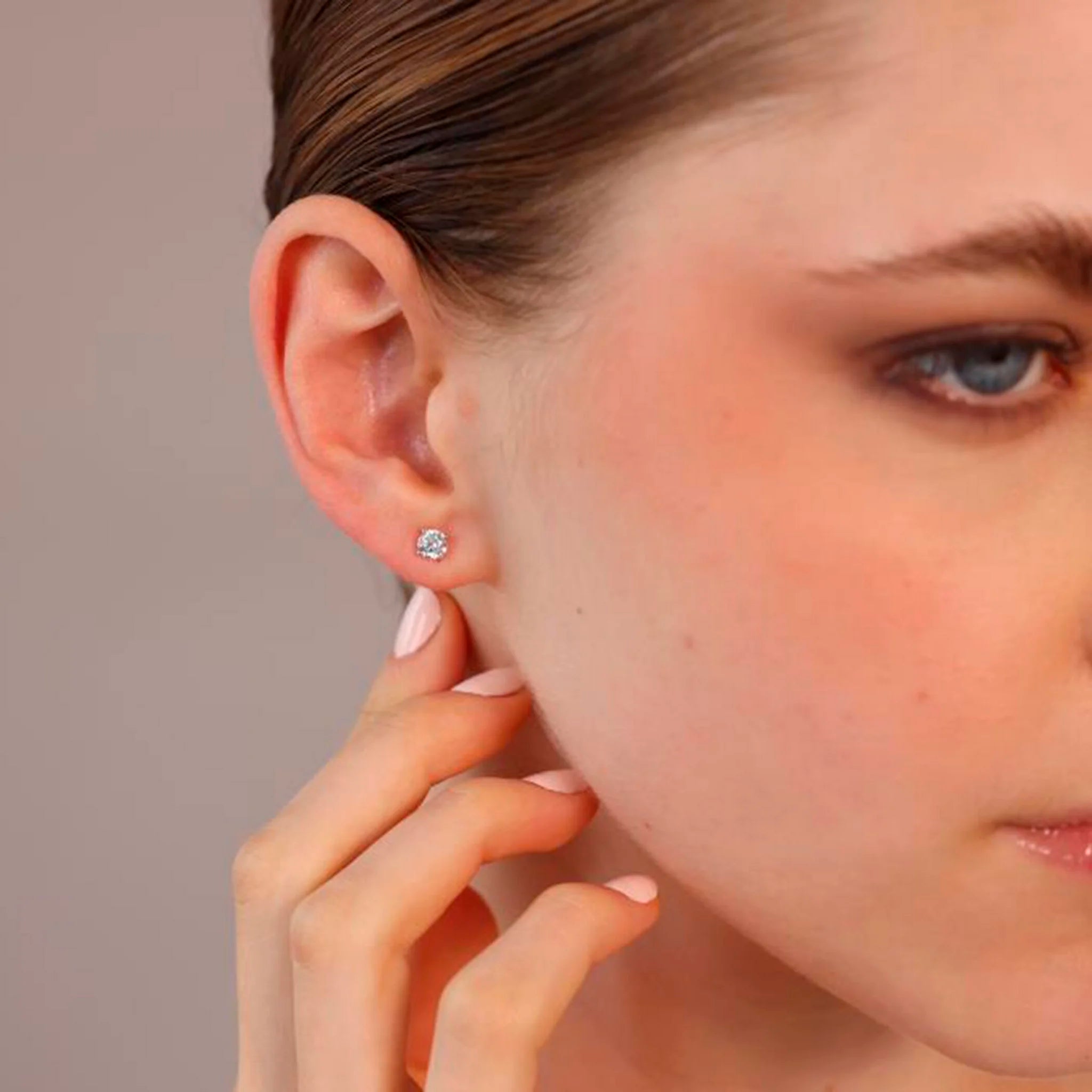 Boucles d'oreilles lobe en or blanc 375/1000 avec deux diamants de synthèse (0,8ct). Cadre rond à quatre griffes. Fermeture épingle et papillon.