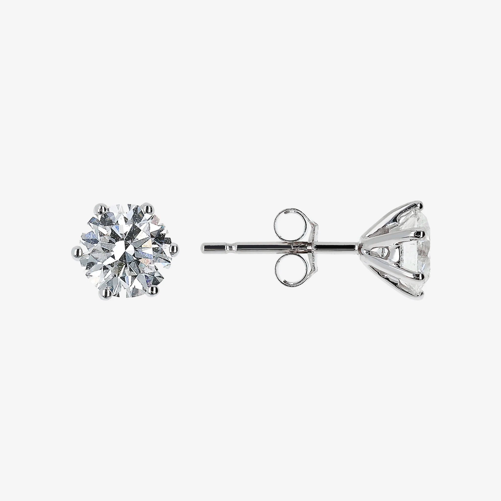 Boucles d'oreilles lobe en or blanc 375/1000 serties de deux diamants de synthèse (poids total 1ct). Cadre rond à six griffes. Fermeture épingle et papillon.