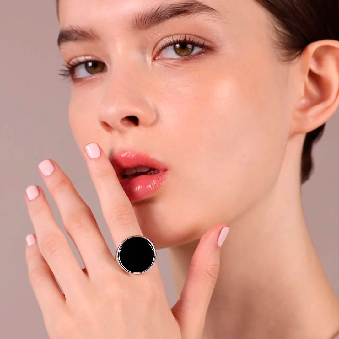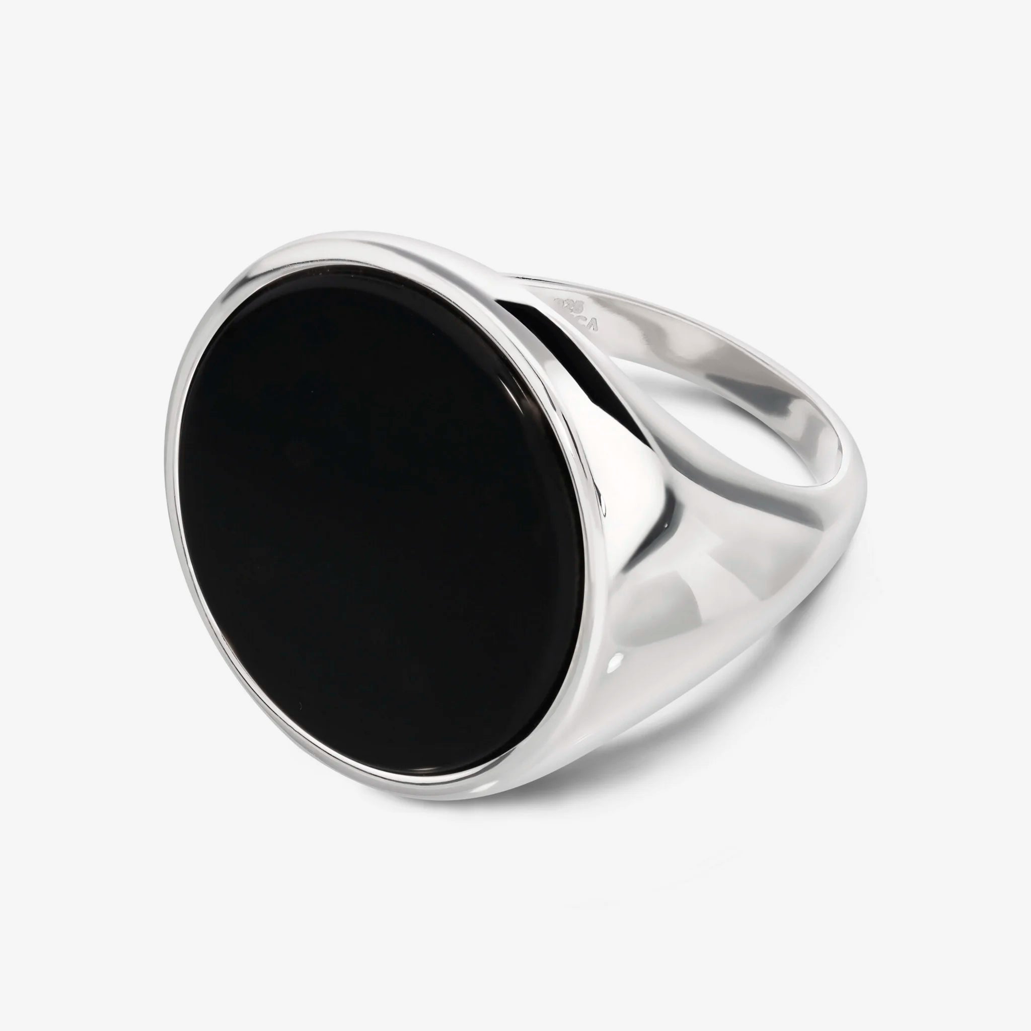 Anello chevalier in Argento 925 placcato Platino impreziosito da una pietra naturale a disco (18 mm) in onice nero.