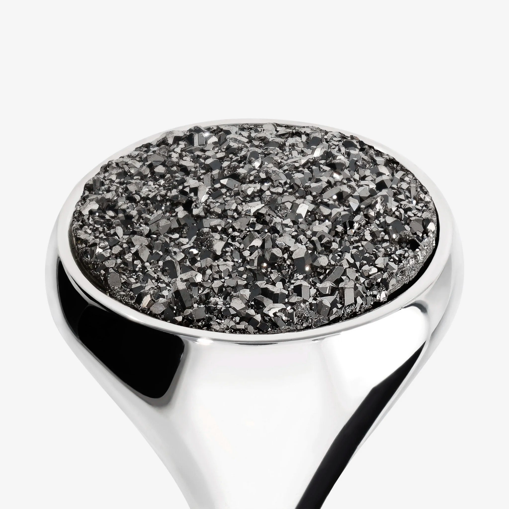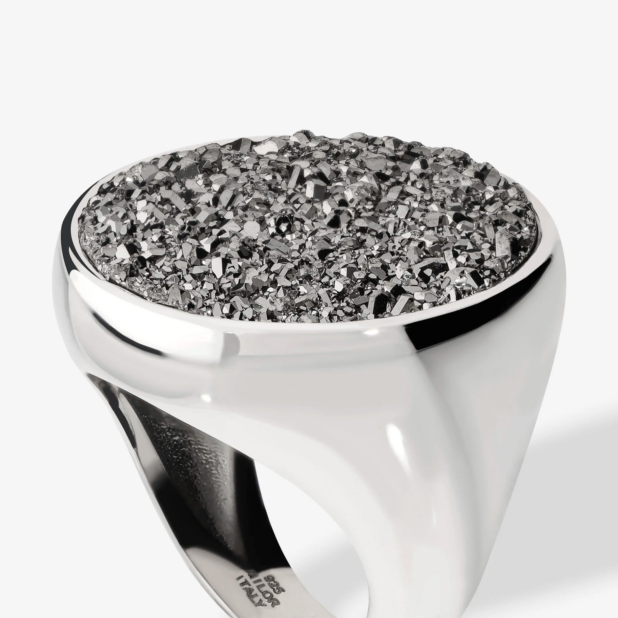 Anello cocktail in Argento 925, placcato Platino, con top (20 mm) impreziosito da drusite color platino. Finitura lucida.
