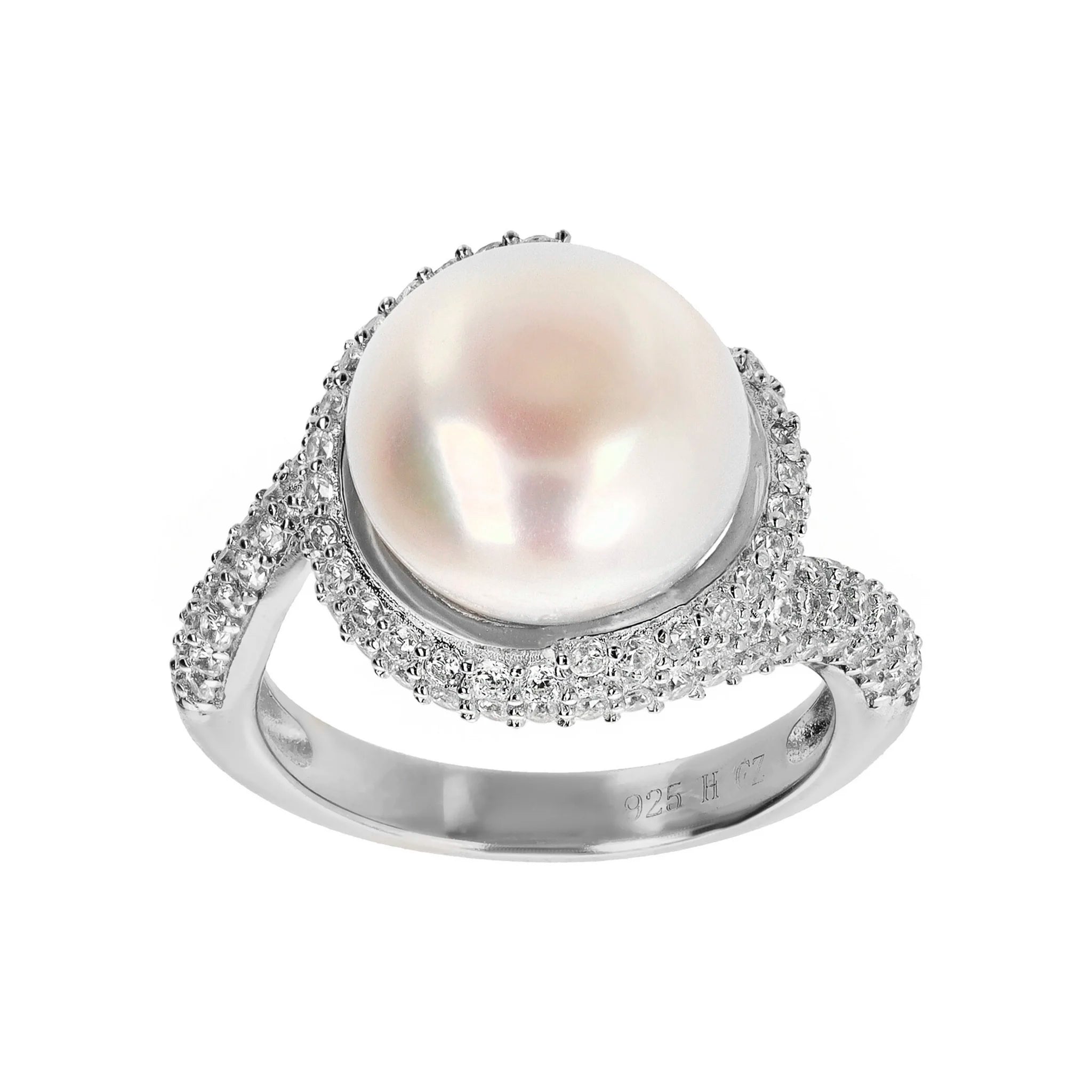 Anello Solitario in Argento 925 con Pavé in Cubic Zirconia e Perla a Bottone Bianca d'Acqua Dolce Ø 11/12 mm