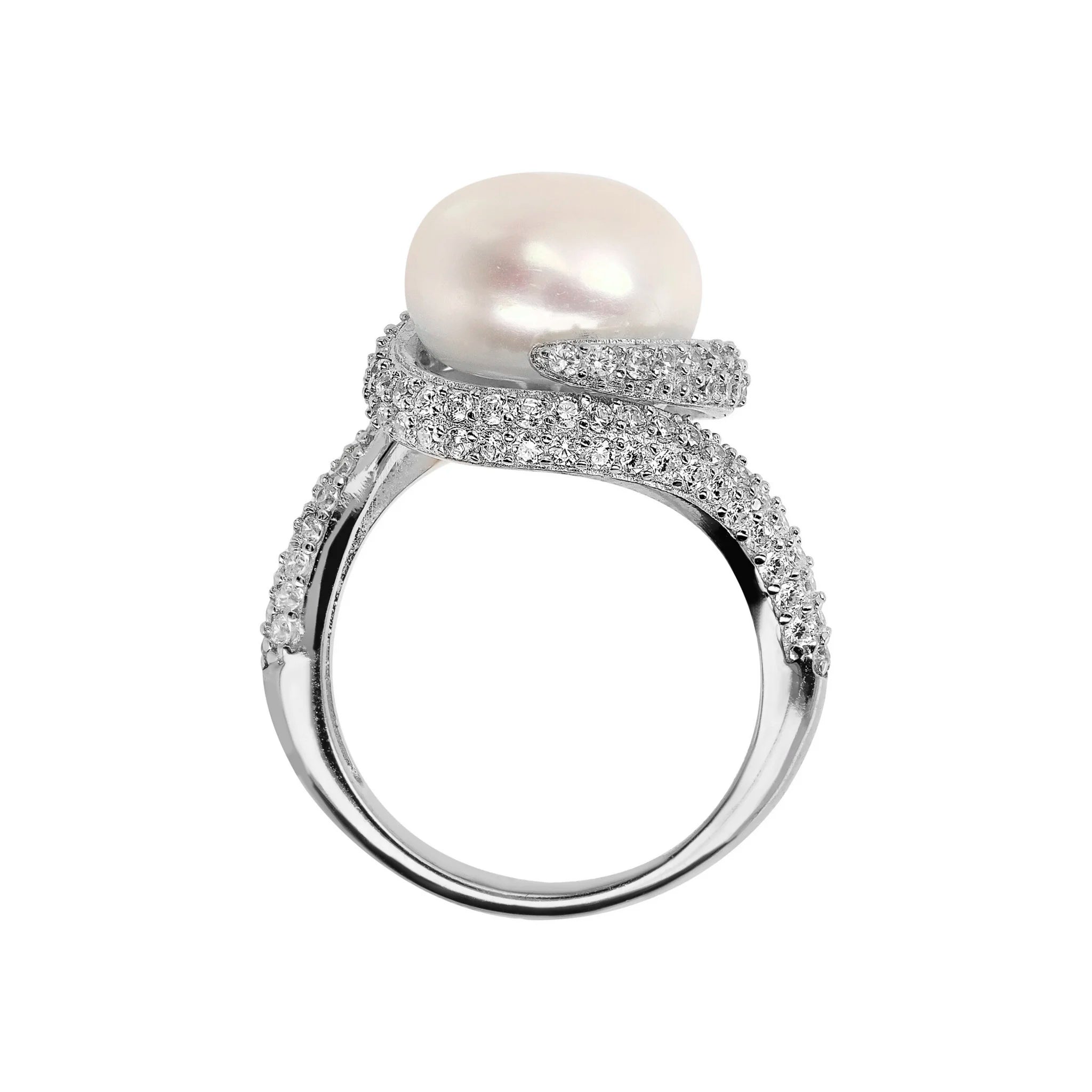 Anello solitario in Argento 925 dal design sinuoso con pavé di cubic zirconia, qualità 'Luminosa', pari a 0.84ct, e perla a bottone bianca coltivata d'acqua dolce con diametro di circa 11/12 mm.