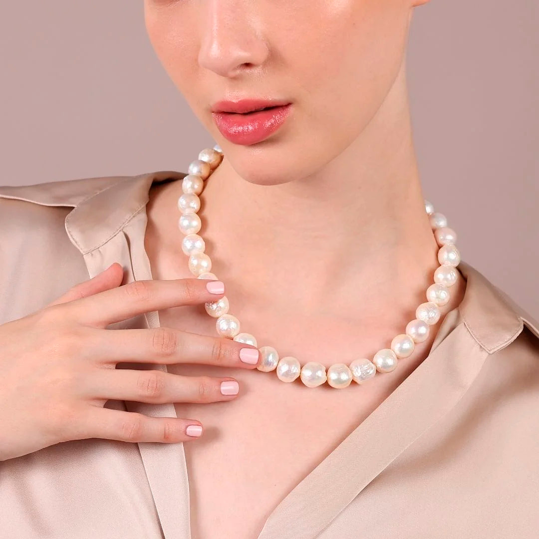 Collana girocollo con perle Ming Barocche coltivate d'acqua dolce bianche con diametro di circa 12/13 mm. Lunghezza 45 cm. Chiusura a moschettone in Argento 925 placcato Oro bianco 18kt.