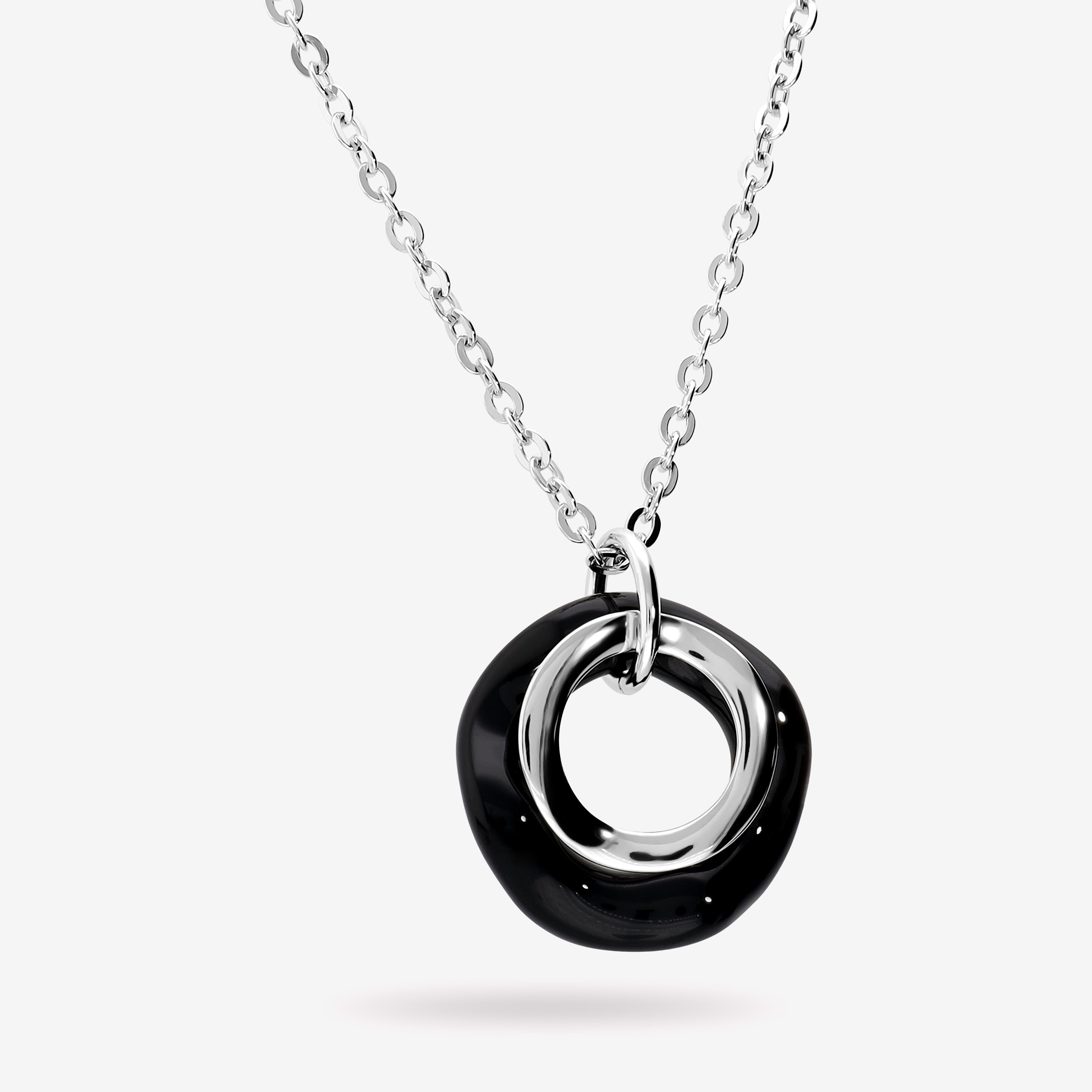 Collana in Argento 925 placcato Platino con Pendente a Doppio Cerchio Lucido e in Onice Nero